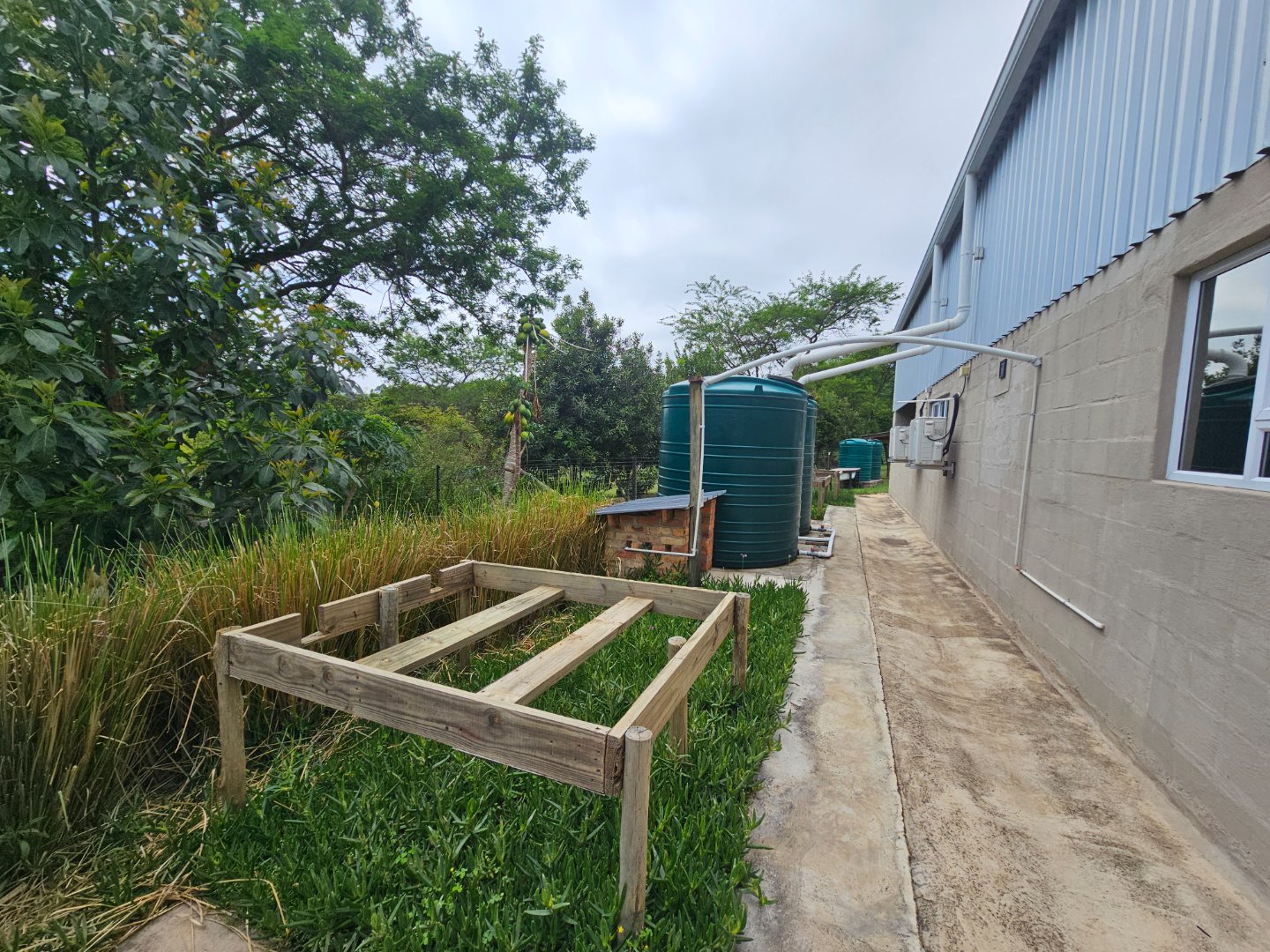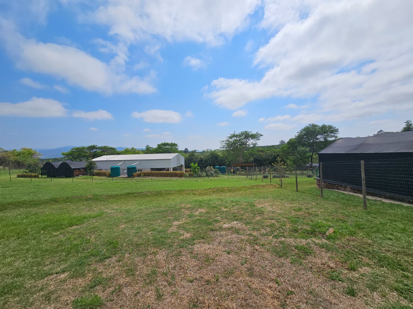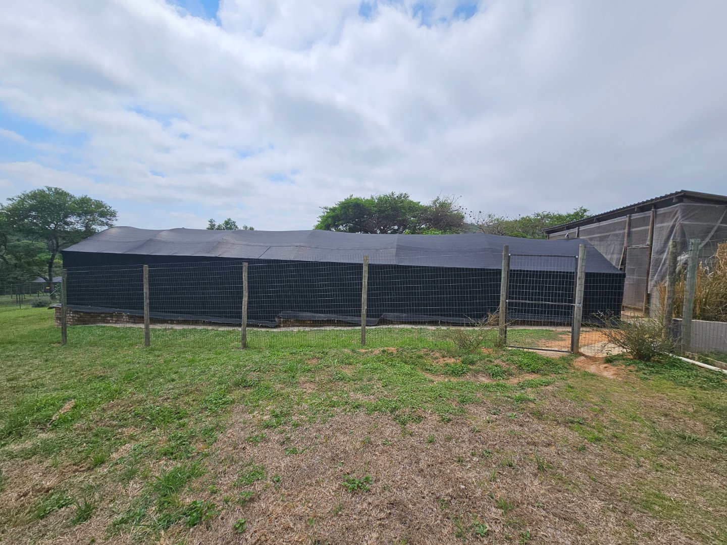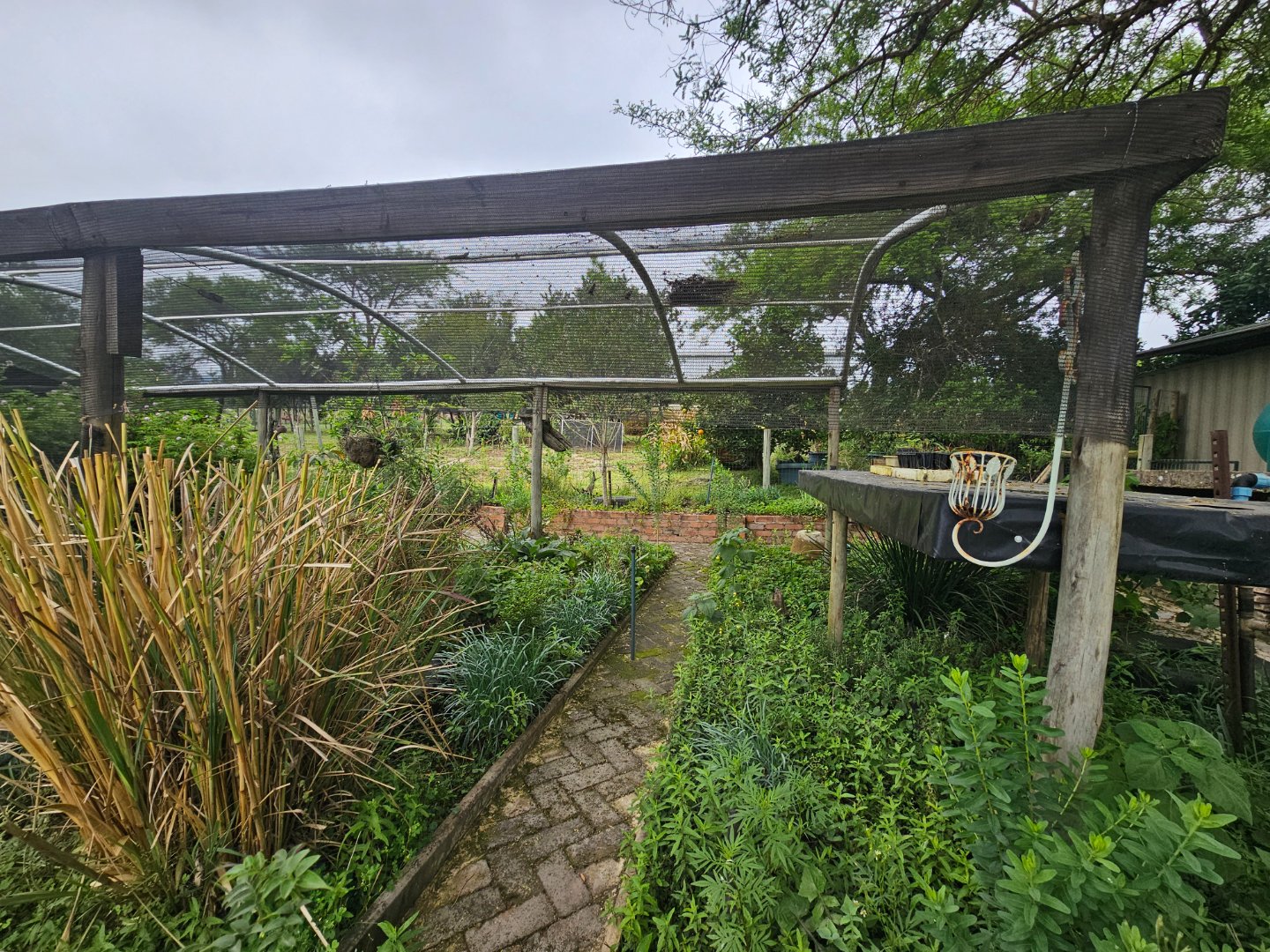 Large shed for farmers to work in. At present there's a bachelor's cottage in a section. There are snail or nursery tents up. There are chicken enclosures.