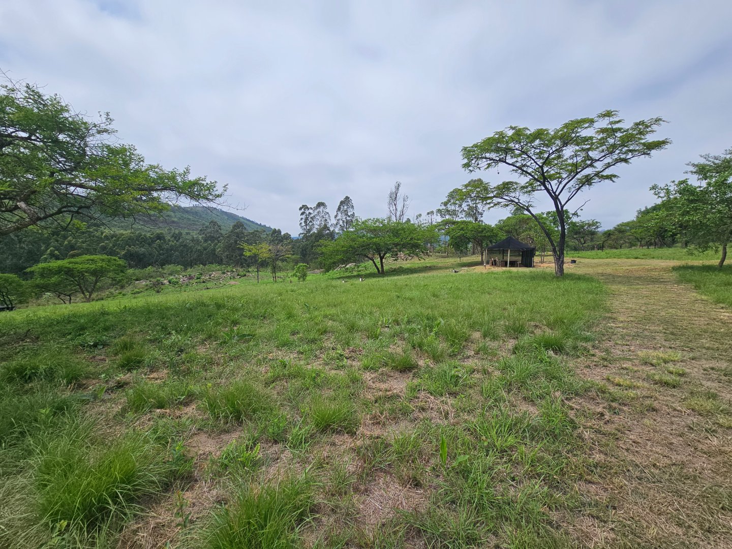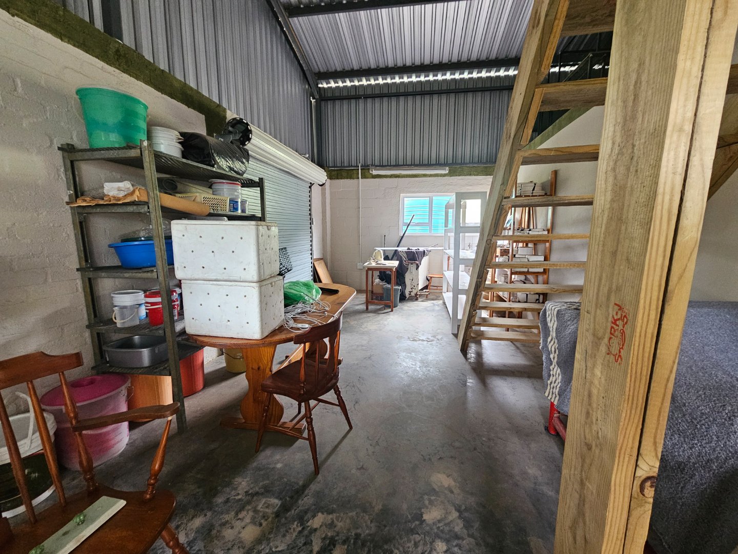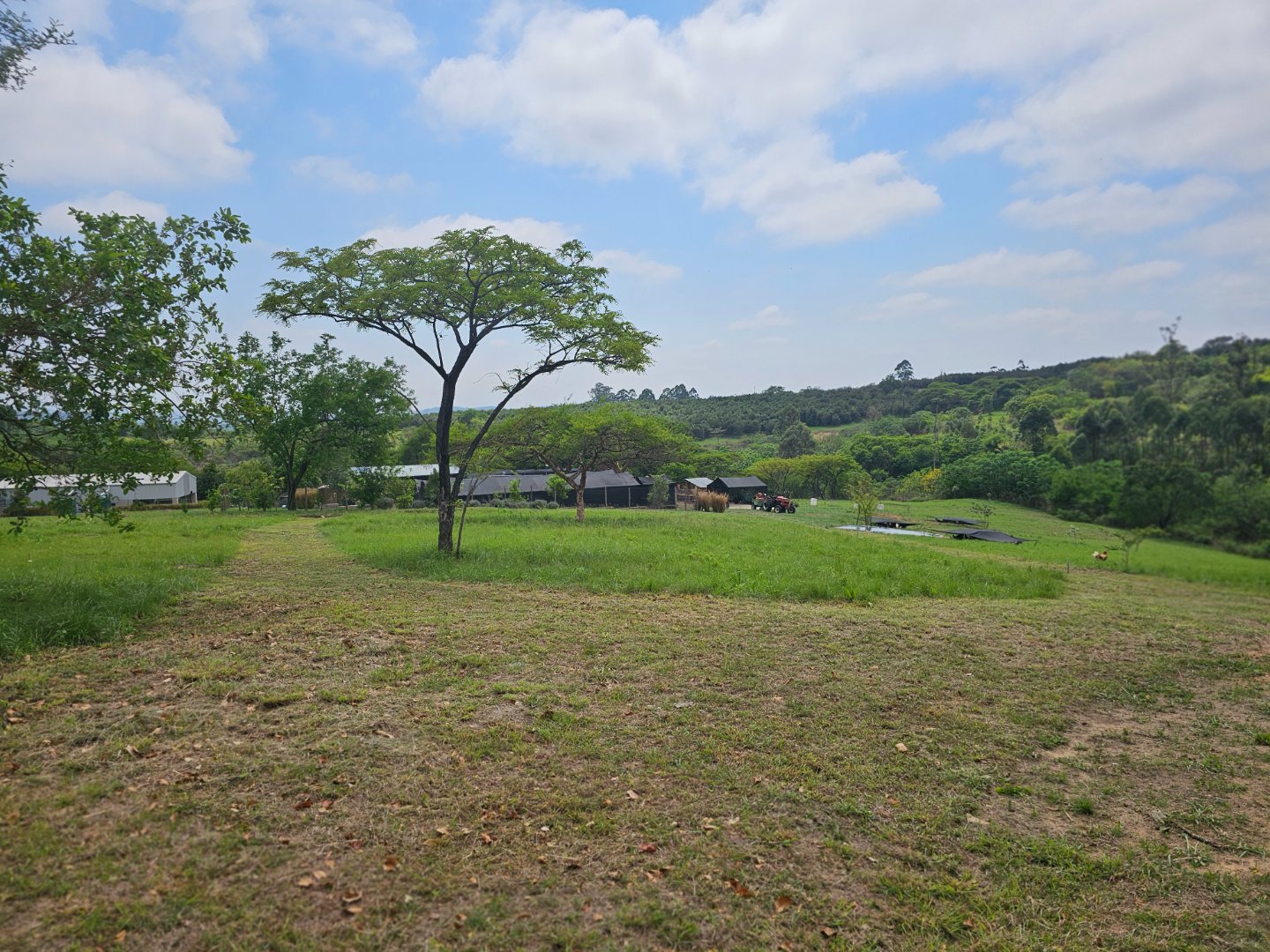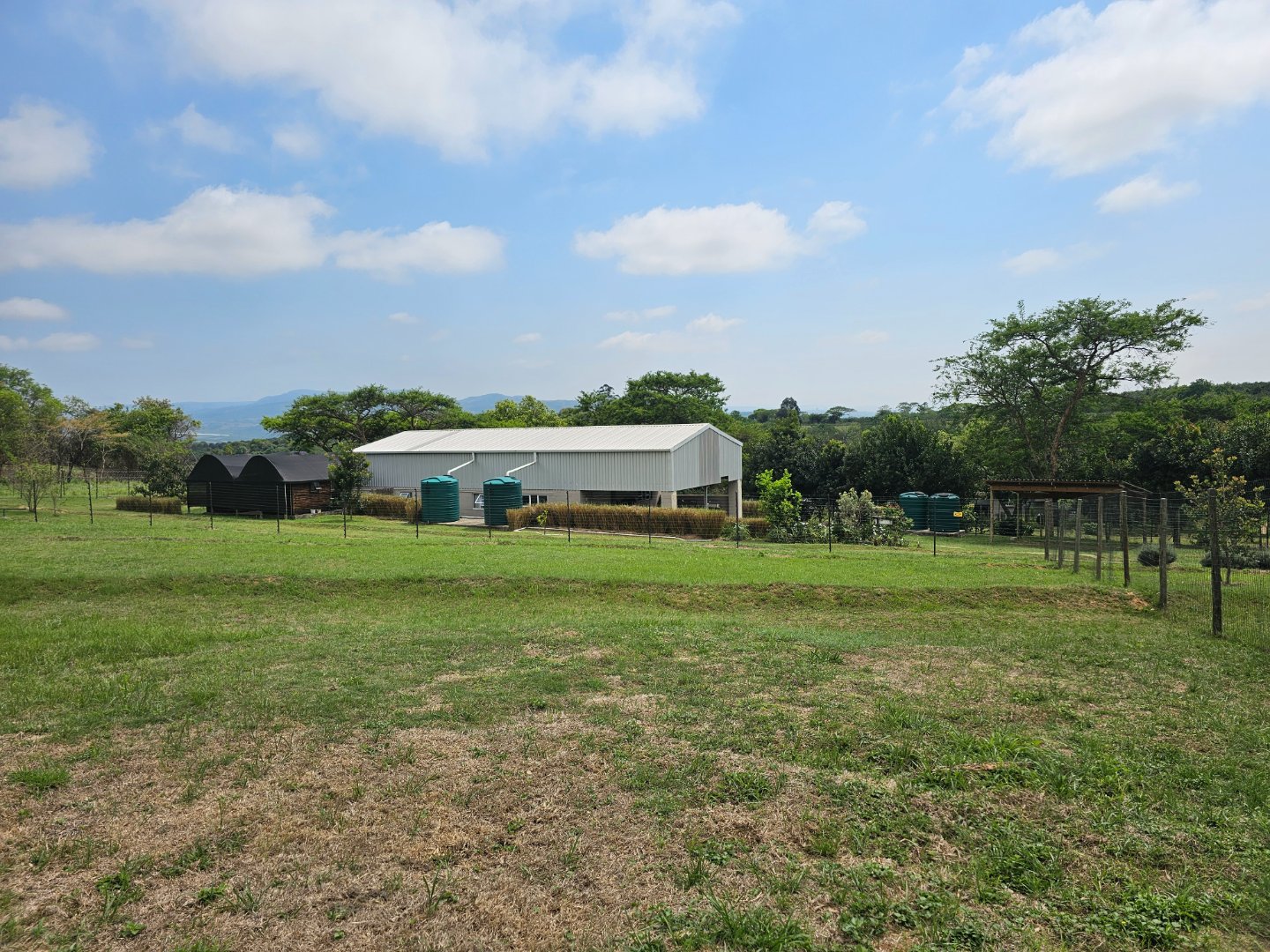 Large shed for farmers to work in. At present there's a bachelor's cottage in a section. There are snail or nursery tents up. There are chicken enclosures.