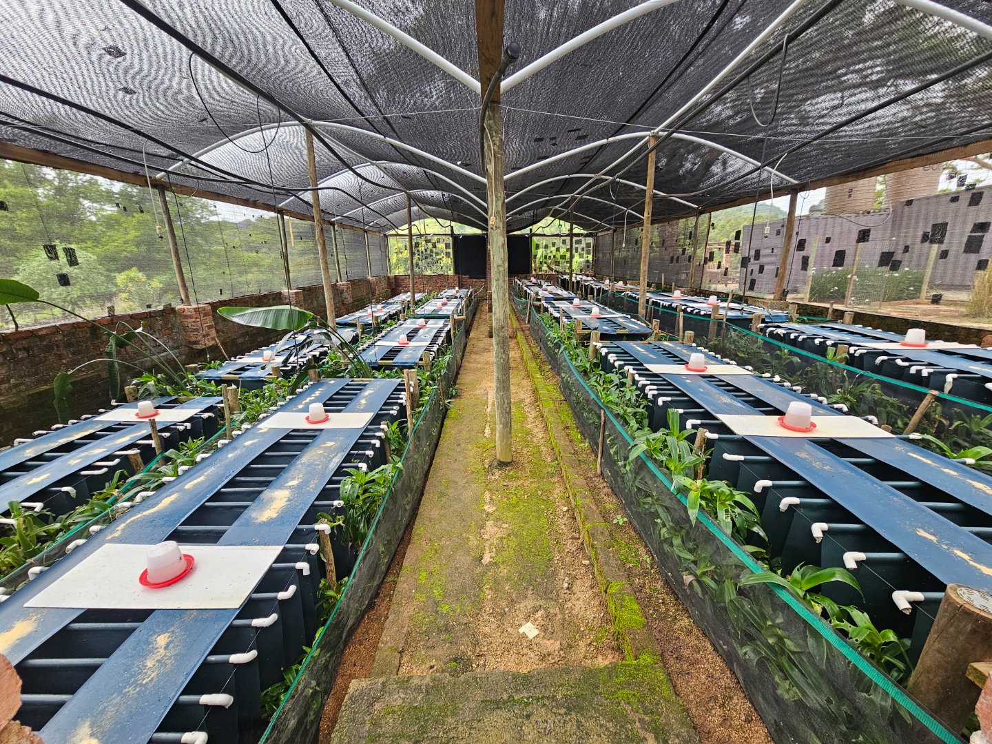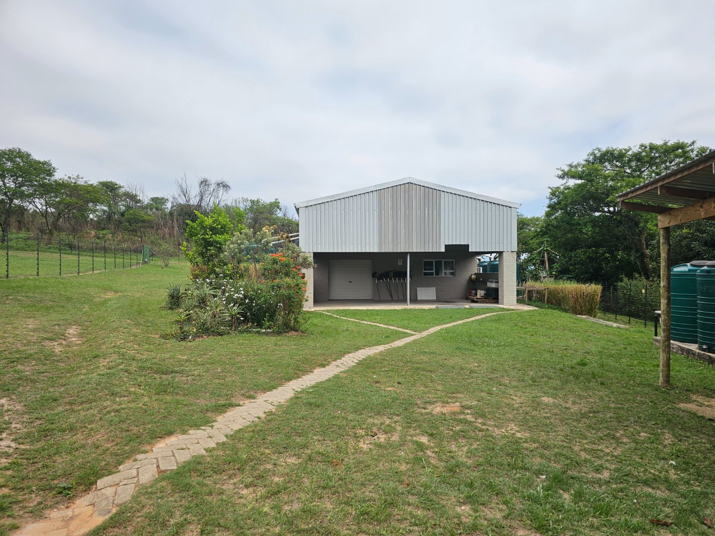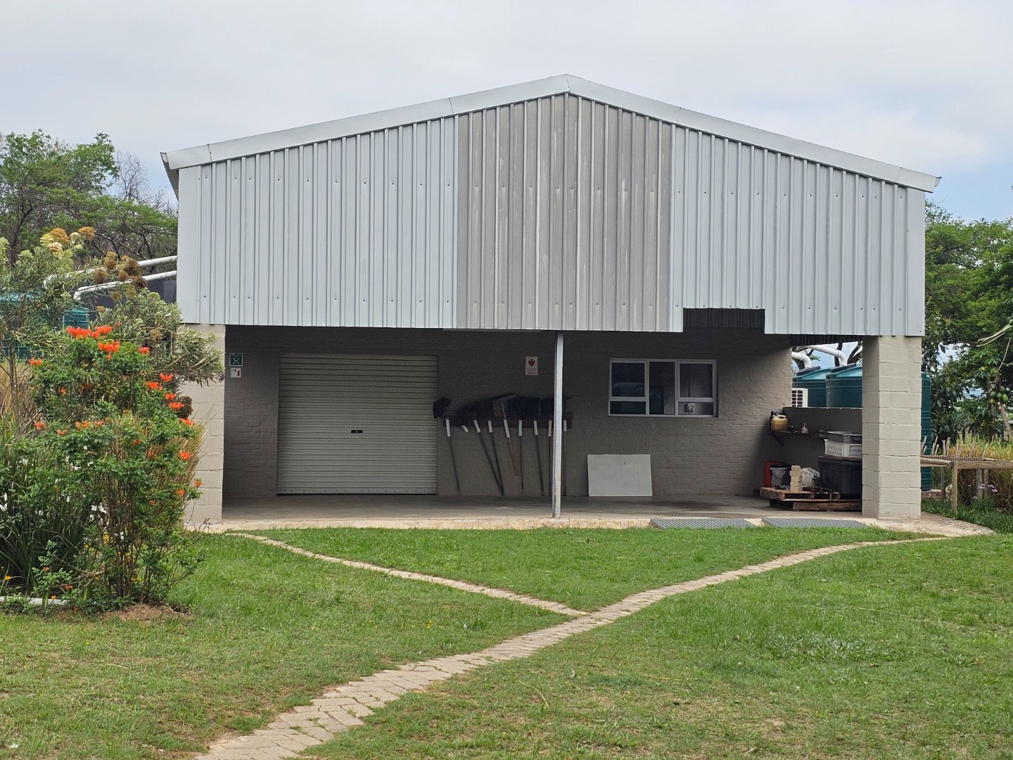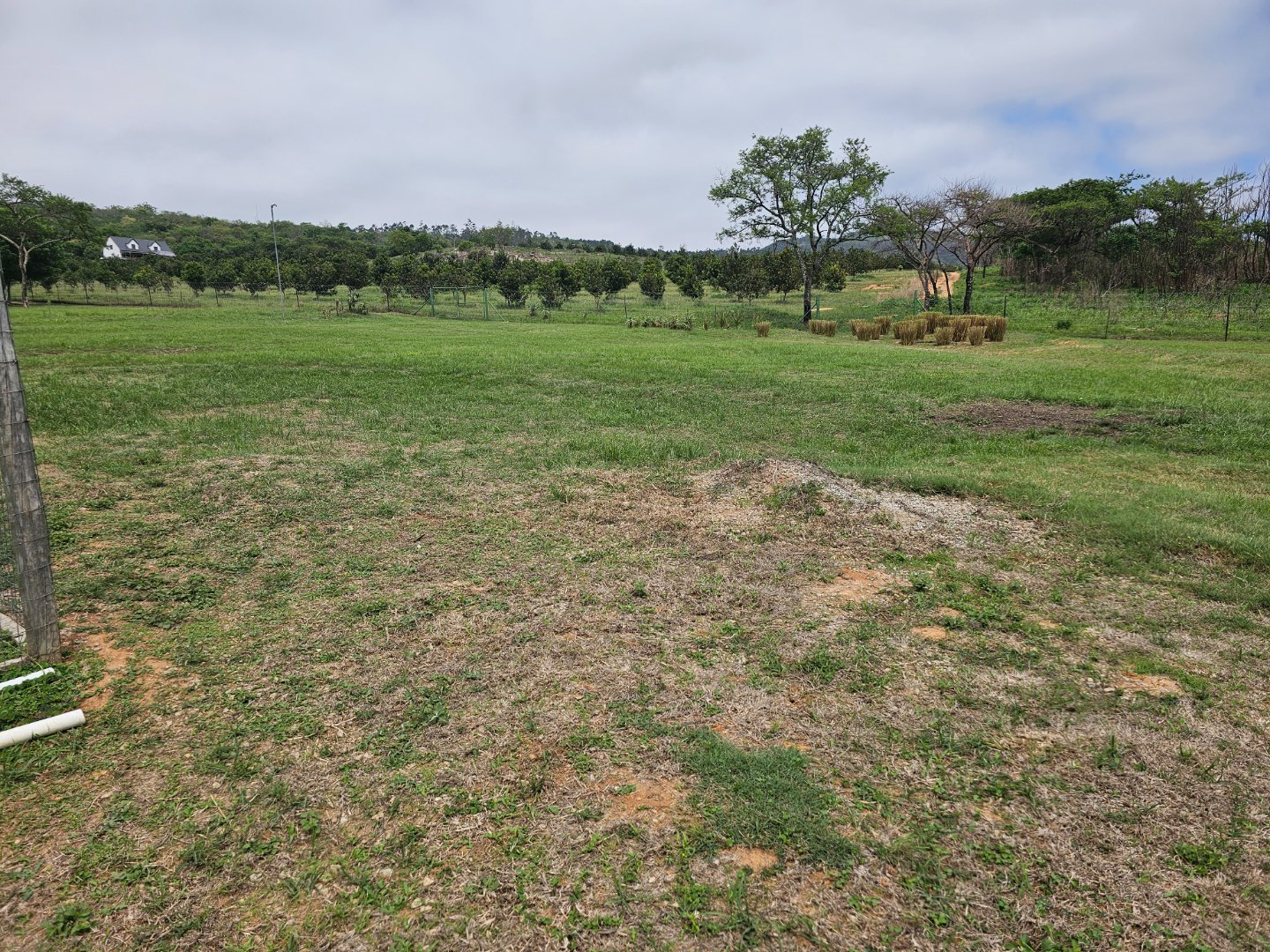 Large shed for farmers to work in. At present there's a bachelor's cottage in a section. There are snail or nursery tents up. There are chicken enclosures.