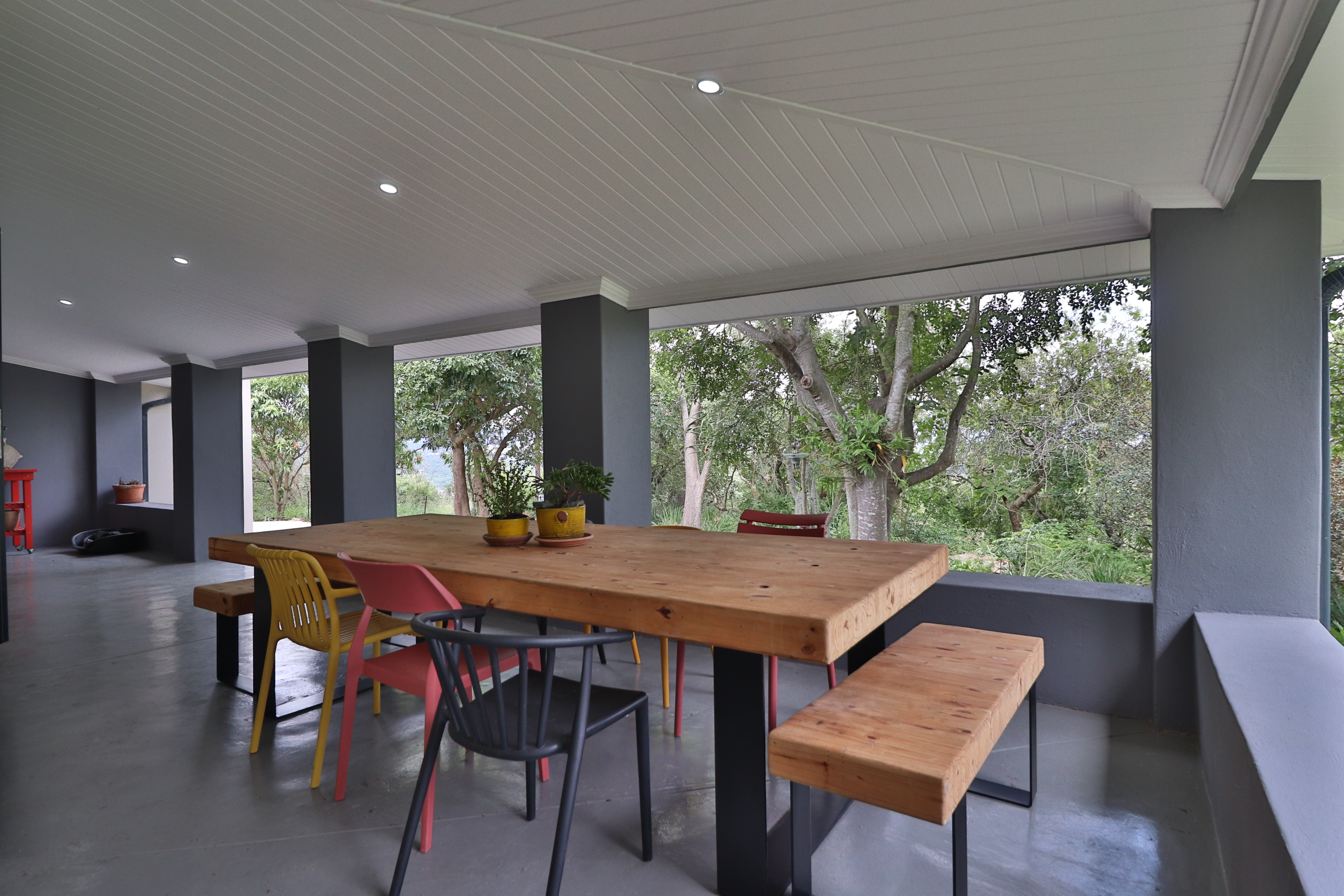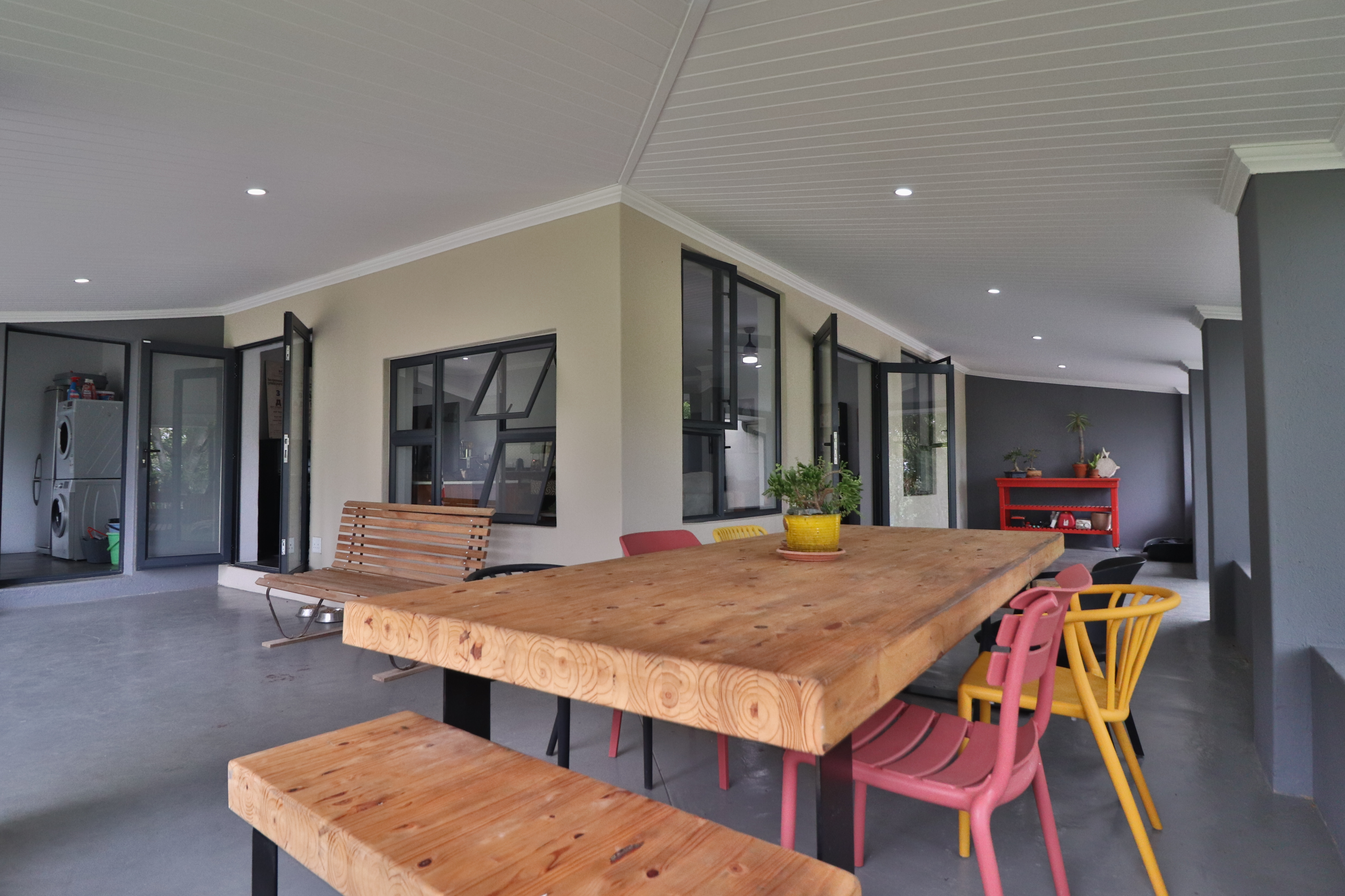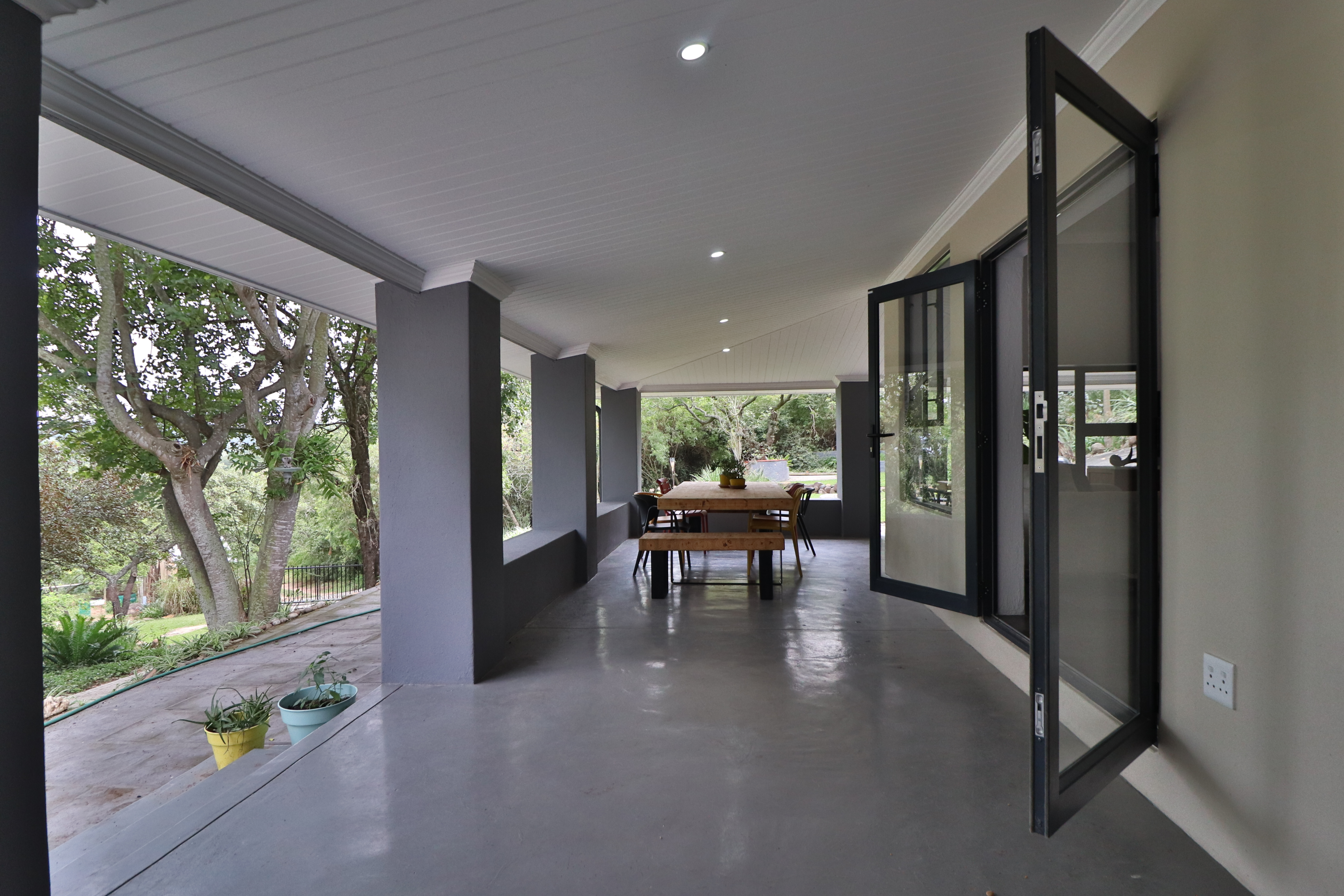 The undercover patio area invites the spectacular scenery and well-kept garden into the house.