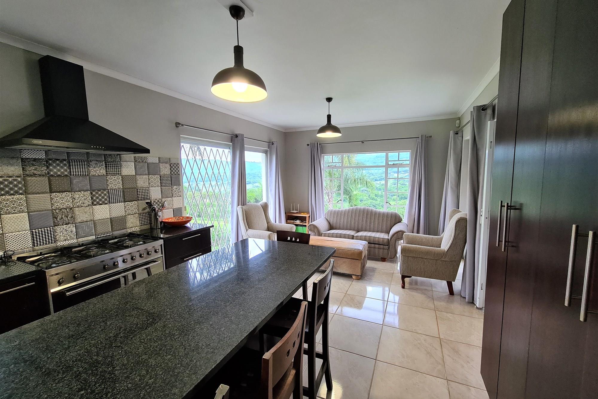 An open-plan dining room and lounge flow seamlessly to an entertainer`s patio, offering stunning views of the swimming pool, large dam, and picturesque valley.
