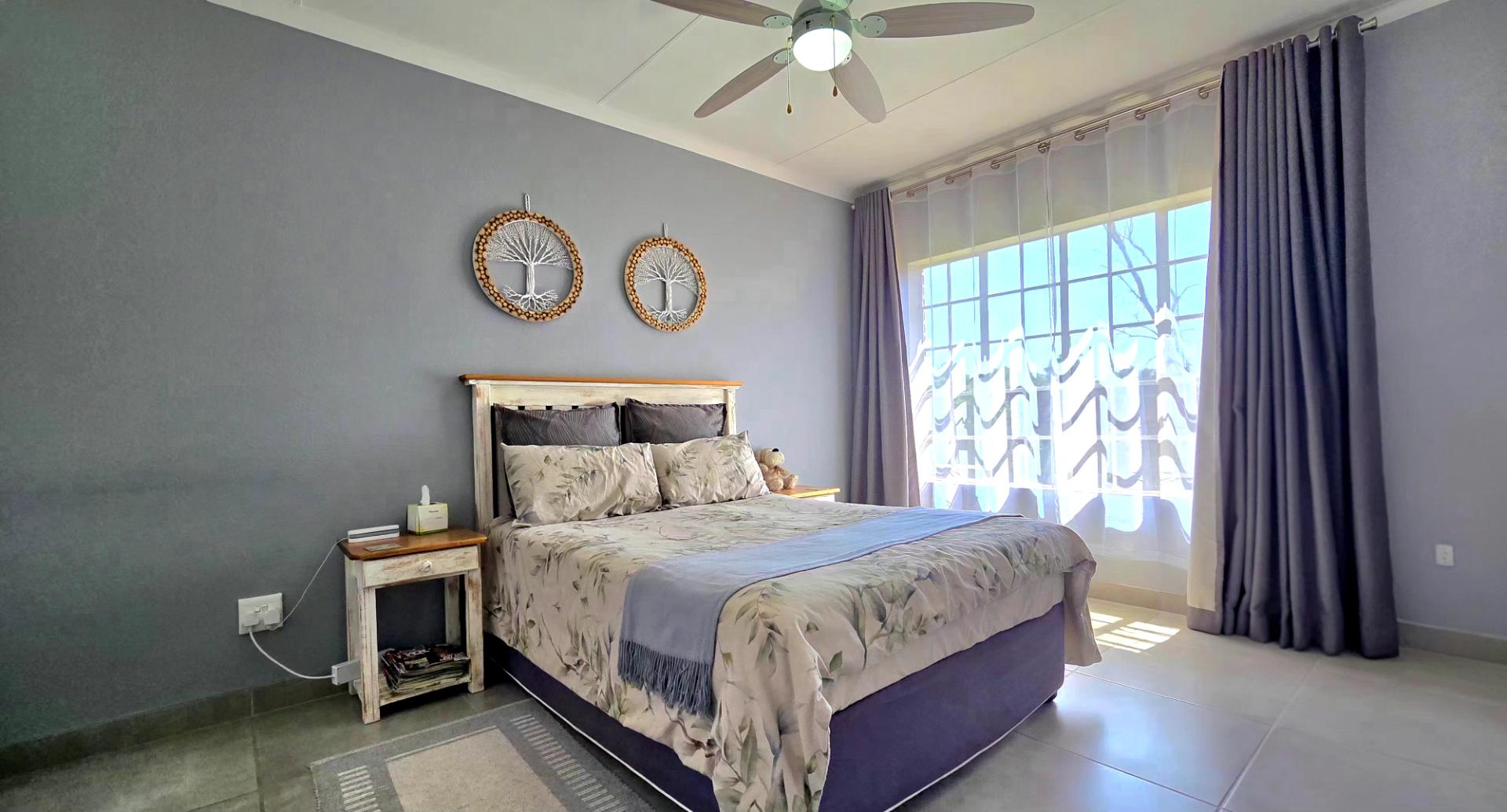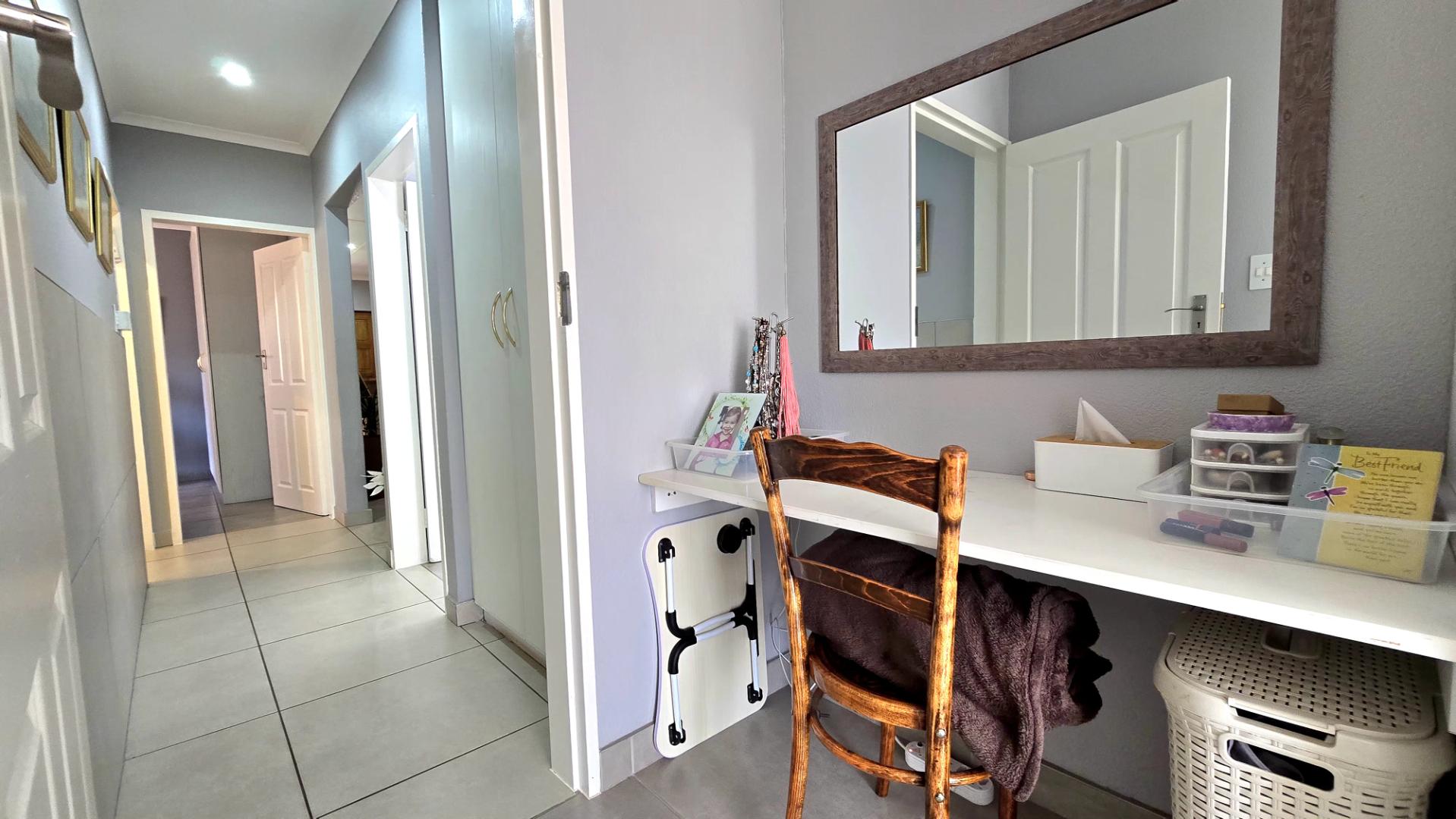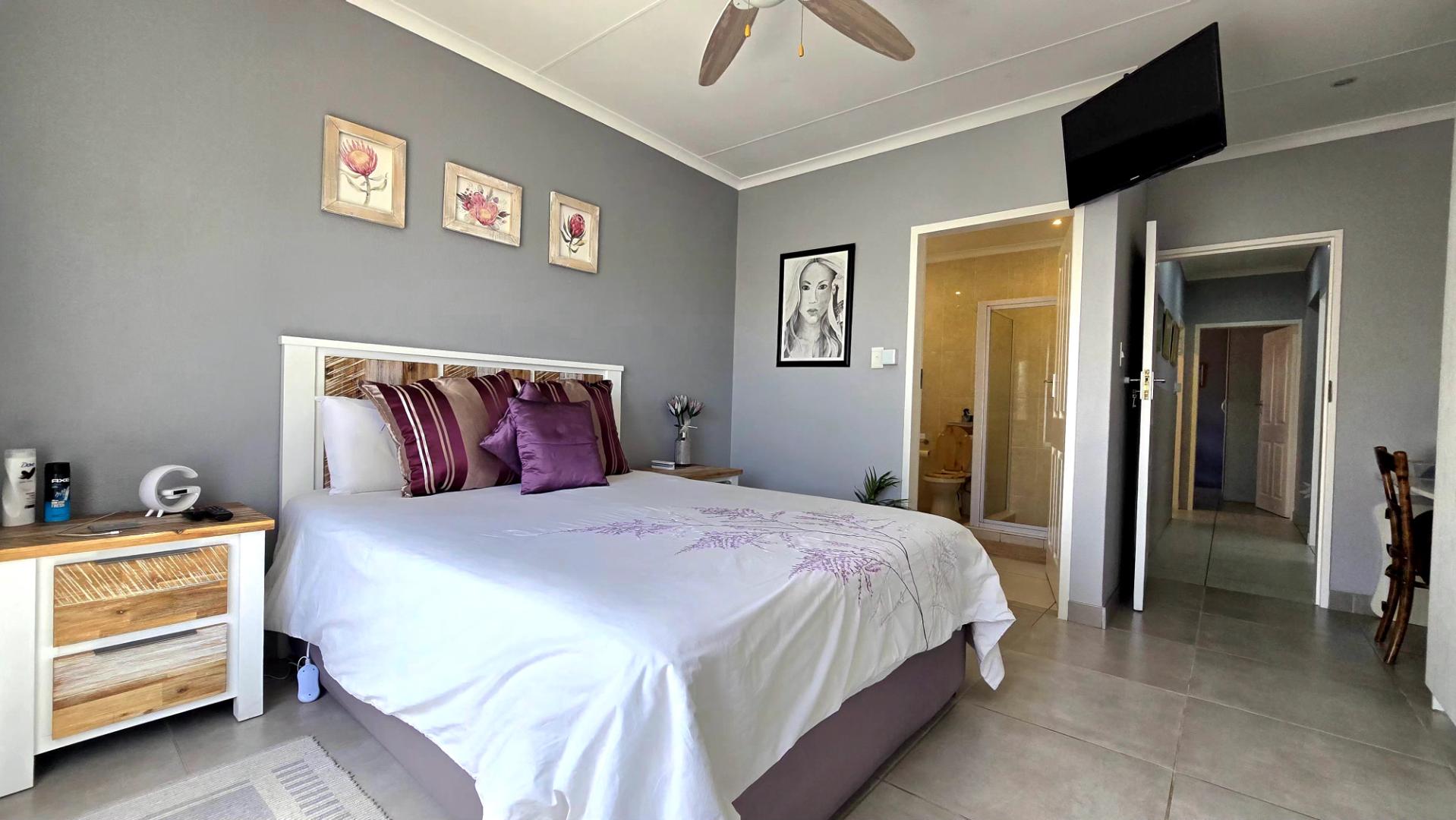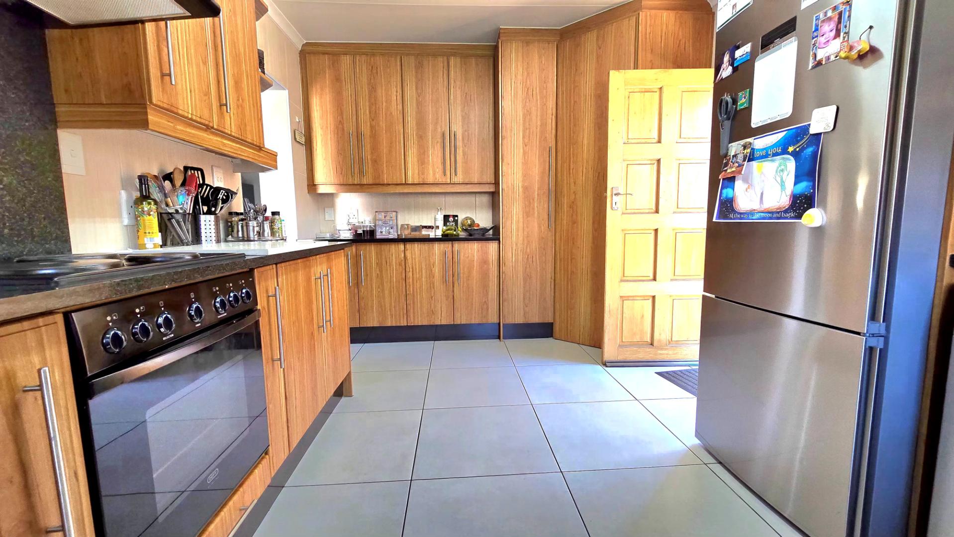 At the heart of the home is a contemporary kitchen, complete with sleek granite countertops and ample cupboard space, ideal for those who love to cook. The open-plan lounge and dining area provide the perfect setting for family gatherings and entertaining guests.