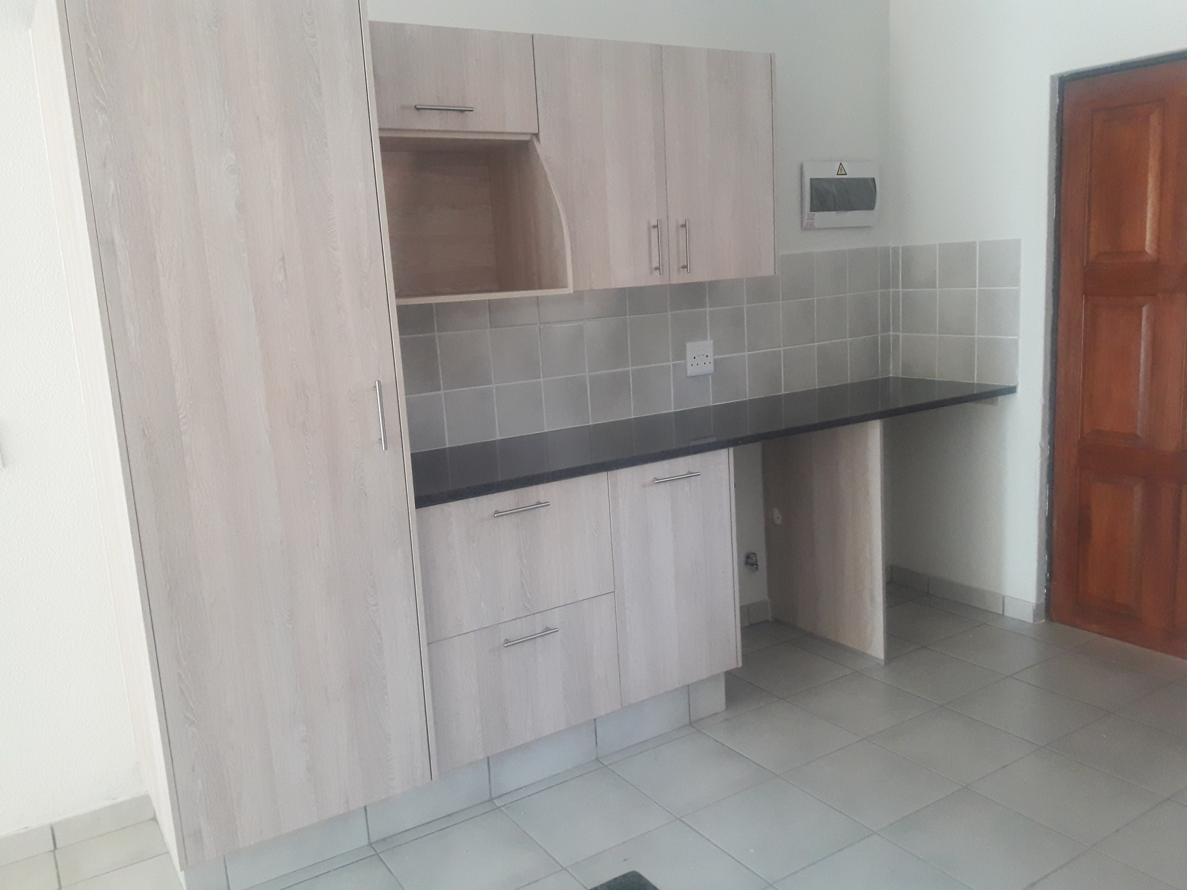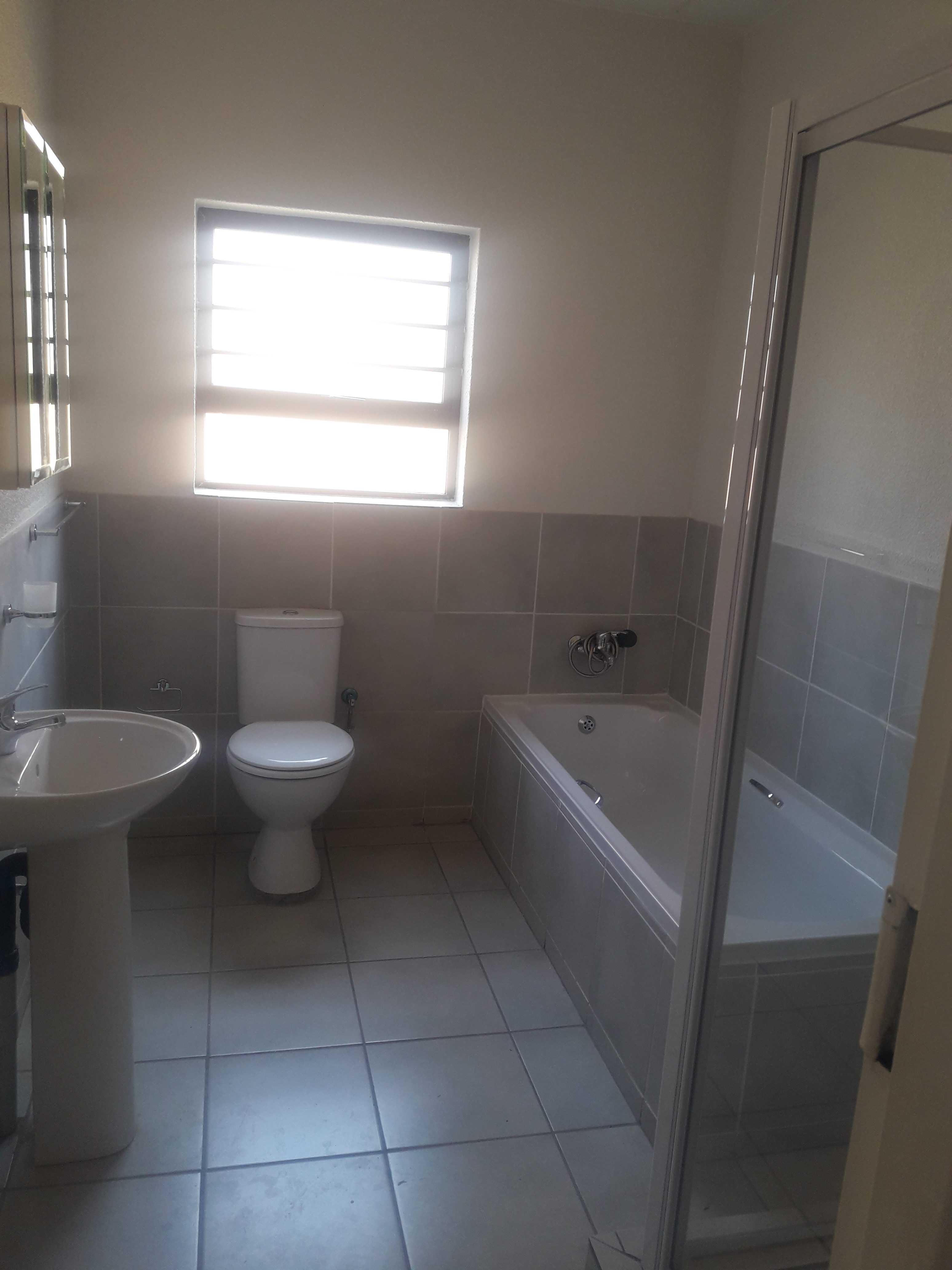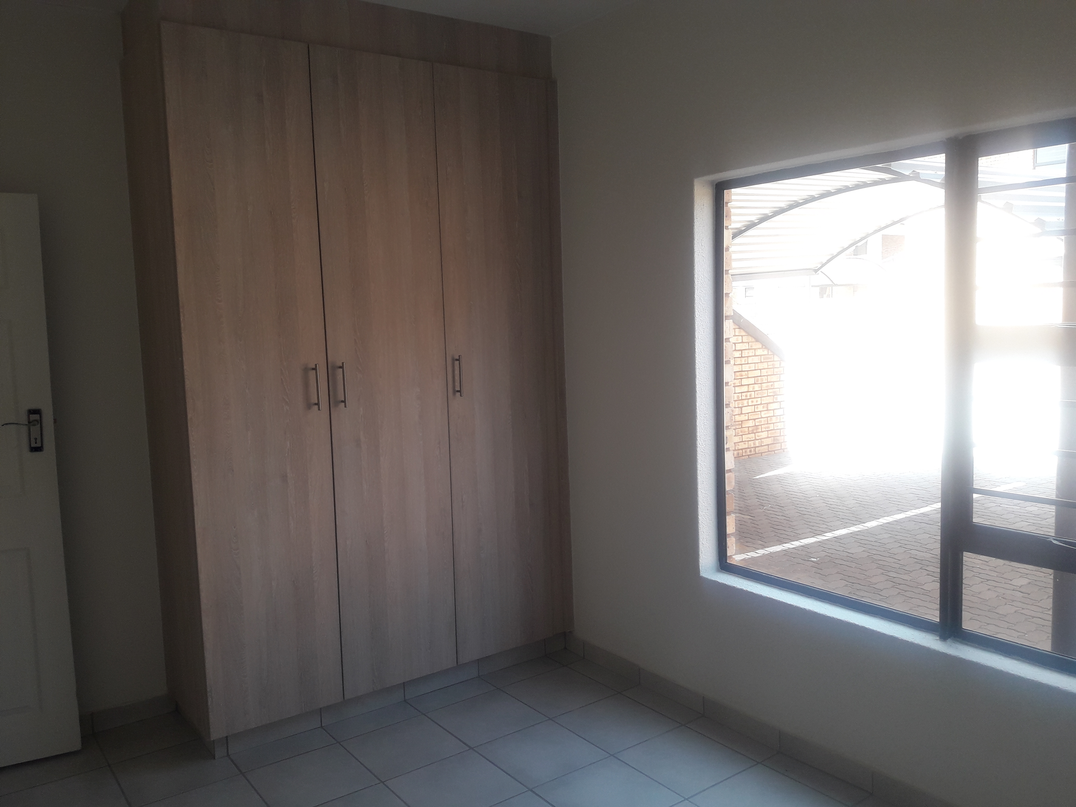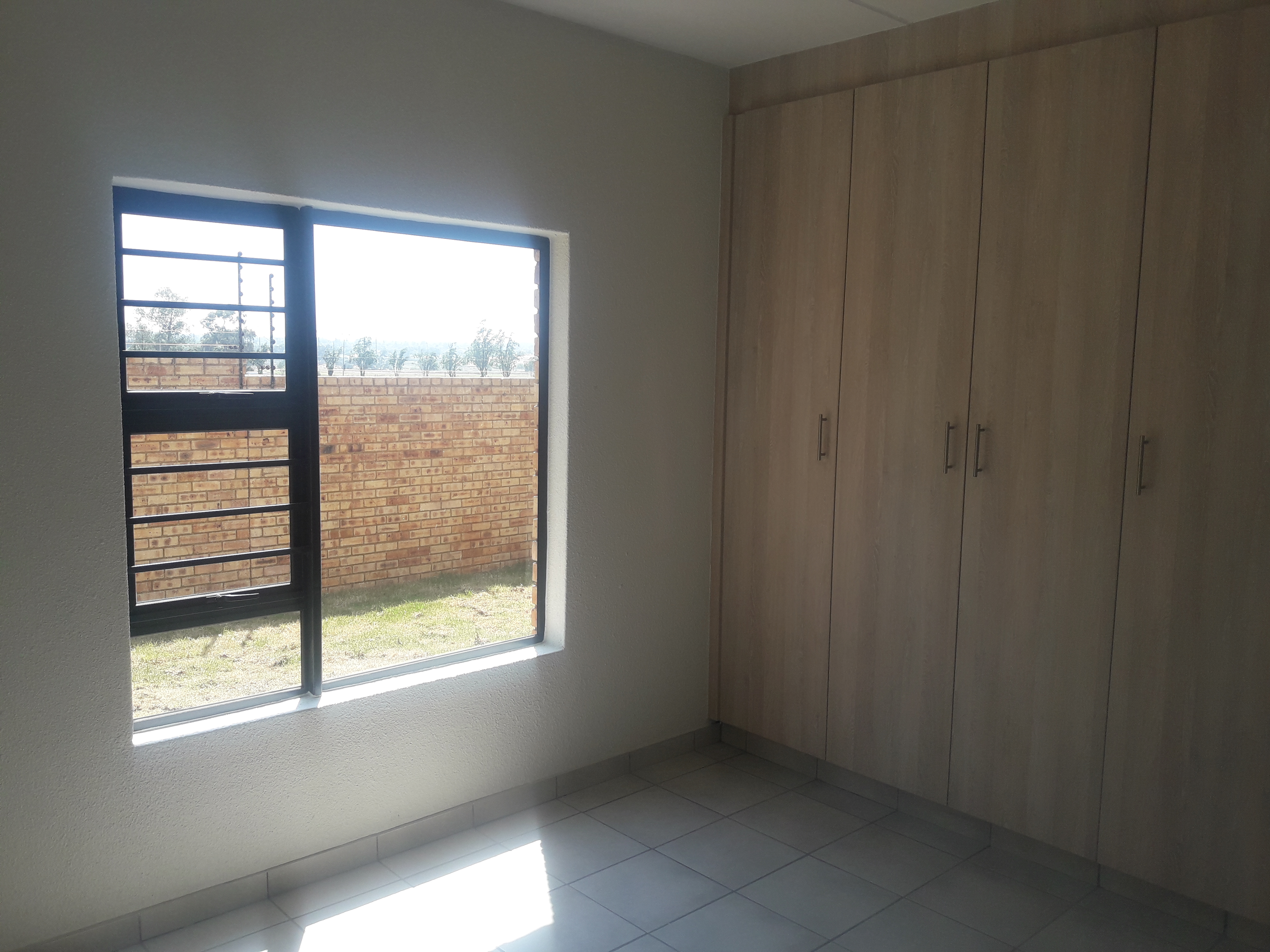 It has a large kitchen with granite tops, a gas hob and an electric oven, an extractor fan, and a breakfast nook with plenty of space for a washing machine, dishwasher, and tumble dryer. It has a solar geyser, prepaid electricity, and prepaid water meters. Two bedrooms are double, and one bedroom is single, and the main bedroom has an en-suite bath with a shower. Both bathrooms and the kitchen have blinds. There is a double carport in front of the townhouse with visitor parking across from the unit. The complex offers electric fencing, a 24-hour security guard and garden service. Pets are allowed with permission. A security levy and refuse are charged separately at about R500pm.
