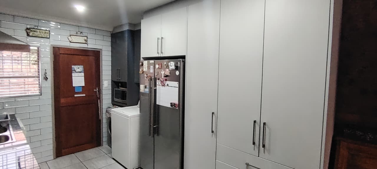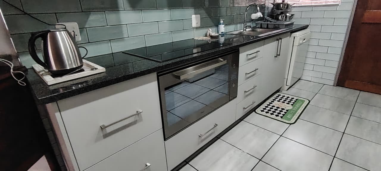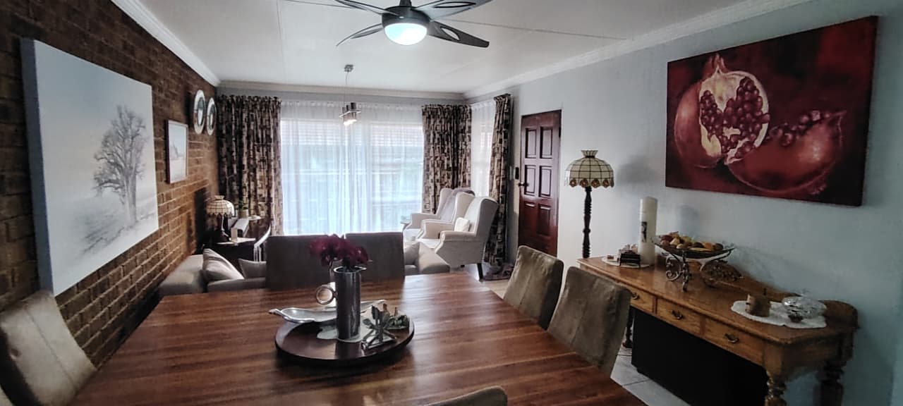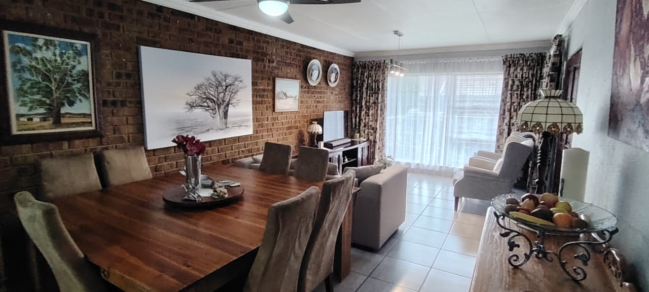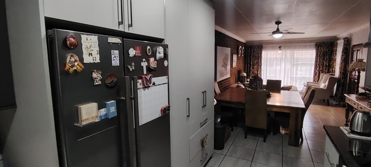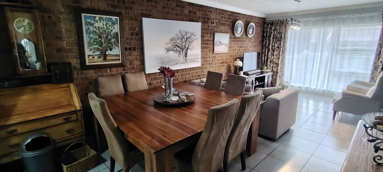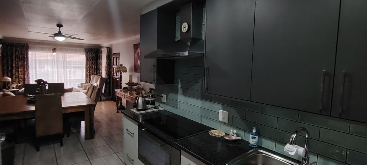 Step inside to find a spacious open-plan living area, featuring a beautifully tiled lounge and dining space that seamlessly flows into a modern kitchen. The kitchen is a chef's dream, boasting sleek Rustenburg granite countertops, an elegant backsplash, and a high-end oven. Designed with convenience in mind, it offers ample space for all your appliances.