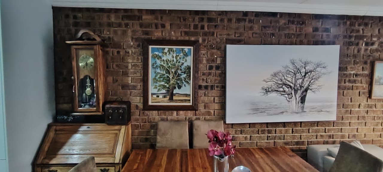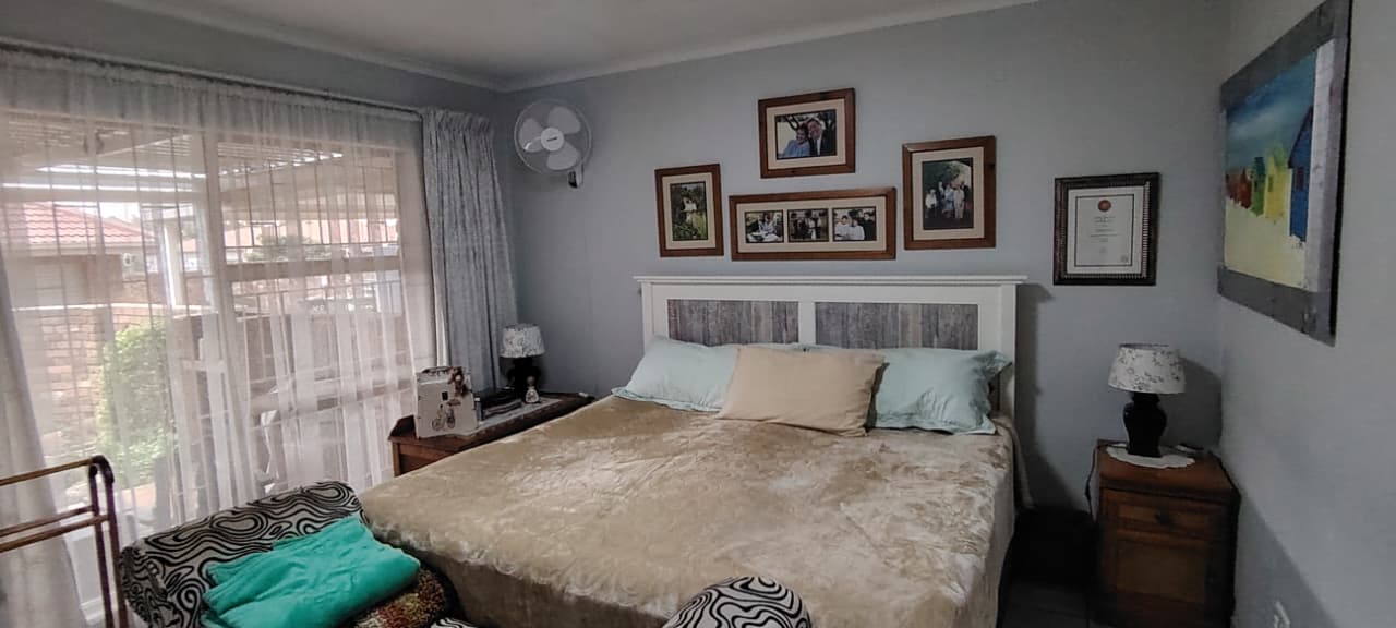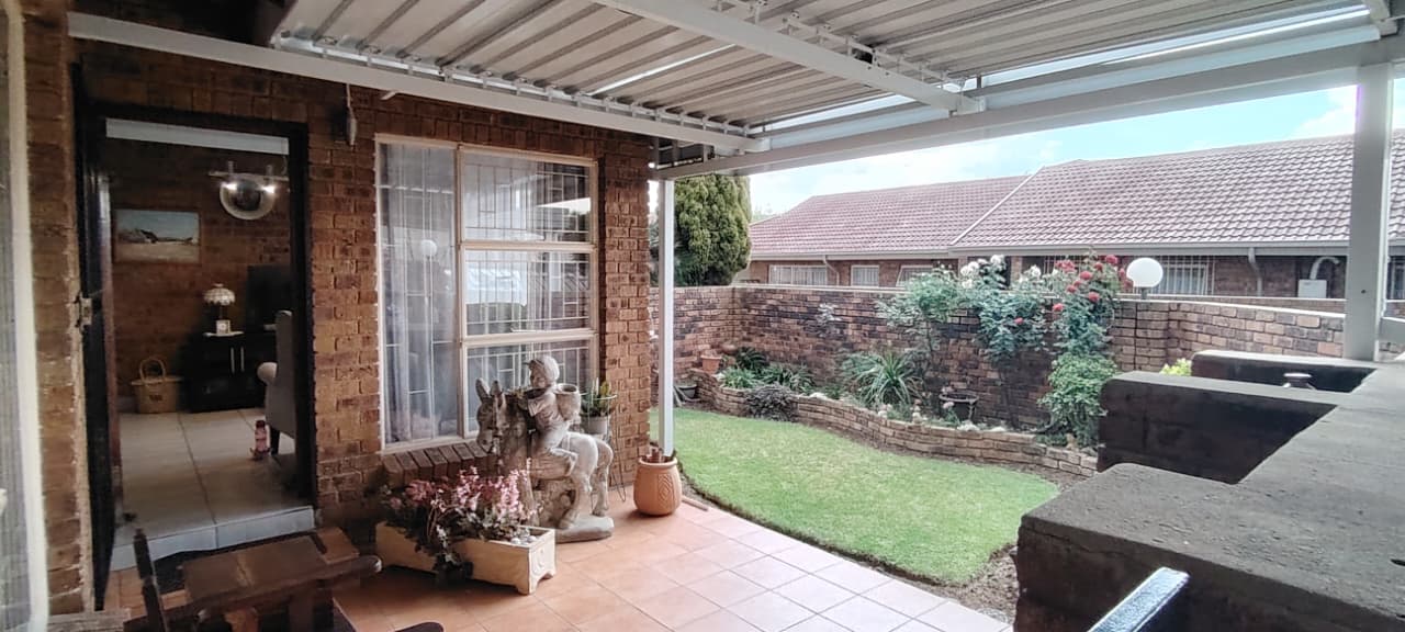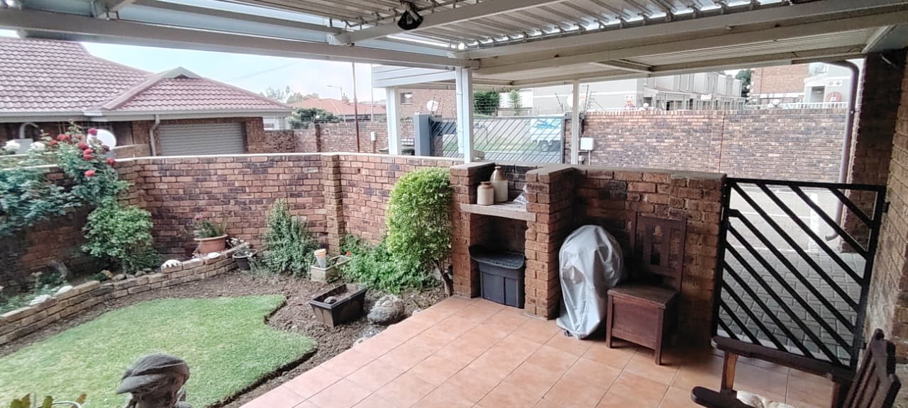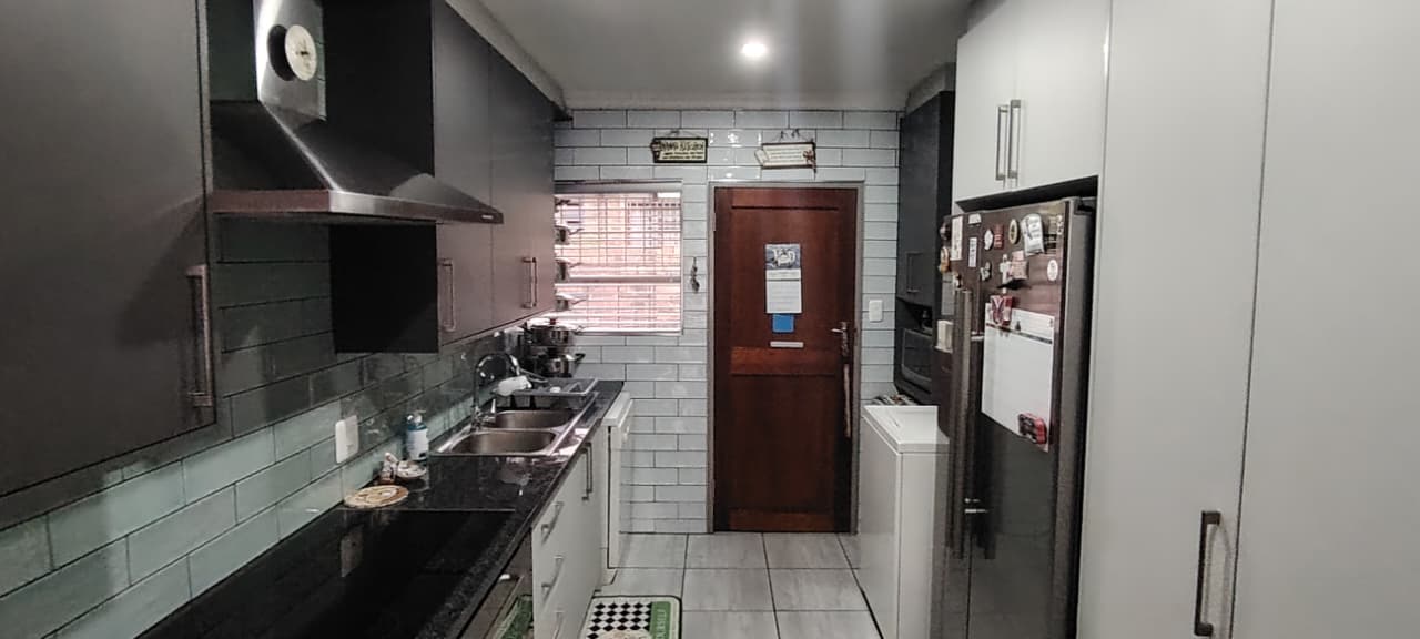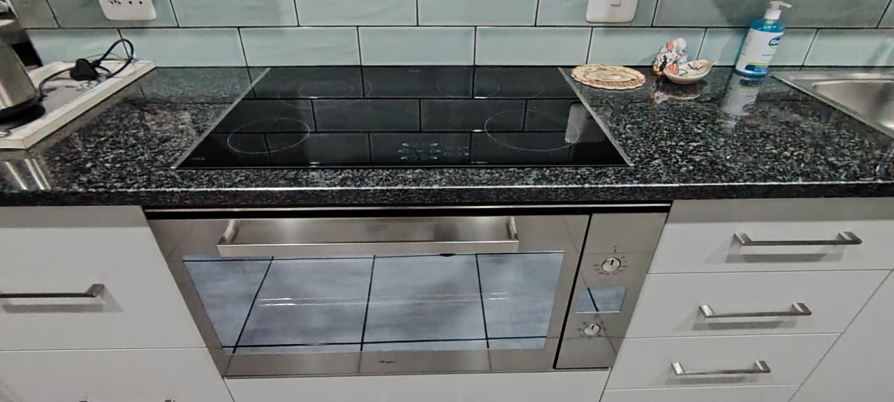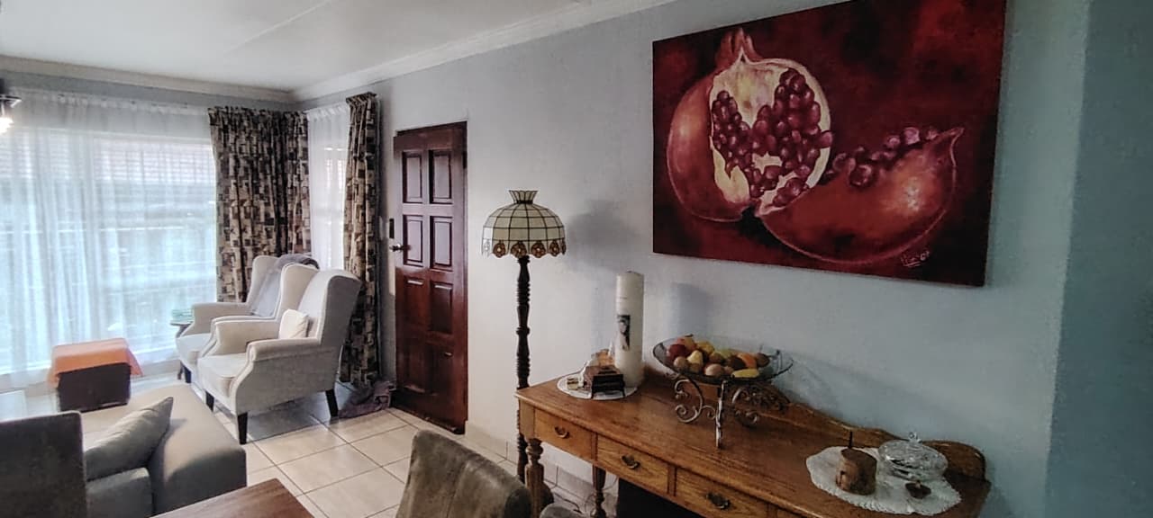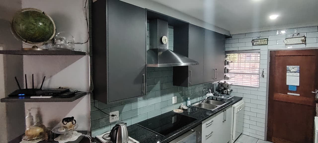 Step inside to find a spacious open-plan living area, featuring a beautifully tiled lounge and dining space that seamlessly flows into a modern kitchen. The kitchen is a chef's dream, boasting sleek Rustenburg granite countertops, an elegant backsplash, and a high-end oven. Designed with convenience in mind, it offers ample space for all your appliances.
