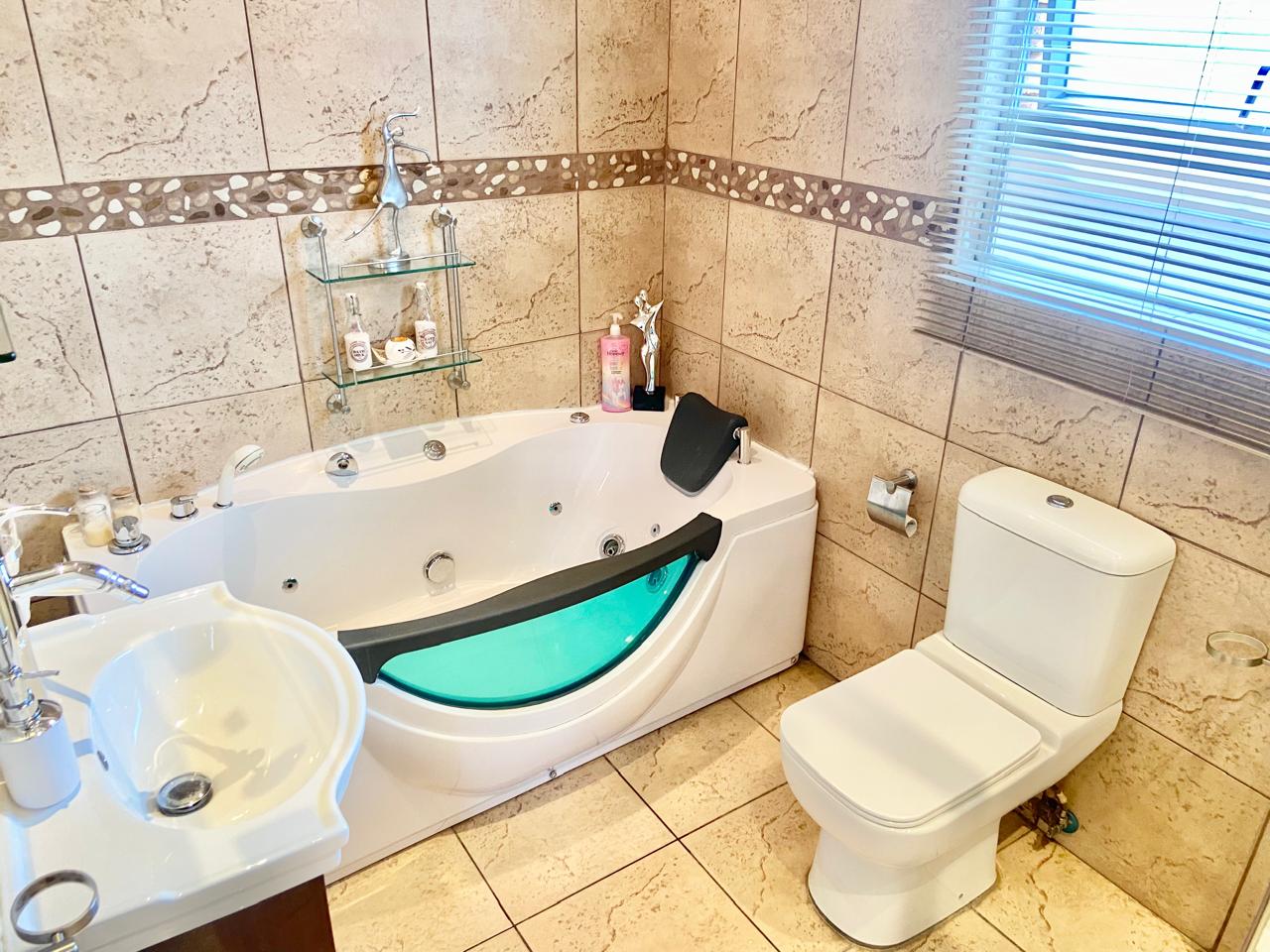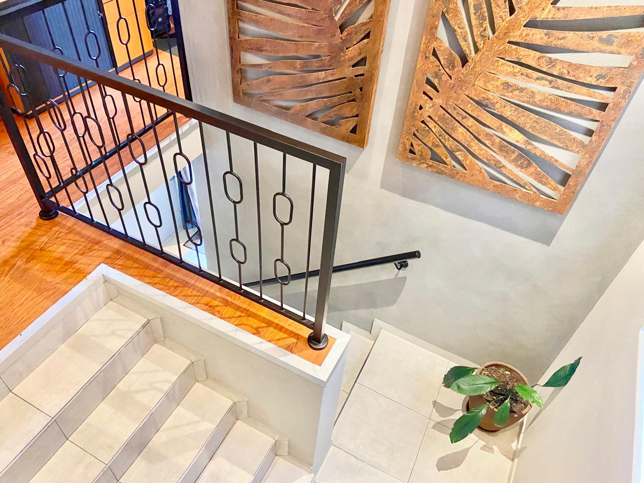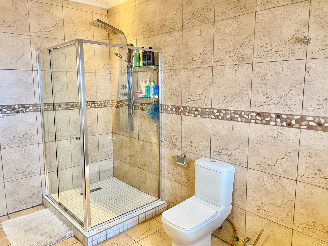 Safety and security are prioritized with features such as an electric fence, a comprehensive alarm system with exterior cameras, aluminum burglar proofing on all ground floor windows, and perspex security bars on all upstairs openings.