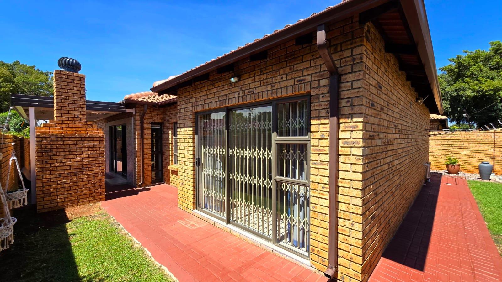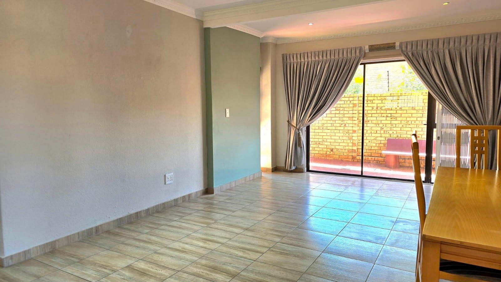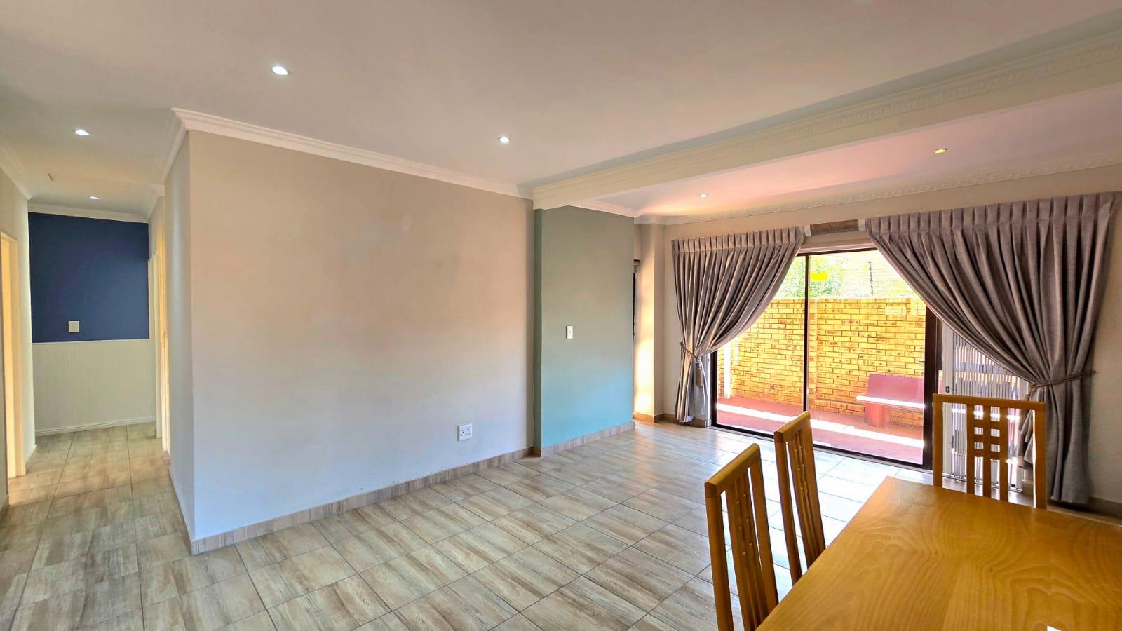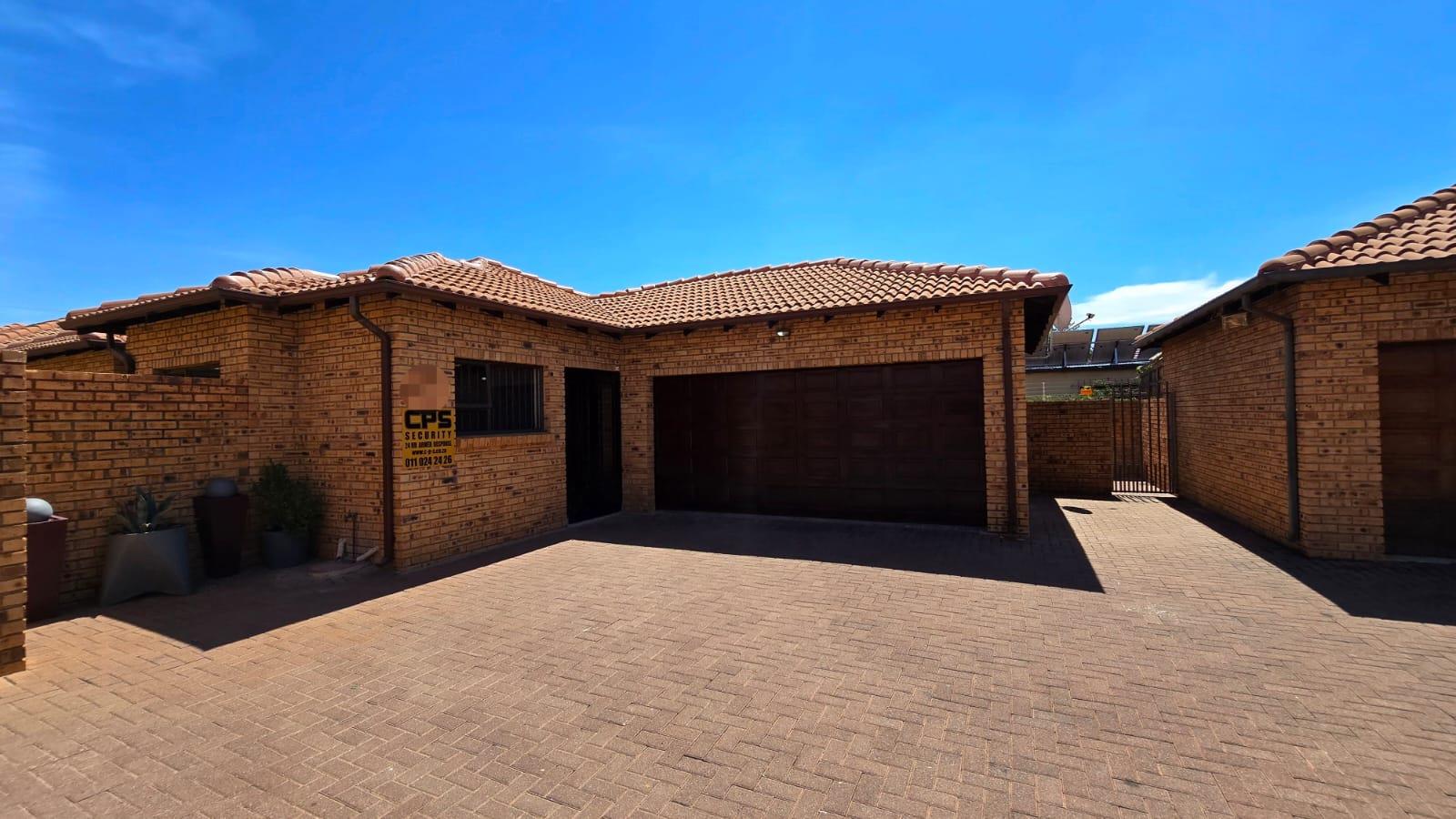 The home offers three bedrooms and two bathrooms, with the main bedroom featuring an en-suite bathroom and walk-in cupboards. Safety and convenience are at the forefront with aluminum-framed windows and a comprehensive alarm system. The low-maintenance face brick exterior, tiled double garage with an automatic door motor, and additional parking spaces further enhance the practicality of this townhouse.
