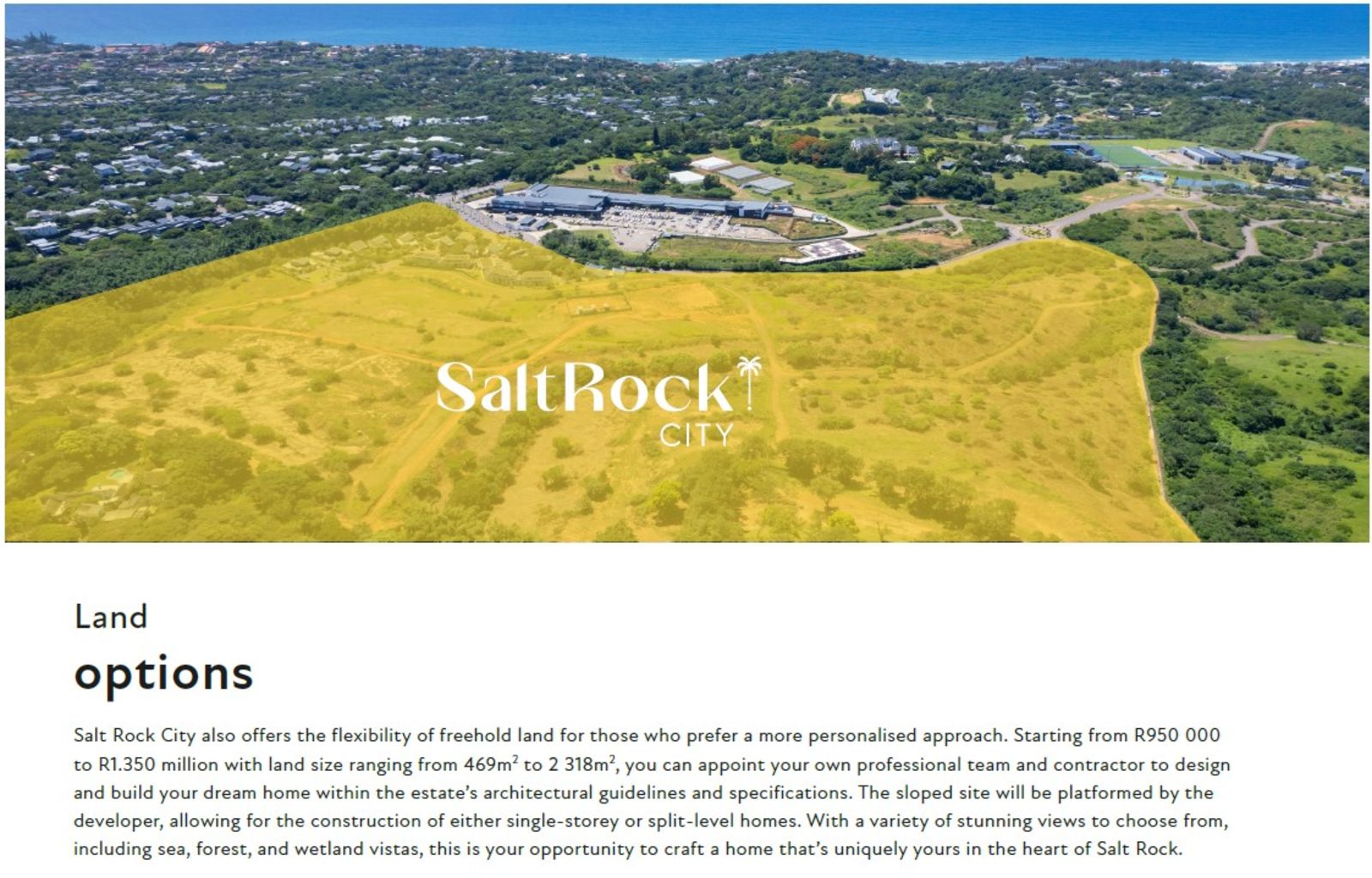 Welcome to Salt Rock City, where you can create your dream home exactly the way you want it! We offer the wonderful option of freehold land starting from just R950,000 to R1.35 million, with land sizes ranging from 469m2 to 2,318m2. You have the freedom to choose your professional team and contractor to design and build your ideal home, all while adhering to our architectural guidelines. The site is sloped, and the developer will level it out for you, allowing you to build either a cosy single-storey home or a stylish split-level one. Picture yourself enjoying breathtaking views of the sea, lush forests, or tranquil wetlands right from your backyard!