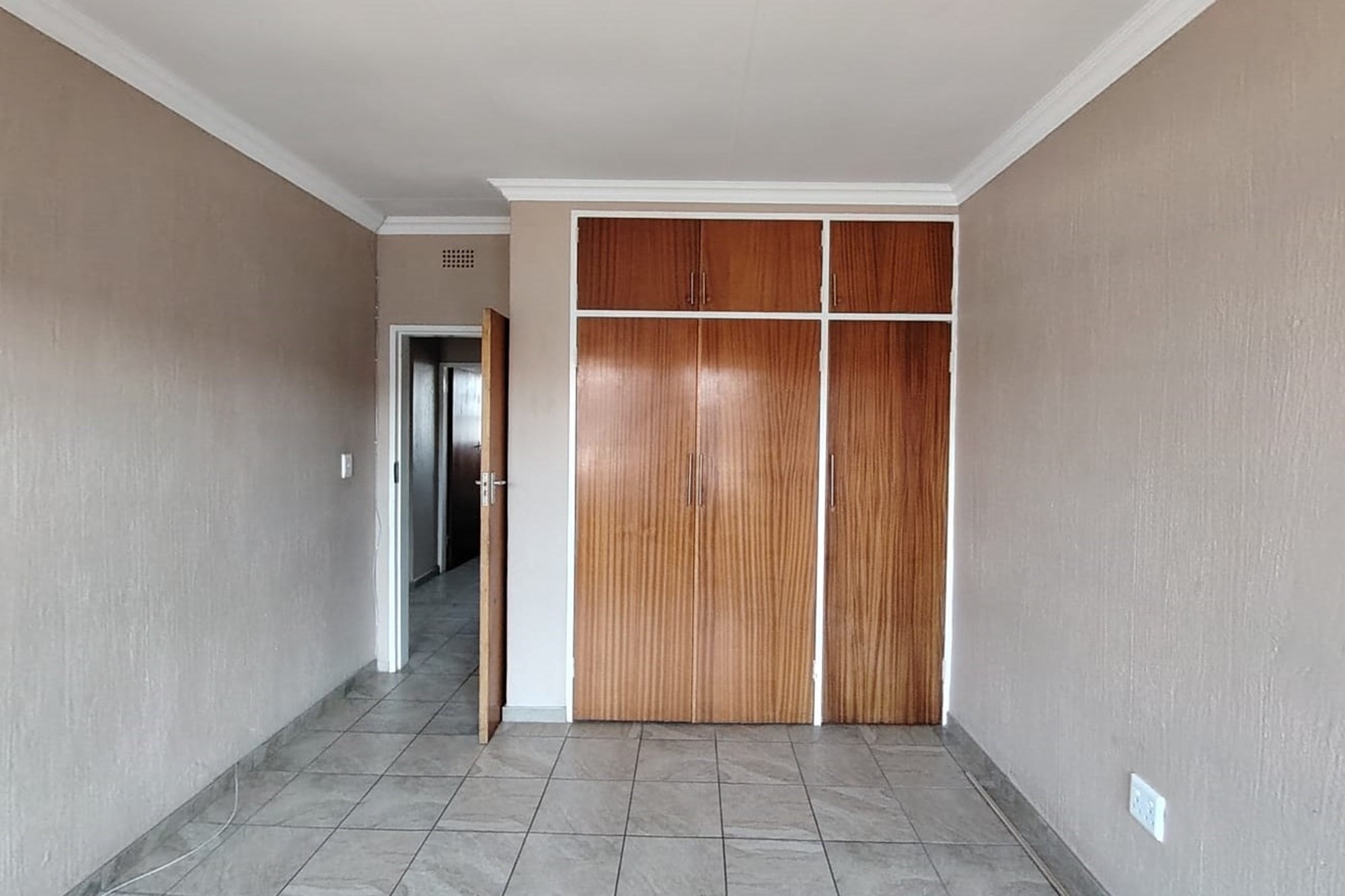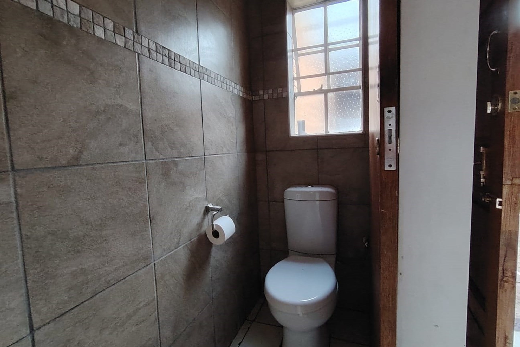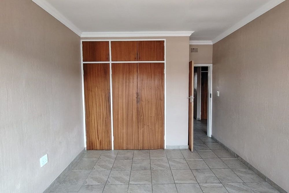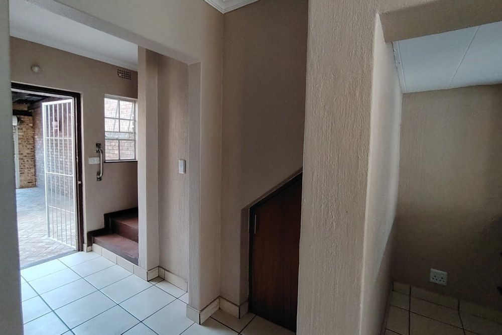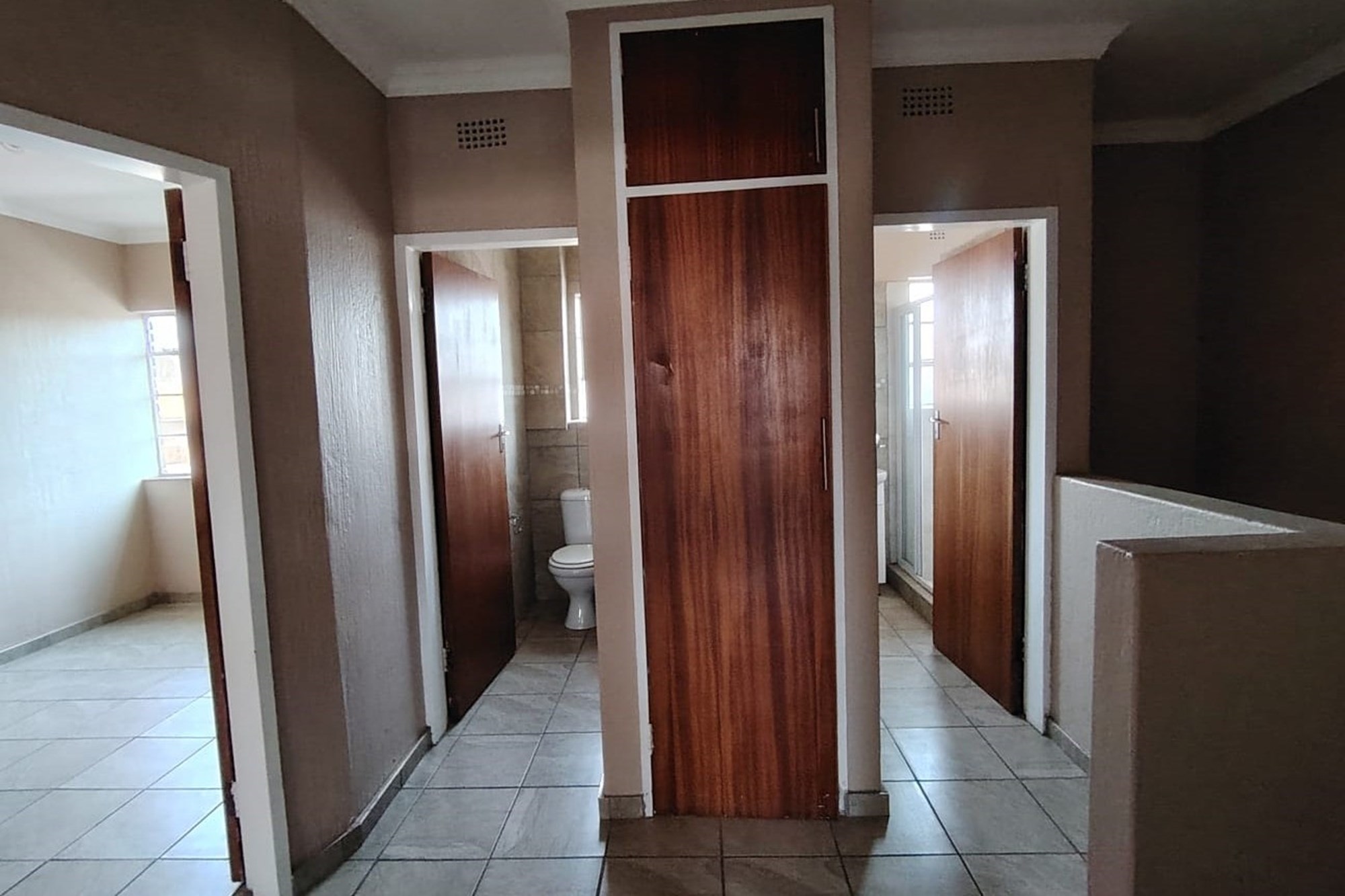The residence features three generously sized bedrooms, each adorned with built-in cupboards, ensuring ample storage space. A fully tiled bathroom with a separate toilet enhances convenience, complemented by an additional guest toilet with a basin on the lower level.