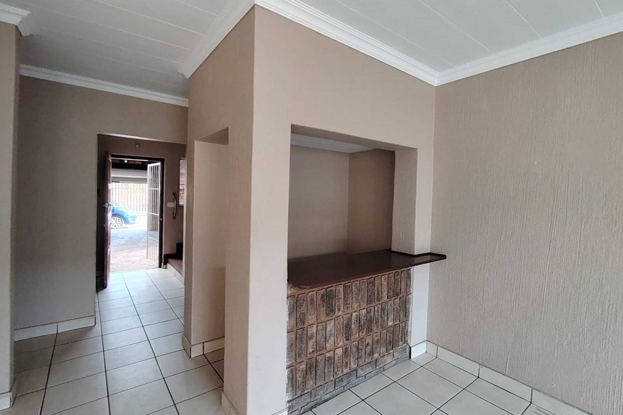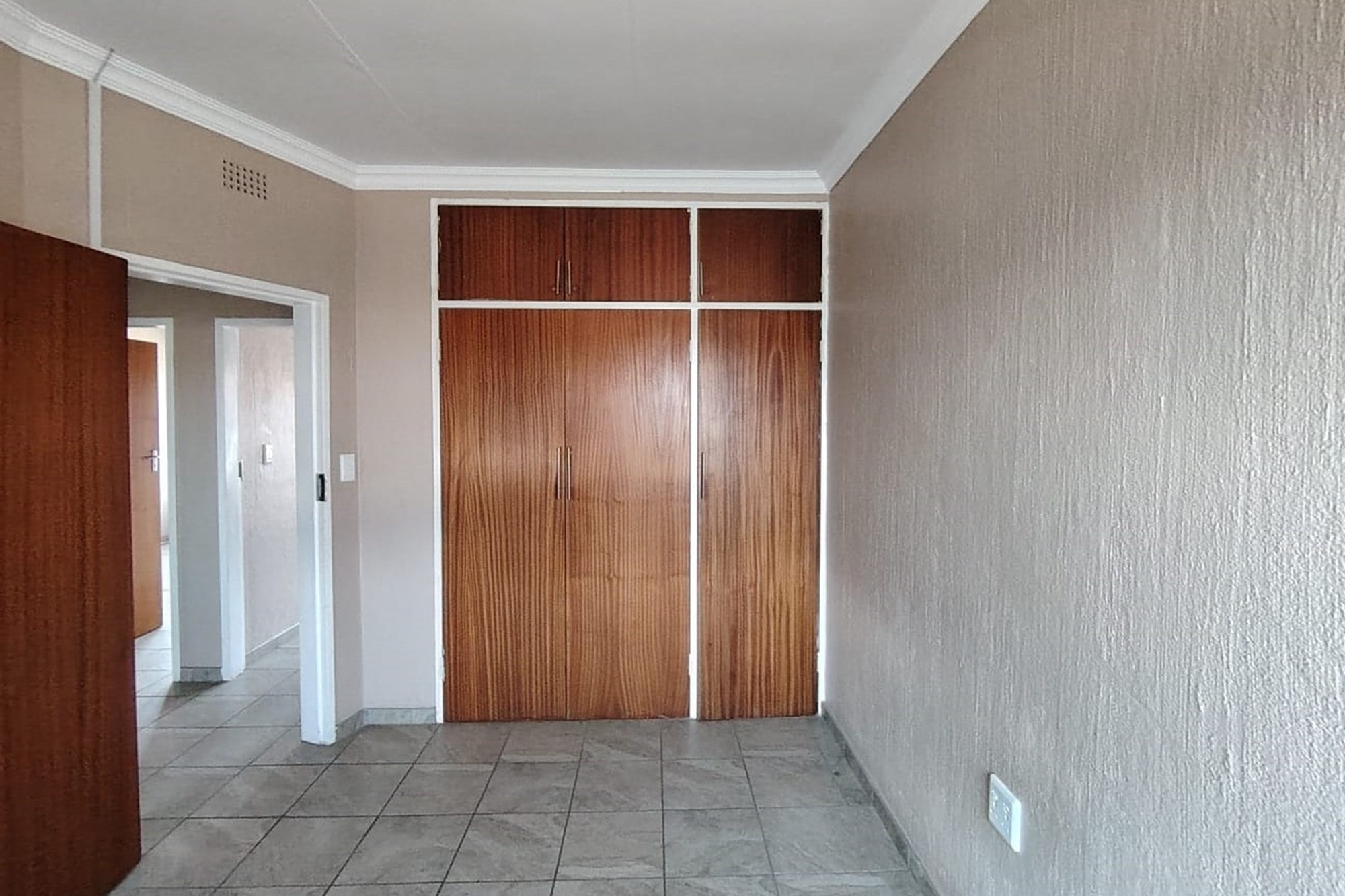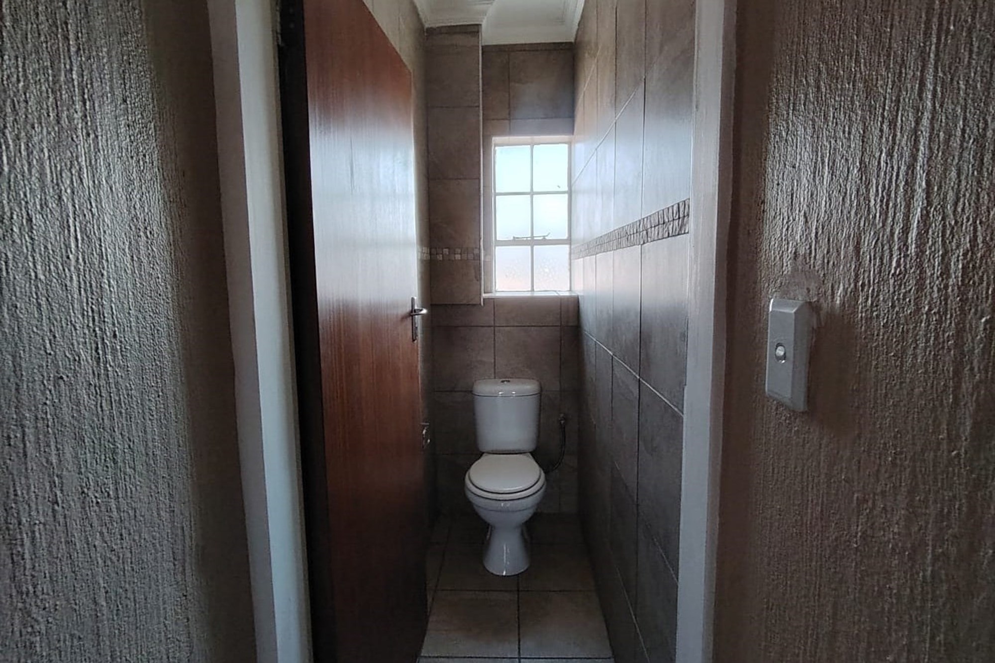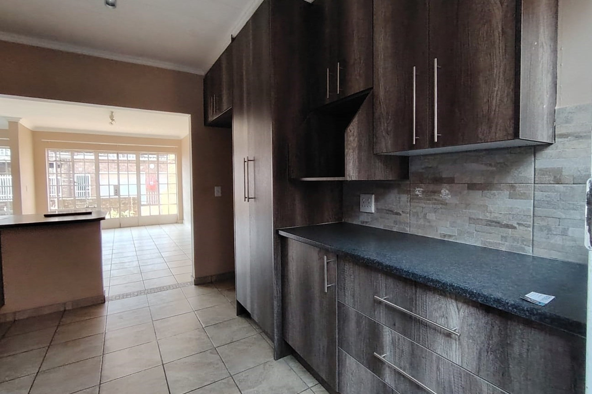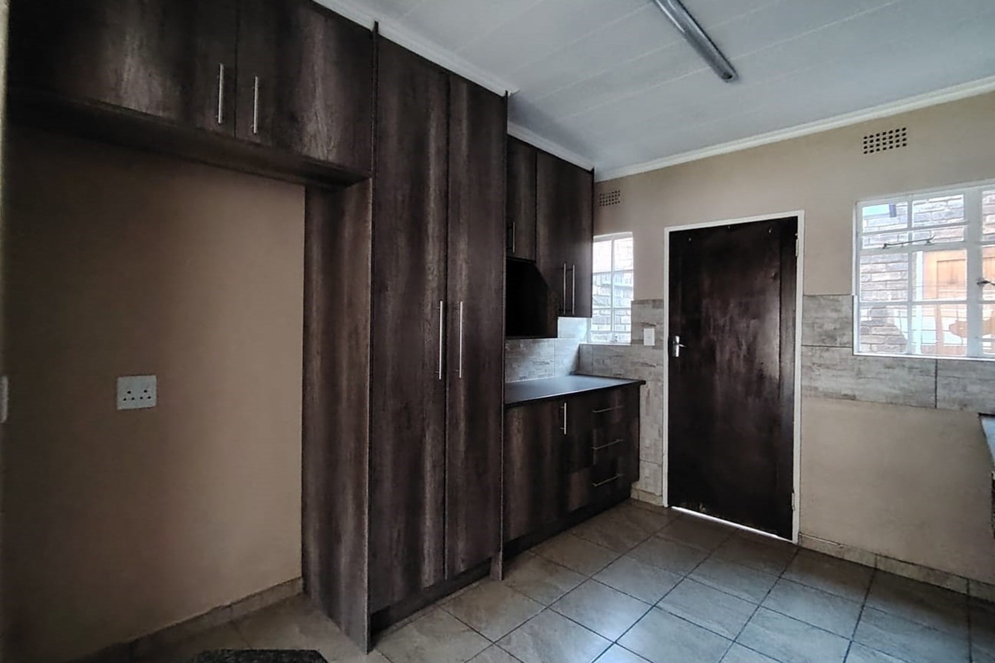 The residence features three generously sized bedrooms, each adorned with built-in cupboards, ensuring ample storage space. A fully tiled bathroom with a separate toilet enhances convenience, complemented by an additional guest toilet with a basin on the lower level.