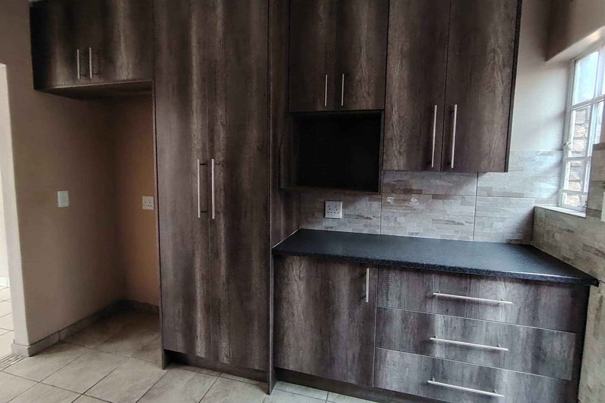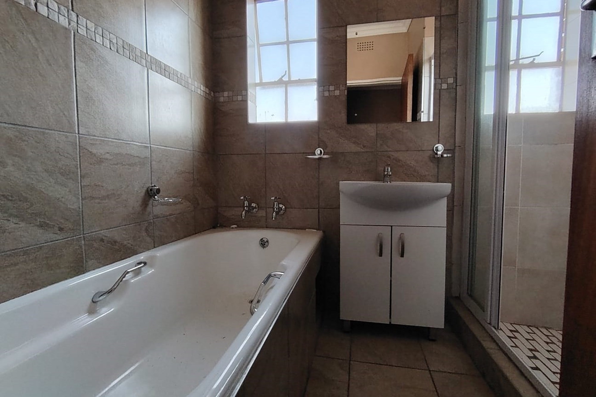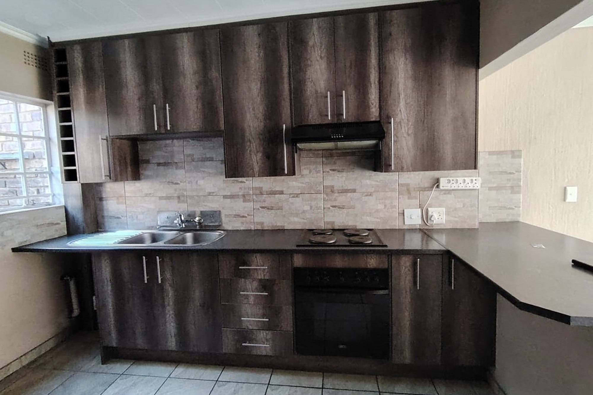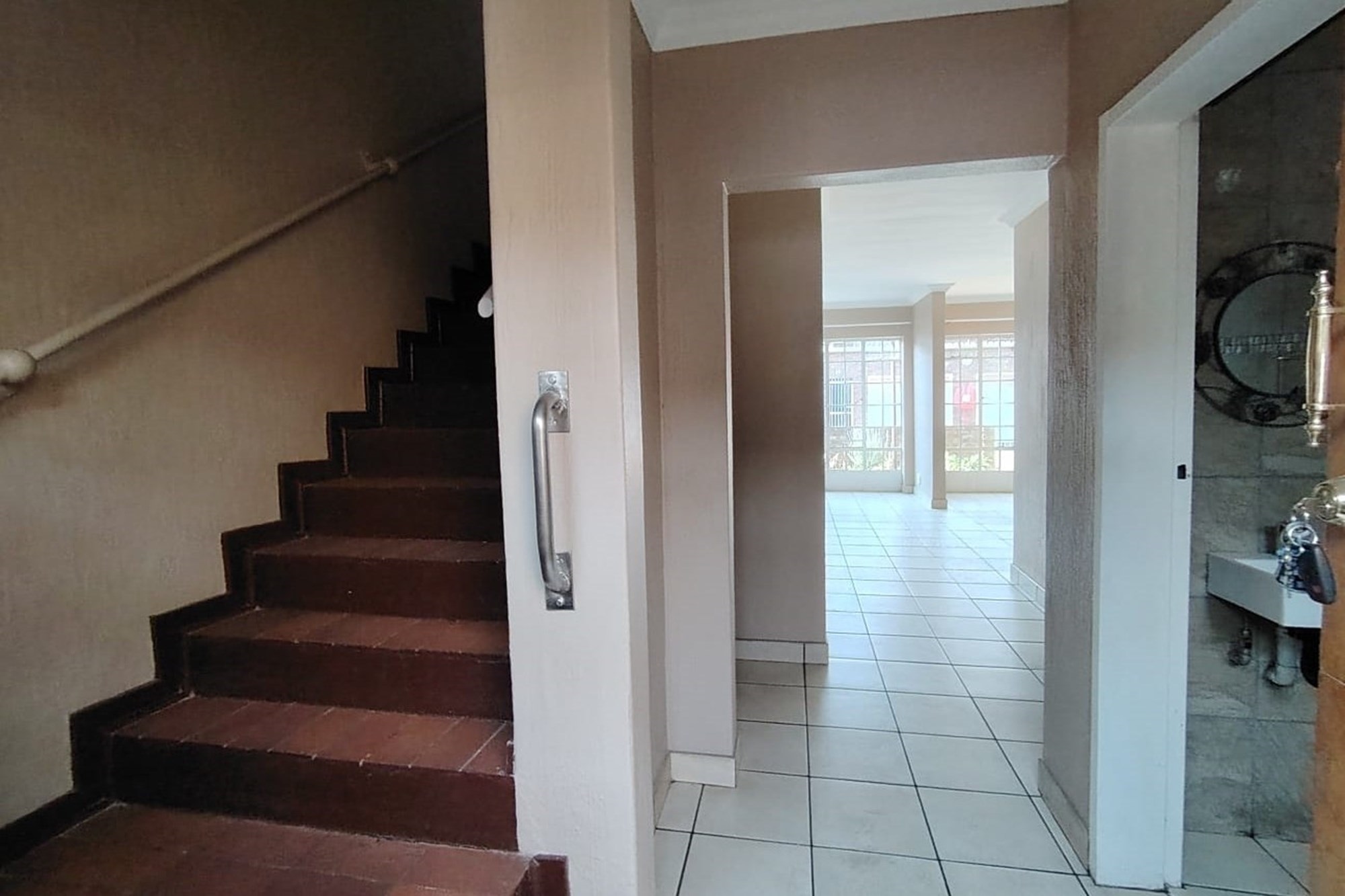The residence features three generously sized bedrooms, each adorned with built-in cupboards, ensuring ample storage space. A fully tiled bathroom with a separate toilet enhances convenience, complemented by an additional guest toilet with a basin on the lower level.