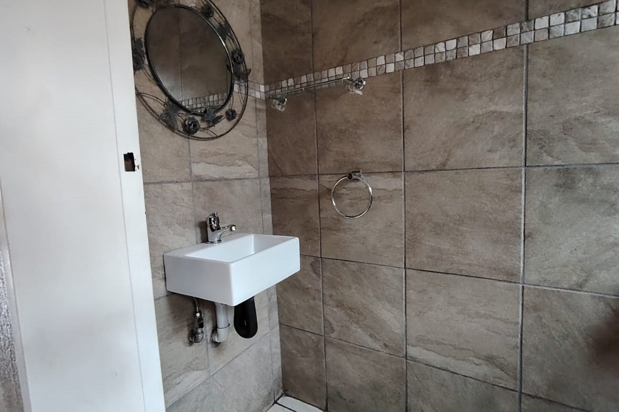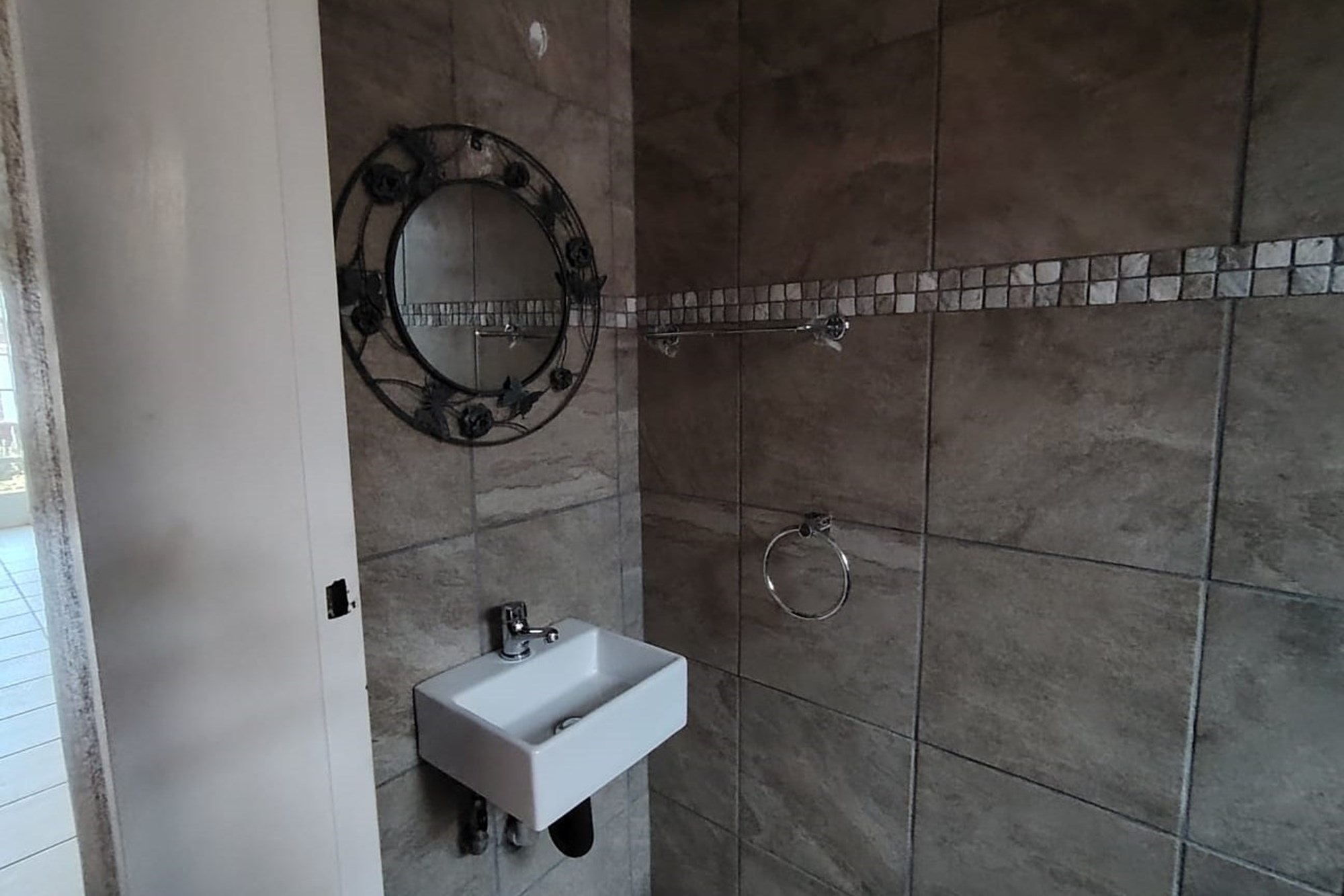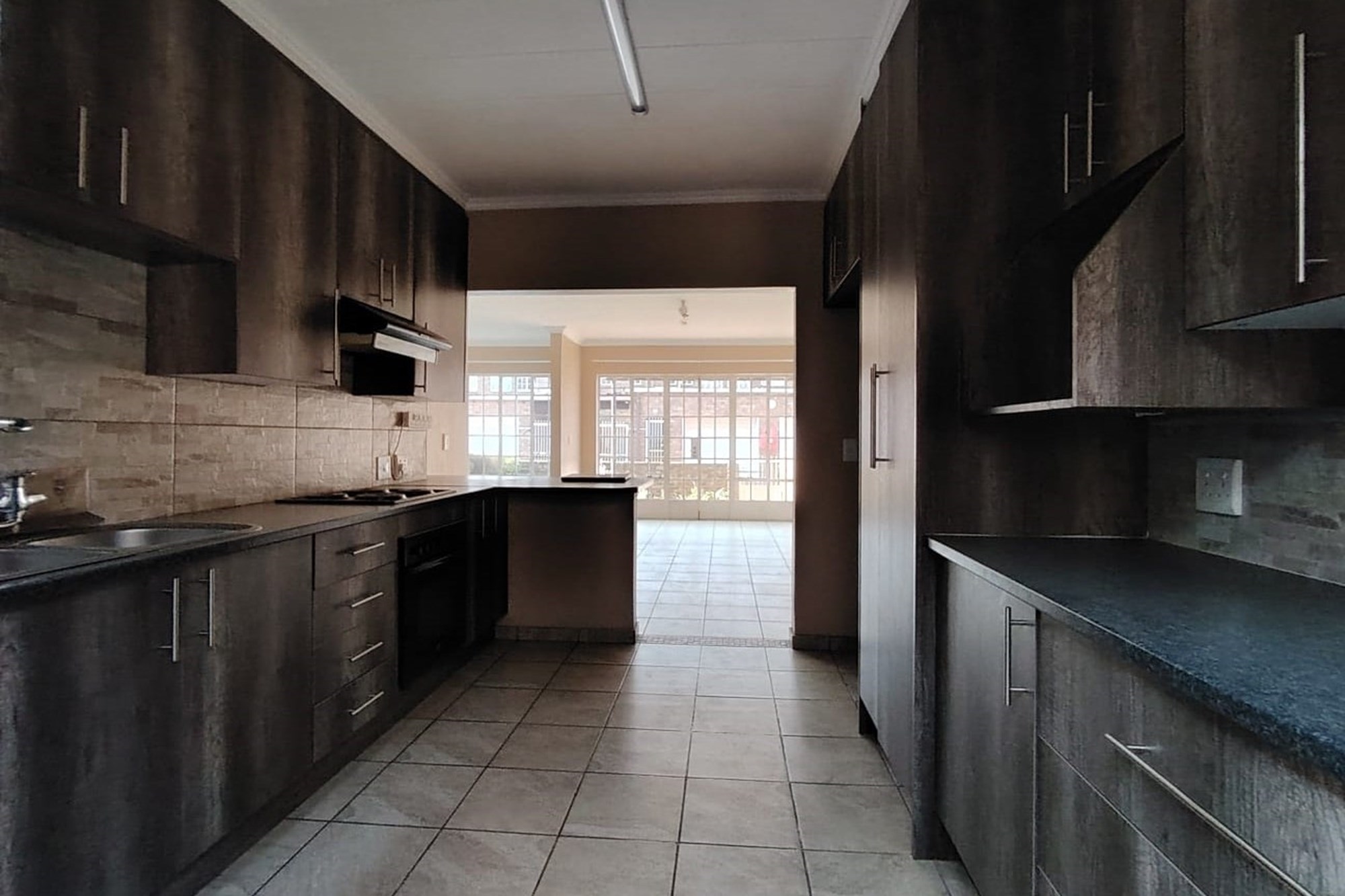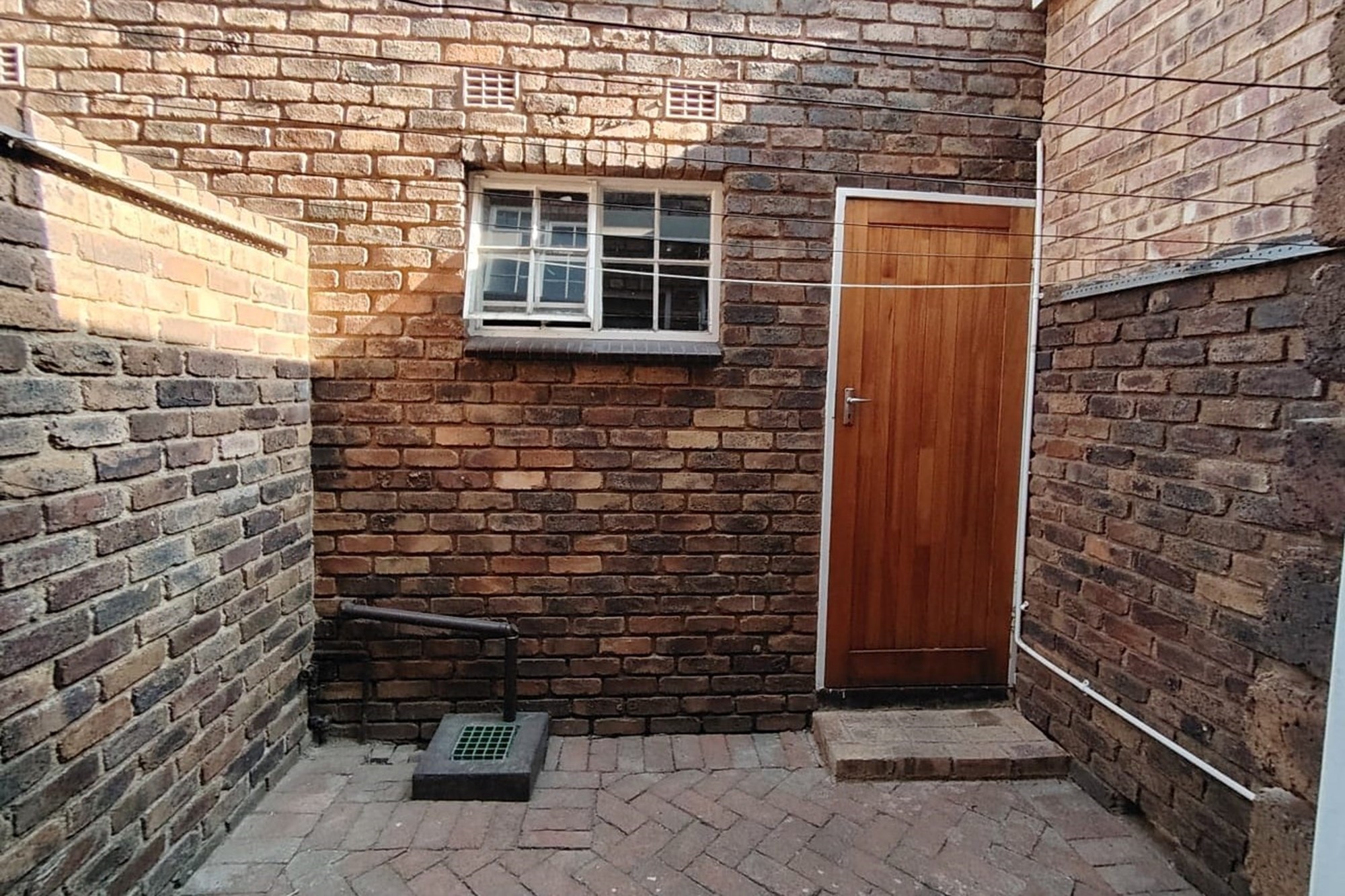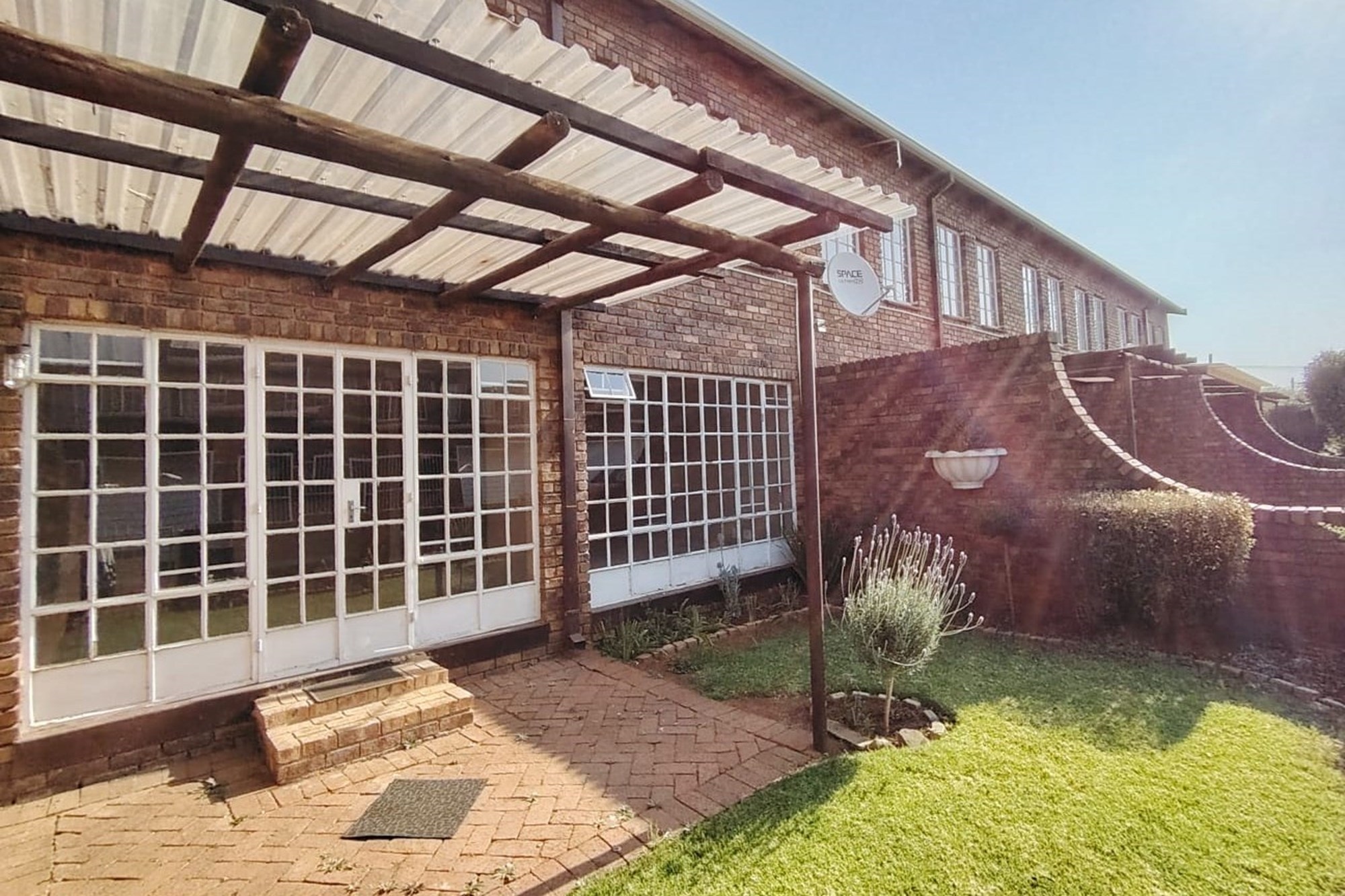 The residence features three generously sized bedrooms, each adorned with built-in cupboards, ensuring ample storage space. A fully tiled bathroom with a separate toilet enhances convenience, complemented by an additional guest toilet with a basin on the lower level.