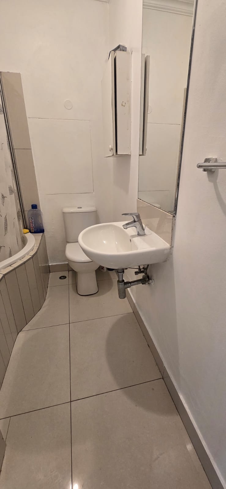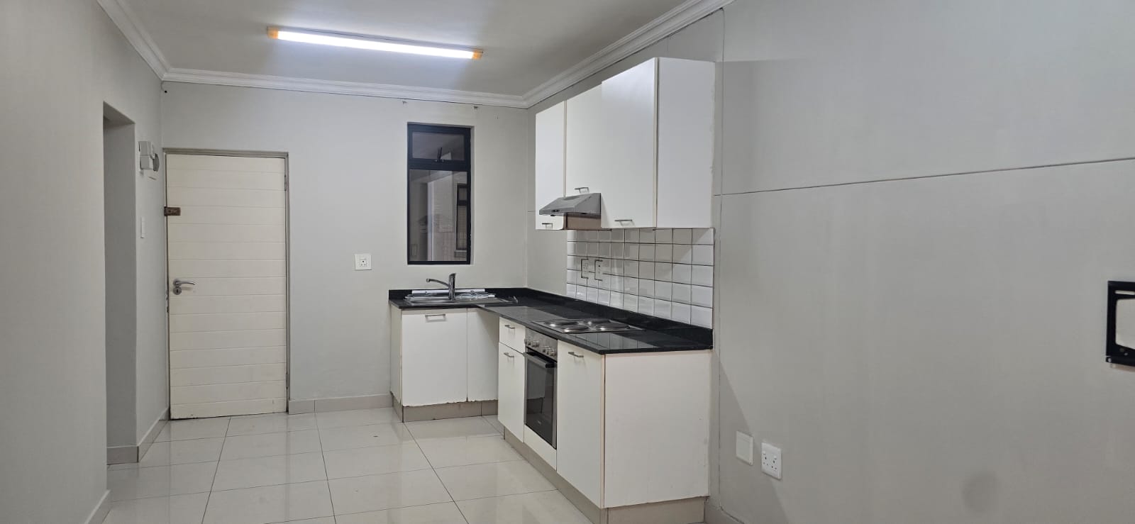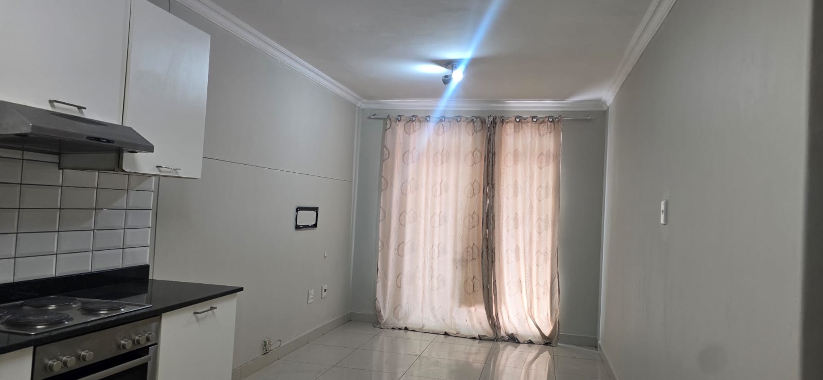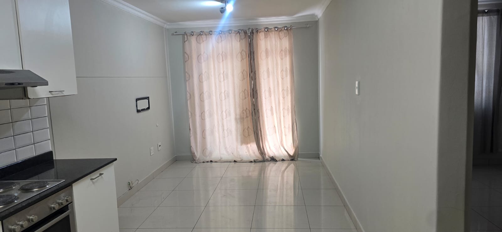 The open-plan living area flows effortlessly into a sleek, fully fitted kitchen with quality finishes. The spacious bedroom features built-in cupboards and large windows that fill the space with natural light, while the contemporary bathroom boasts modern fittings and a refreshing shower.