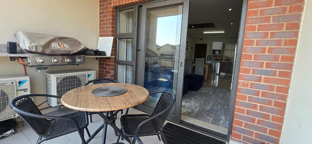 The balcony is ideal for outdoor living, featuring a four-seater round table, a four-burner gas braai with rotisserie, and a built-in side gas stove set on a fixed granite countertop.
