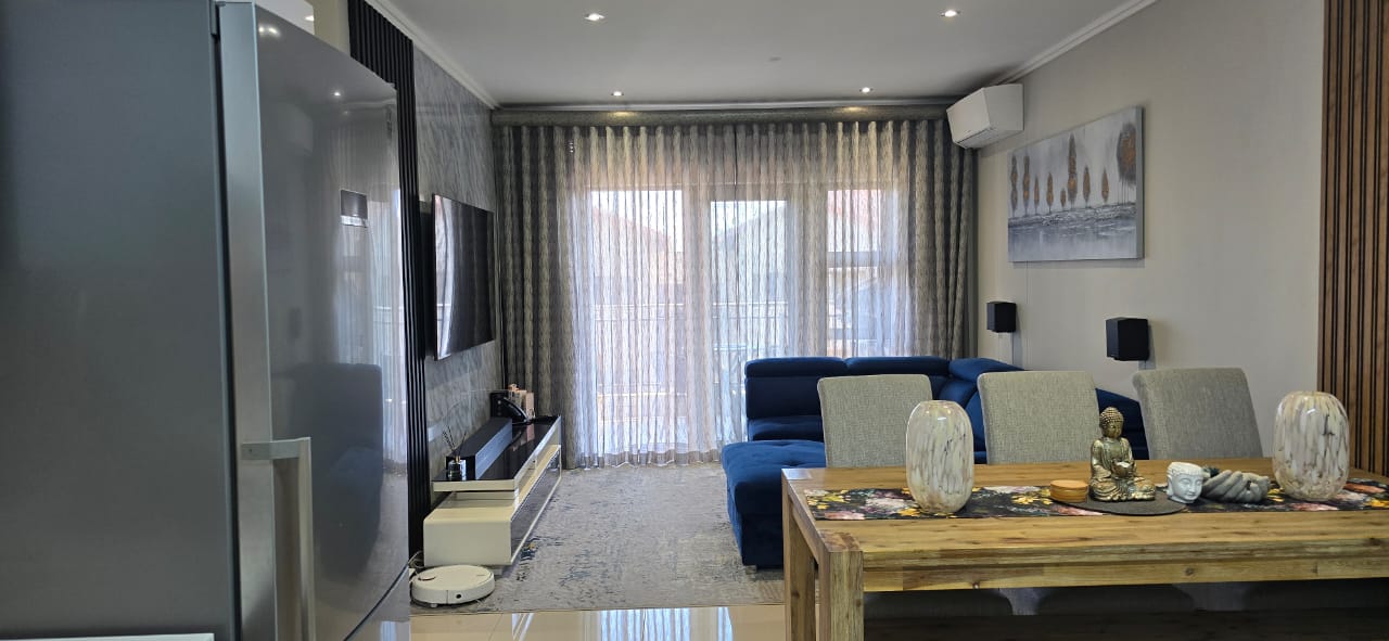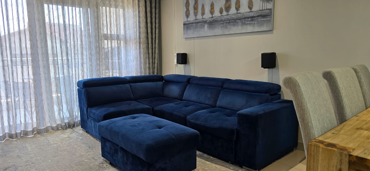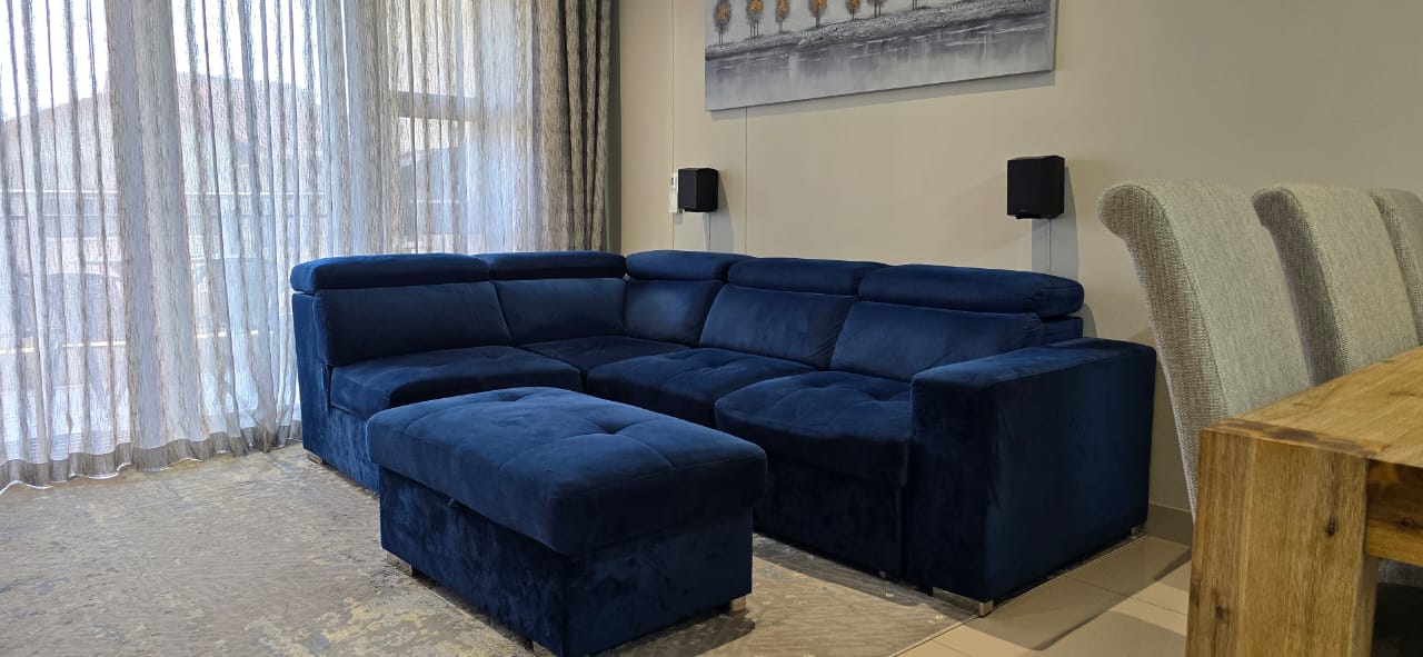 The lounge is elegantly furnished with a Sucasa L-shaped three-seater sleeper couch, full-length sheer and blockout curtains, a Sucasa TV unit, a 65-inch LG QNED 4K 120Hz television, and a Samsung Q990C Atmos soundbar. Comfort is ensured with a Daikin inverter air-conditioning unit featuring motion sensing technology.