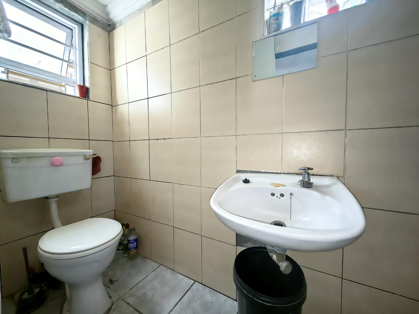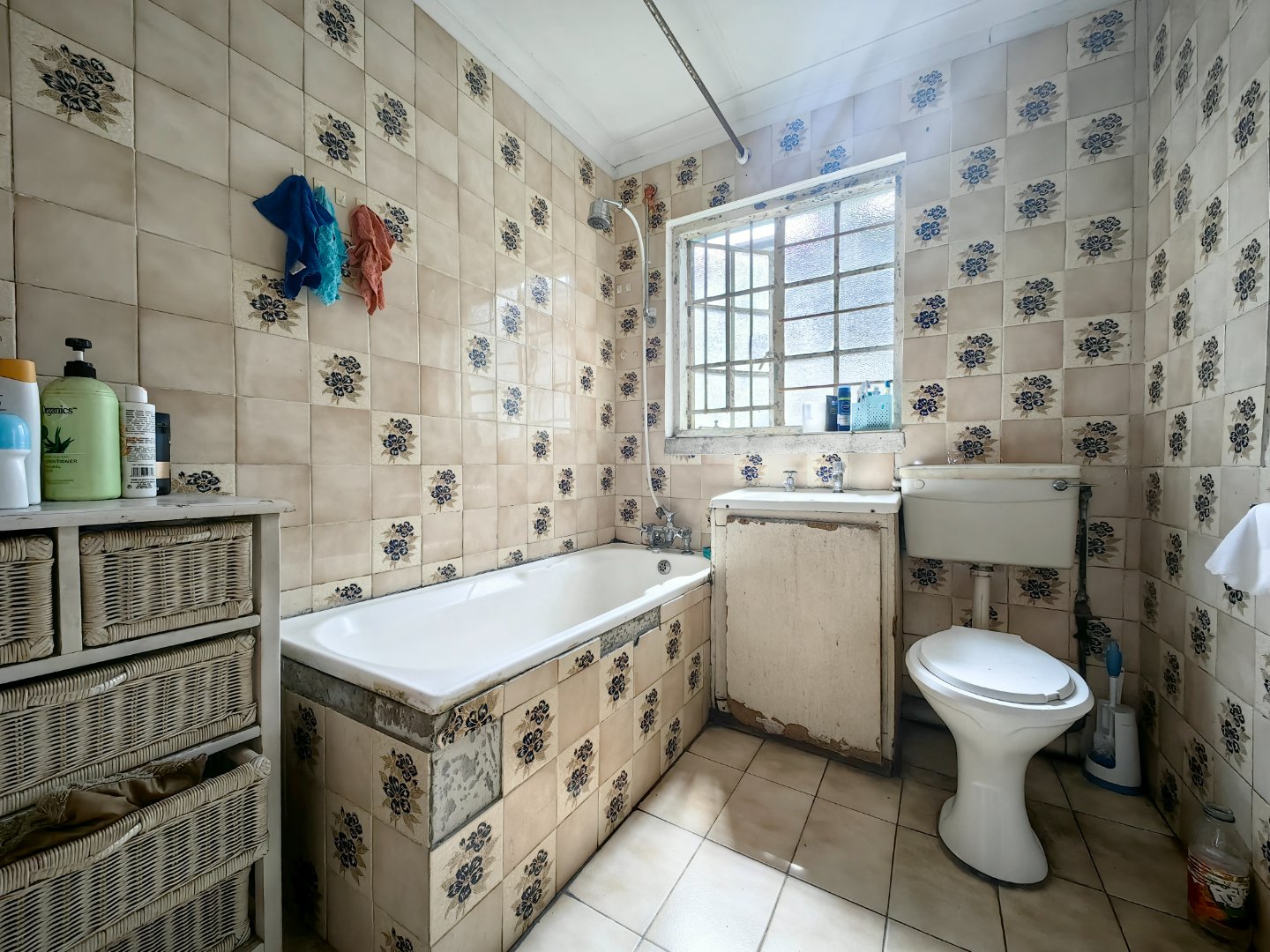 - Fully tiled bathroom with shower over bath
