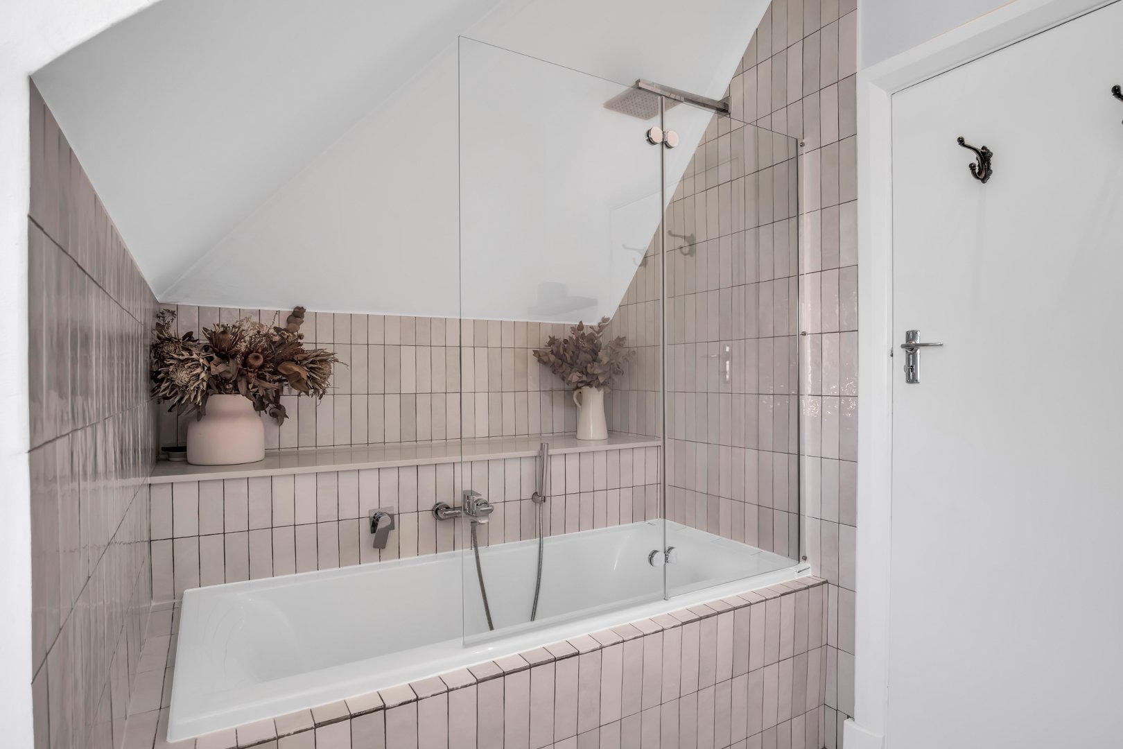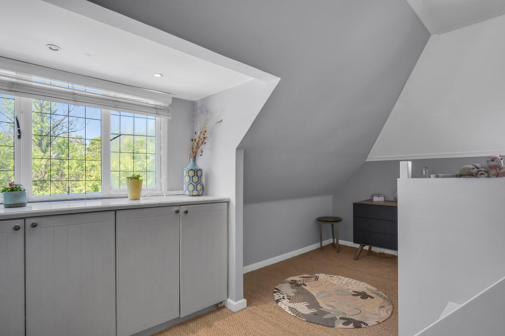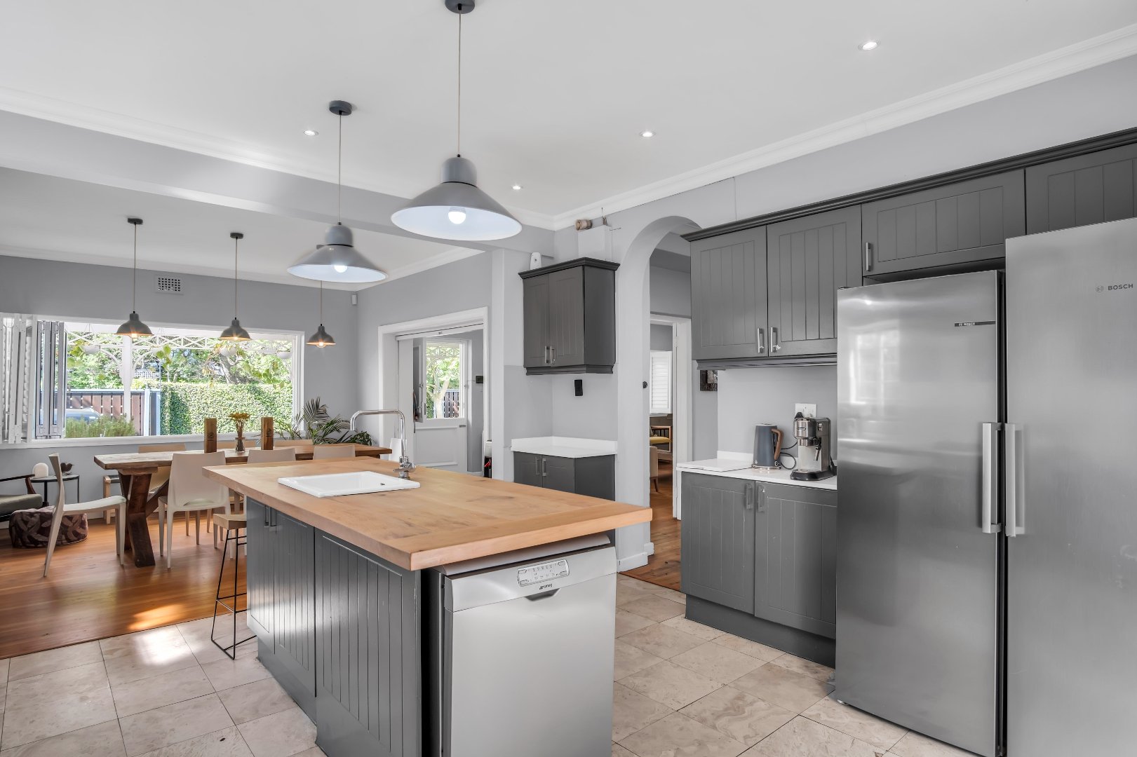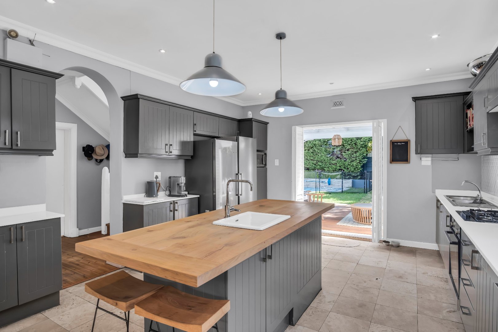 This renovated kitchen is a cook’s dream, with elegant grey cabinetry, a beautiful oak-topped centre island, double sink, gas hob, electric oven and plumbing for a dishwasher. Designed for functionality and style, the kitchen provides everything needed to entertain or enjoy family meals.