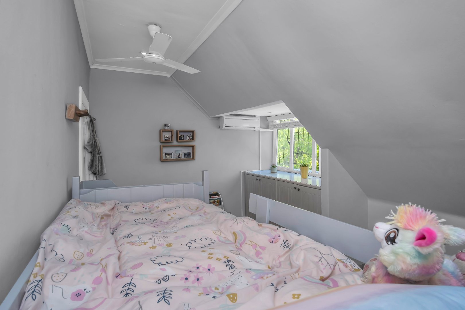 Two additional air-conditioned bedrooms are located upstairs, each with built-in cupboards. This level also includes a convenient linen cupboard, a tastefully updated bathroom (with shower over bath and basin), and a separate toilet.