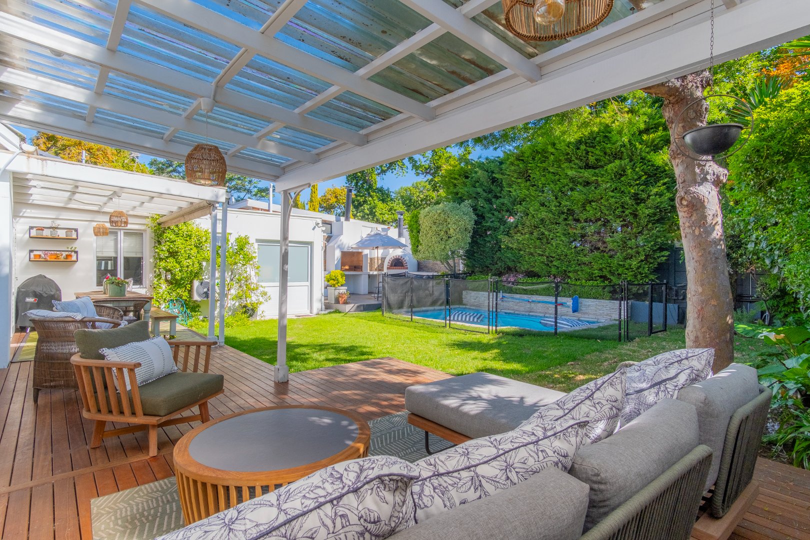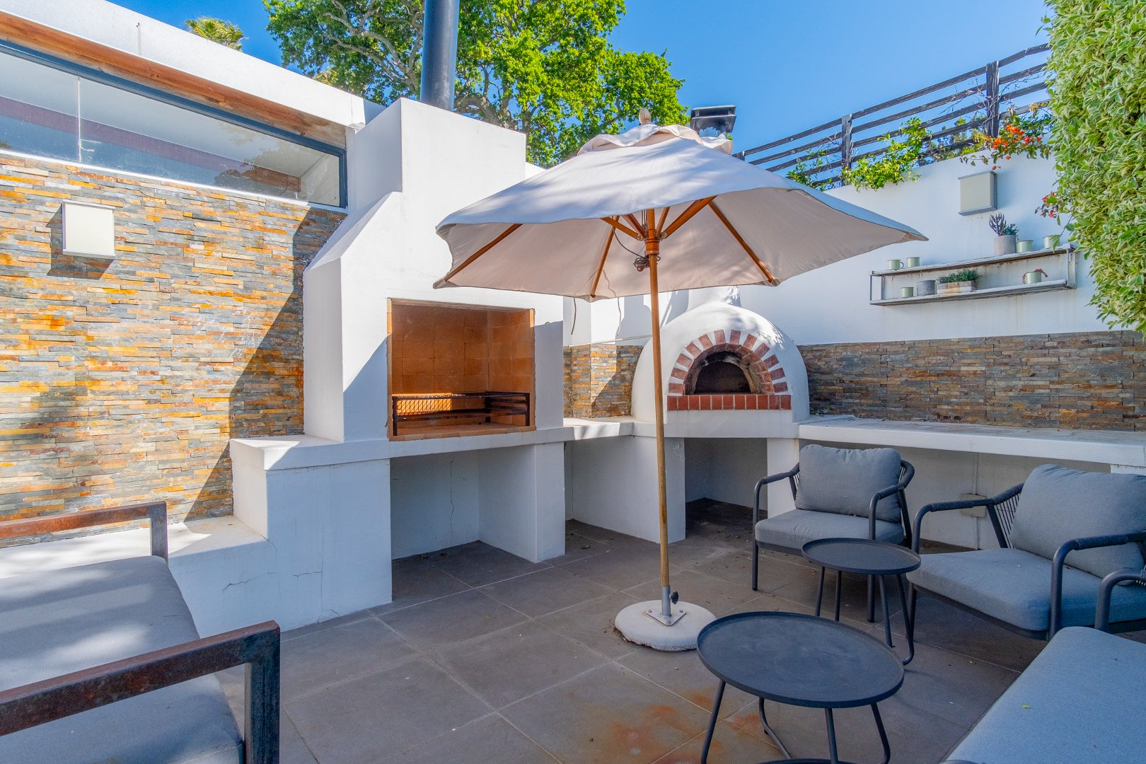 The covered lounge and dining areas overlook the garden and pool and an additional raised patio, complete with a built-in braai and pizza oven, creates yet another perfect setting for al fresco dining and summer gatherings.