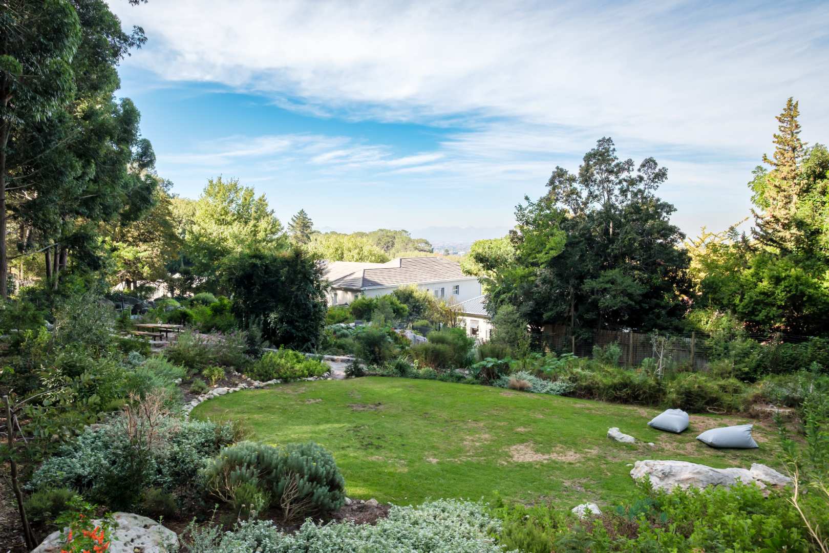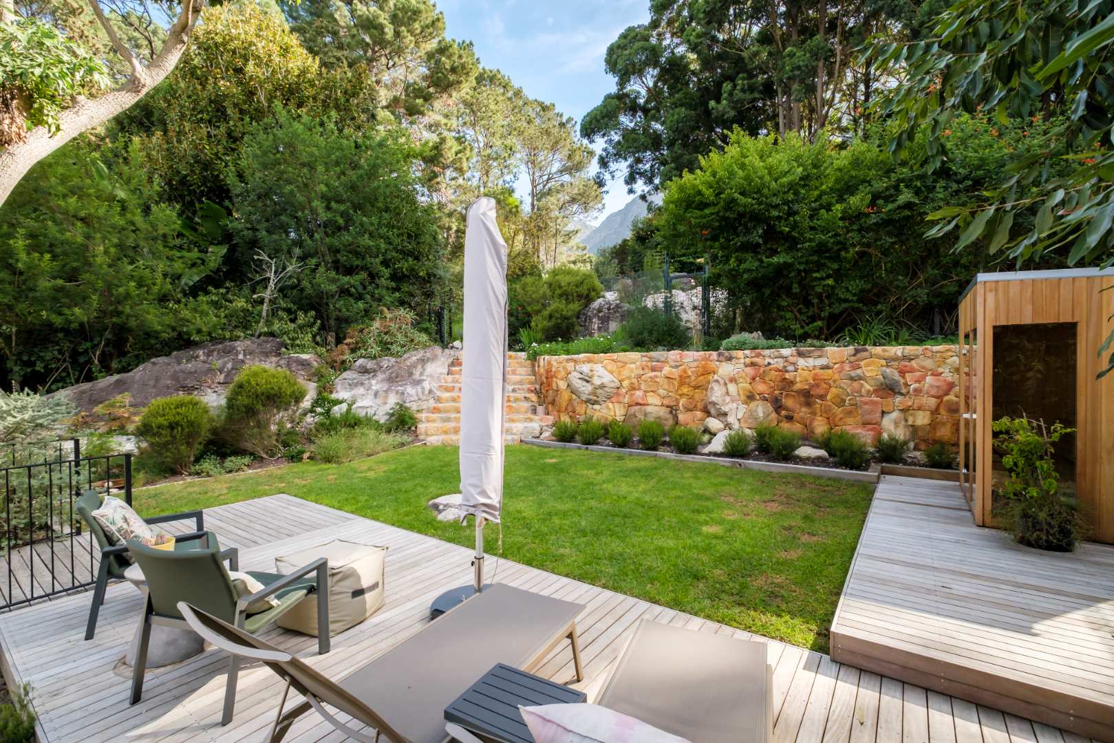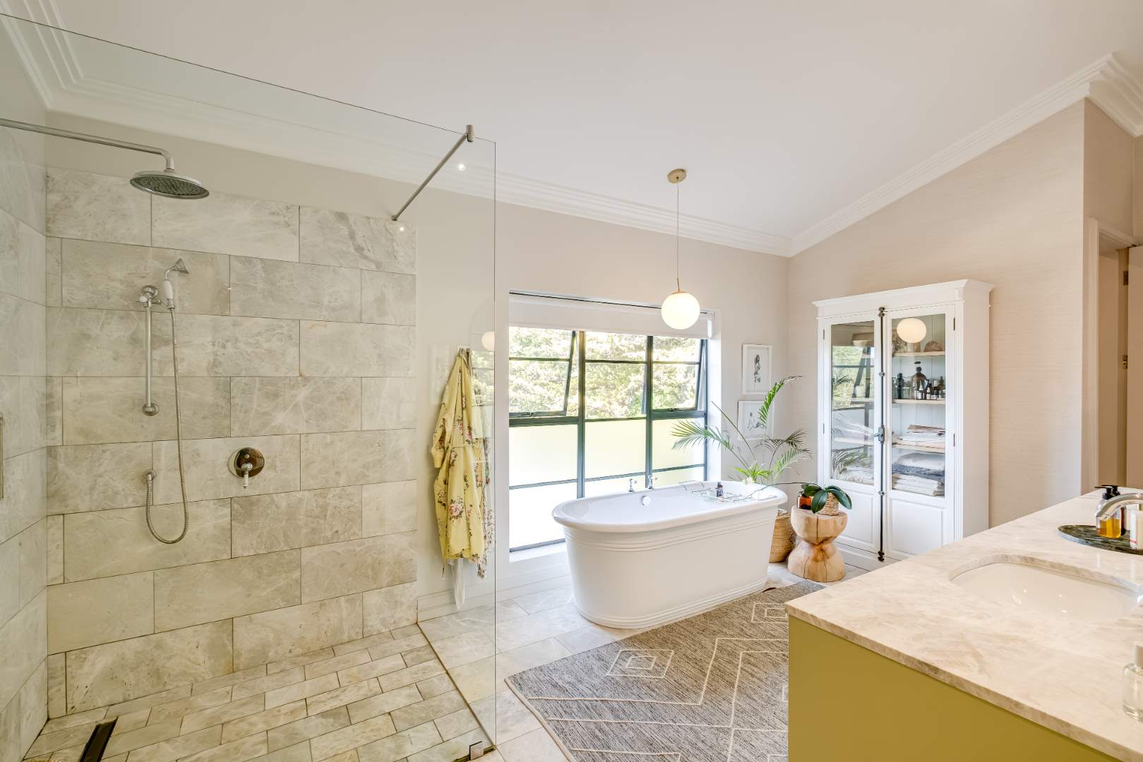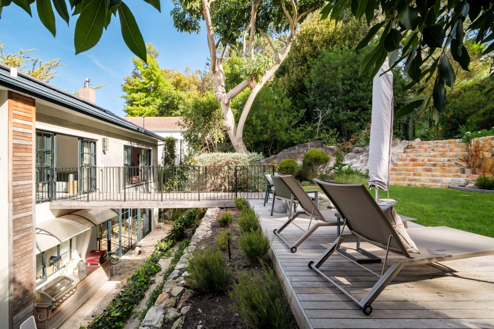 The kitchen, a culinary space to be appreciated with an eye to every detail that you explore. Flamed and brushed granite counter tops, Oak Veneer carpentry, integrated fridge and freezer, free standing gas stove and electric oven, granite backsplash and transparent glassware display cabinet to name a few, interleading to a tucked away scullery with all the necessities and more. A built-in gas braai and pizza oven are ideally located just outside the kitchen, again creating convenient and functional entertainment.