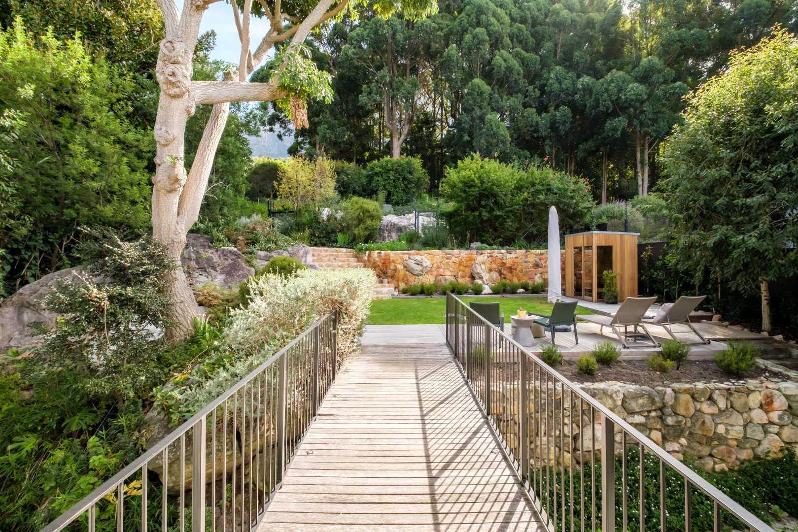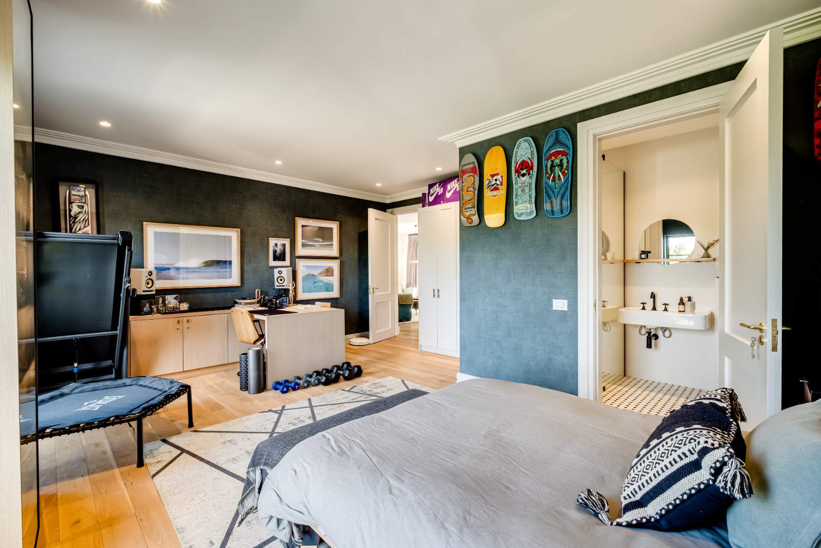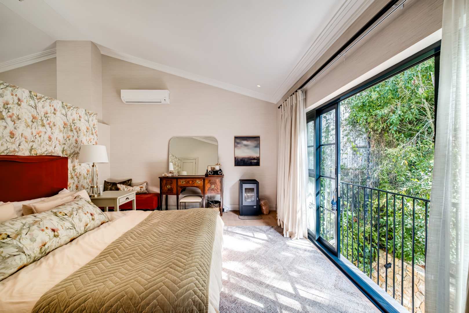 Offering 4 generously sized bedrooms all with private Victorian bathrooms, all fitted with solid oak flooring, specifically selected textured or pattered wallpaper, as well as personalised fixtures that suit the style or theme of each individual room. 3 of these bedrooms exist on the second floor with a central study landing at the top of the stairs, and a spotless pyjama lounge flowing seamlessly over the bridge to the west facing garden, sun-lounger deck, brand new sauna and extensive forest garden. The master suite with a pure nature outlook from your very own bed over the Juliette balcony also offers a lavish dressing room, an electric pellet fireplace, marble bathroom tiles, heated towel rails and chrome faucets. The 4th guest bedroom is located downstairs with doors flowing outside, a marble vanity, electric towel rails and aesthetic wood panelling effortlessly dividing the space.