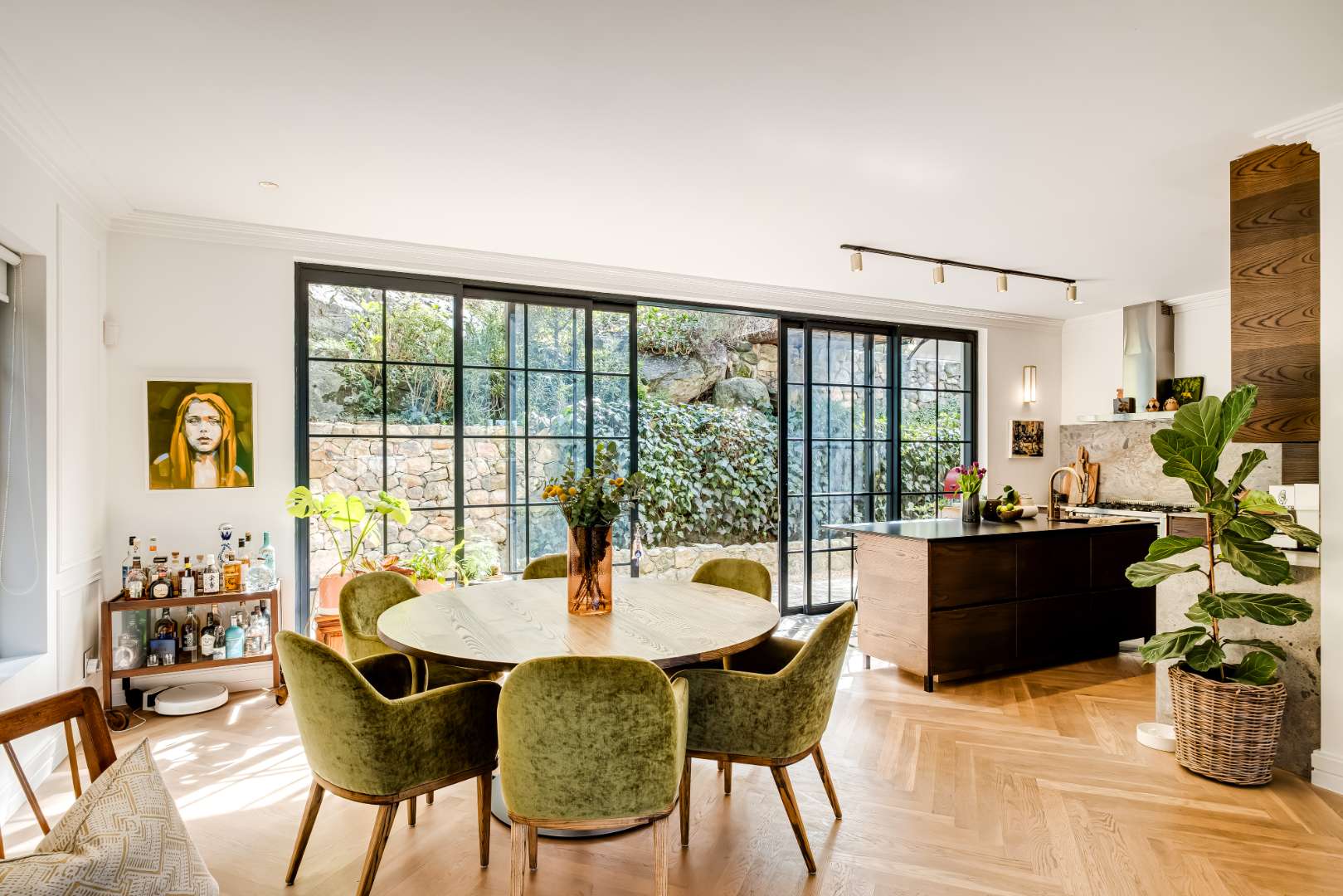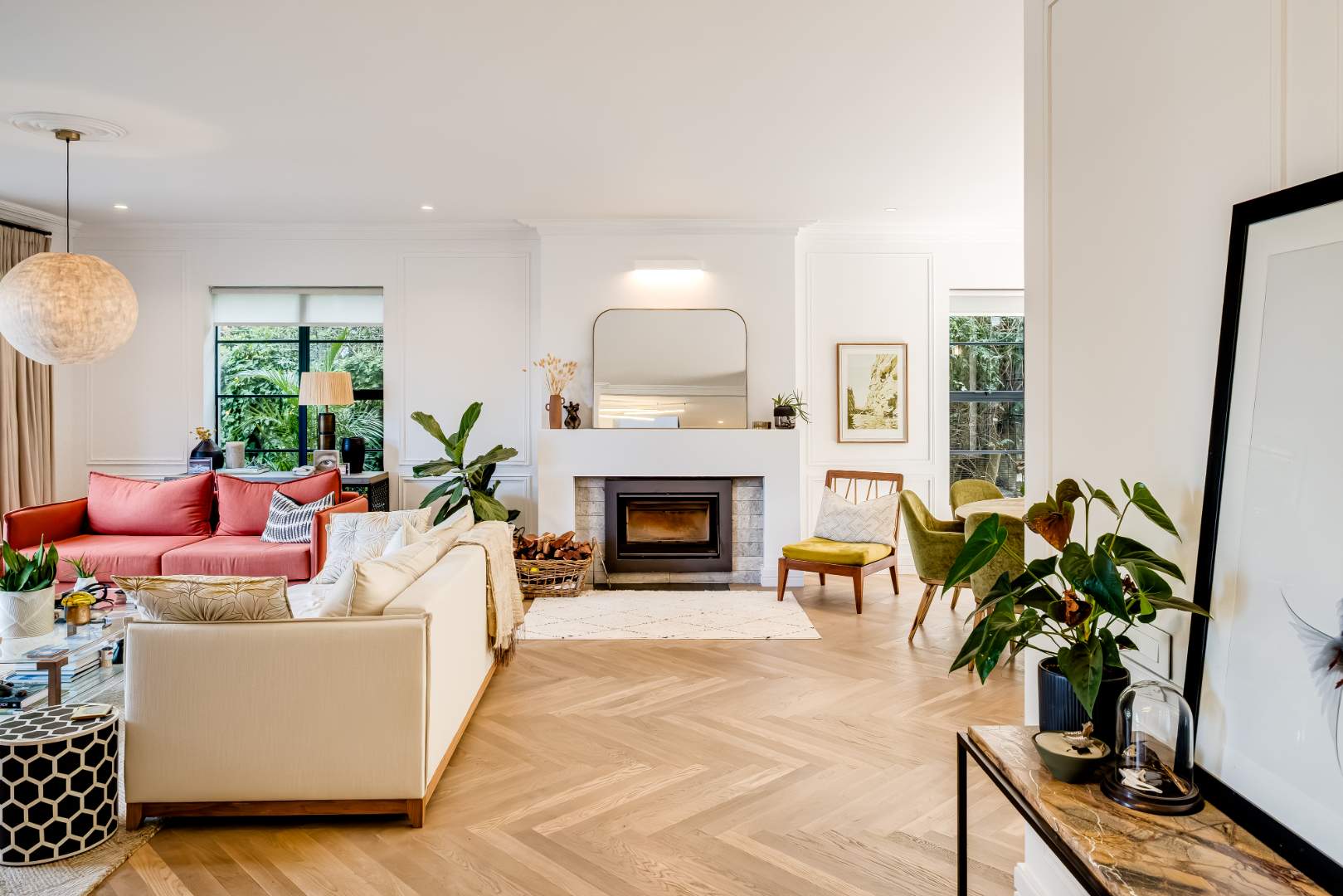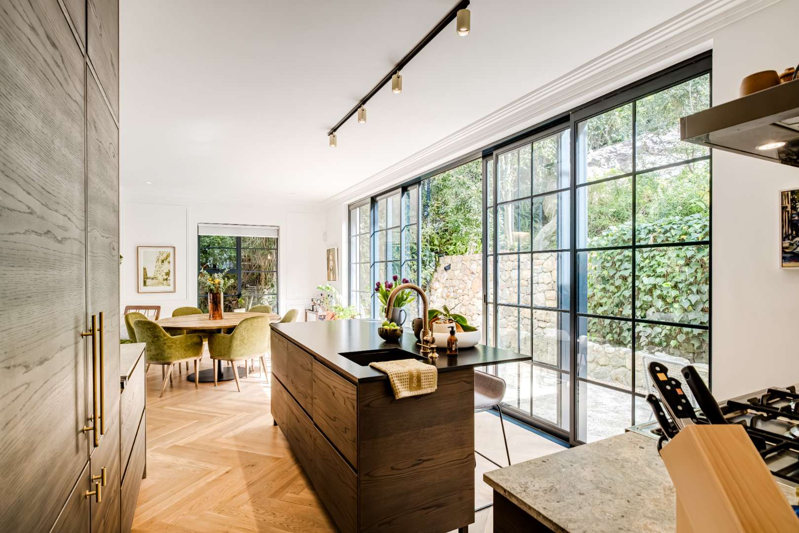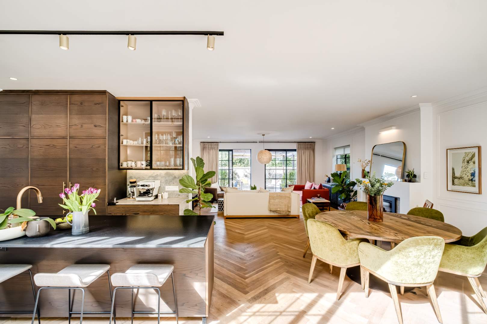 The formal lounge downstairs is free flowing to the dining area and kitchen, however captures space of its own by leading through solid brass doors to a Pergola covered outdoor lounge creating a natural retreat set amongst verdure. The dining and kitchen exist collectively, guaranteeing efficient and practical entertainment space, and a Carbel electric wood burner insures a warmth throughout the cooler months, the finest of its kind. All downstairs living spaces are fitted with solid oak flooring in Herringbone design that has stood the test of time creating exquisite upmarket living.