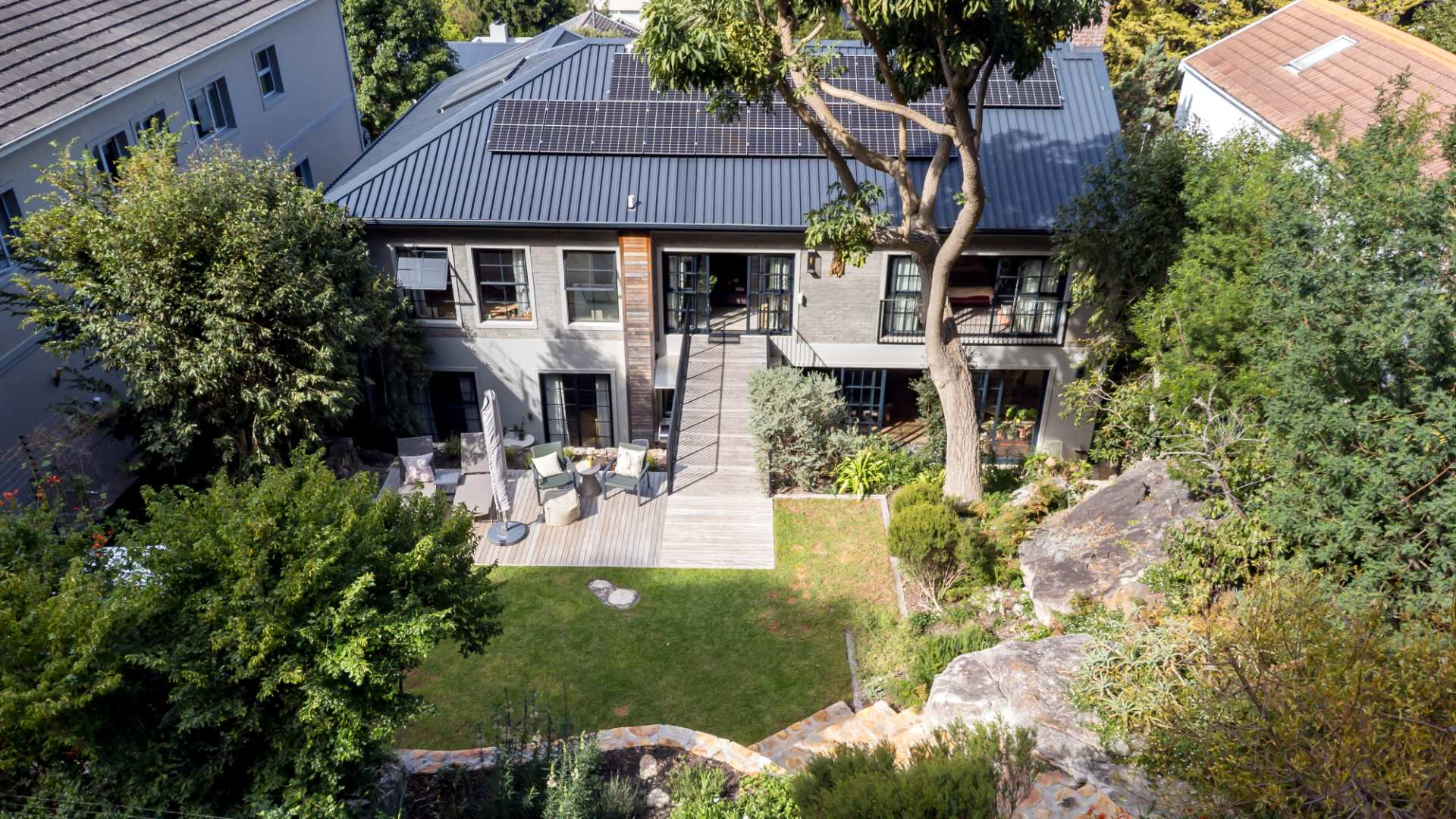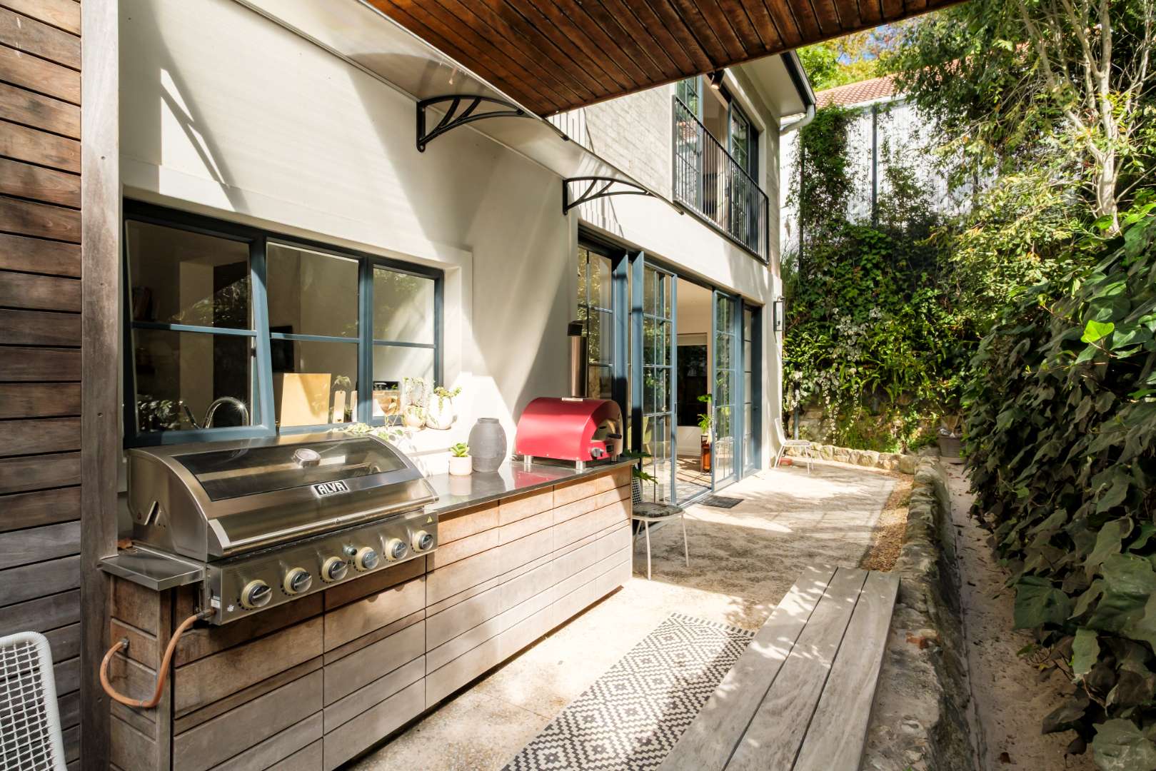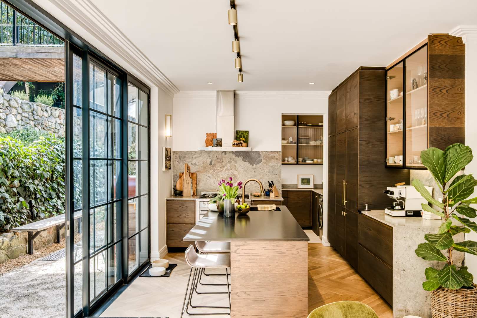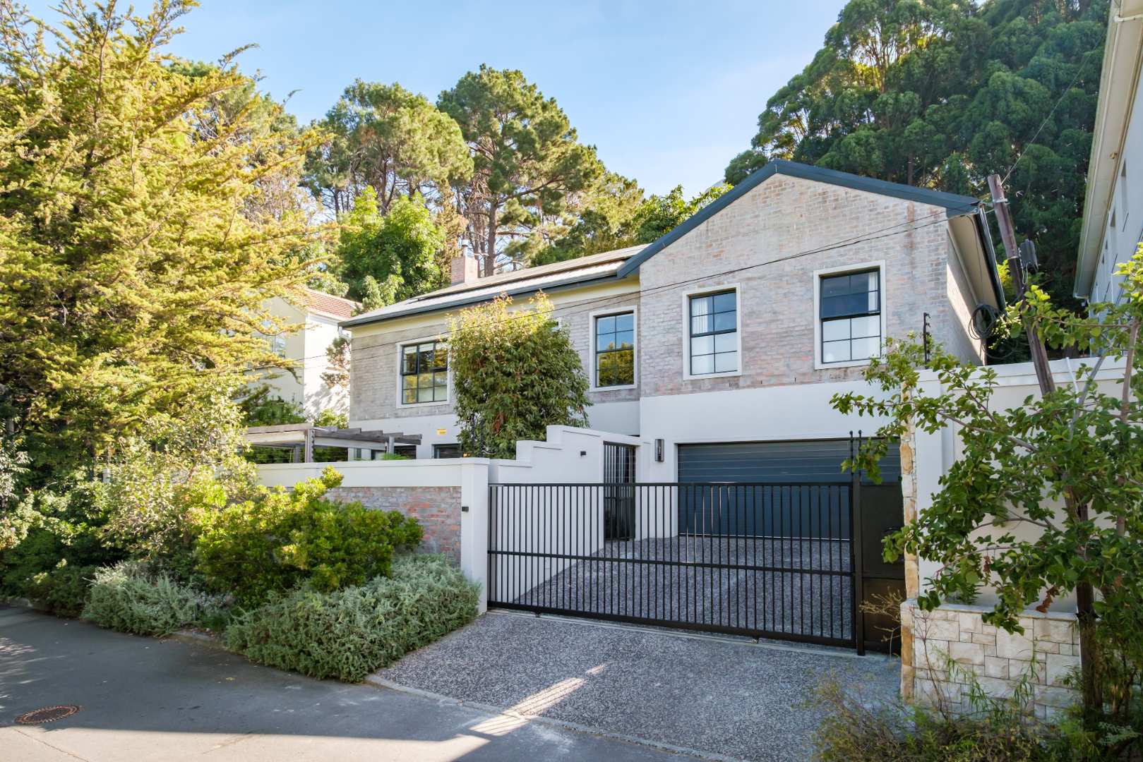 The formal lounge downstairs is free flowing to the dining area and kitchen, however captures space of its own by leading through solid brass doors to a Pergola covered outdoor lounge creating a natural retreat set amongst verdure. The dining and kitchen exist collectively, guaranteeing efficient and practical entertainment space, and a Carbel electric wood burner insures a warmth throughout the cooler months, the finest of its kind. All downstairs living spaces are fitted with solid oak flooring in Herringbone design that has stood the test of time creating exquisite upmarket living.