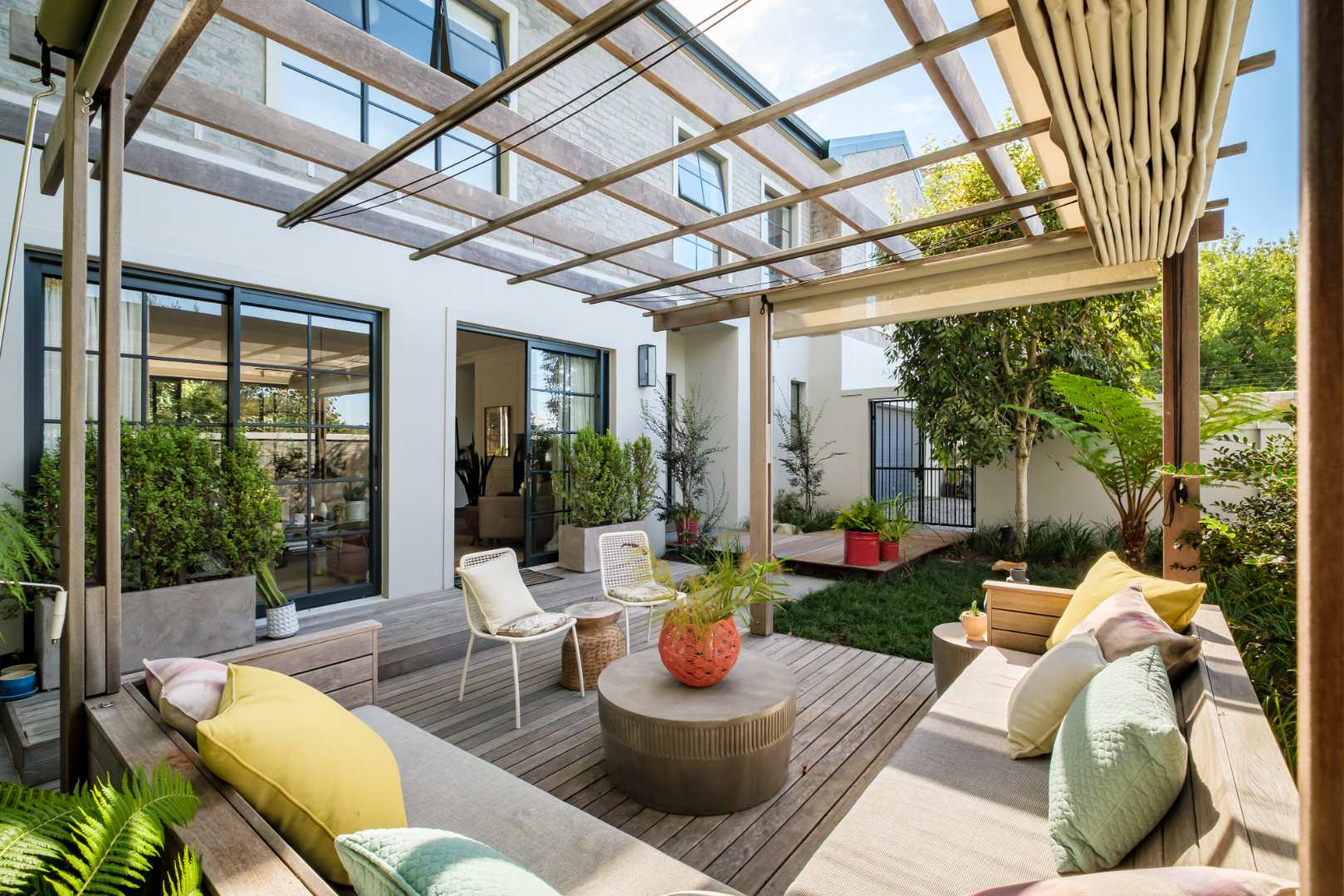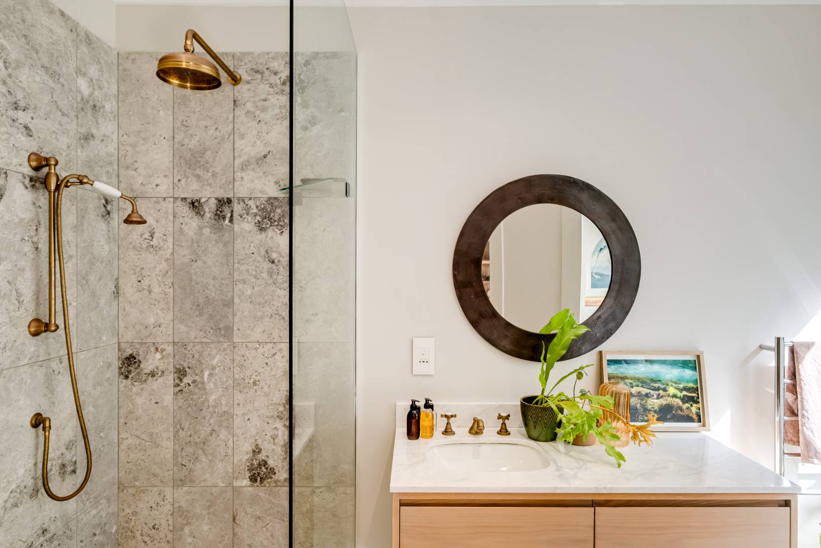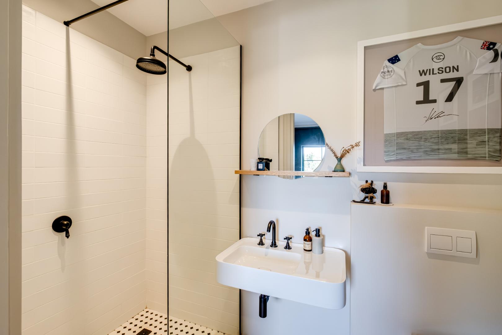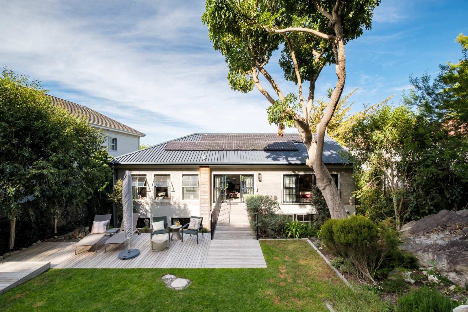 The formal lounge downstairs is free flowing to the dining area and kitchen, however captures space of its own by leading through solid brass doors to a Pergola covered outdoor lounge creating a natural retreat set amongst verdure. The dining and kitchen exist collectively, guaranteeing efficient and practical entertainment space, and a Carbel electric wood burner insures a warmth throughout the cooler months, the finest of its kind. All downstairs living spaces are fitted with solid oak flooring in Herringbone design that has stood the test of time creating exquisite upmarket living.