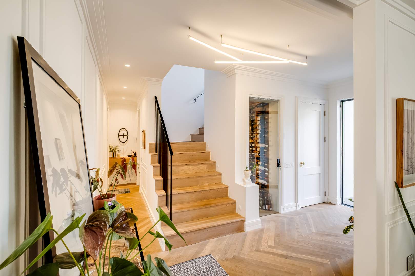 The entrance hall, often not worth discussion but in this case well worth a mention – with a glass feature walk in wine cellar as well as a guest cloak room fitted with Victorian Bathroom fixtures.