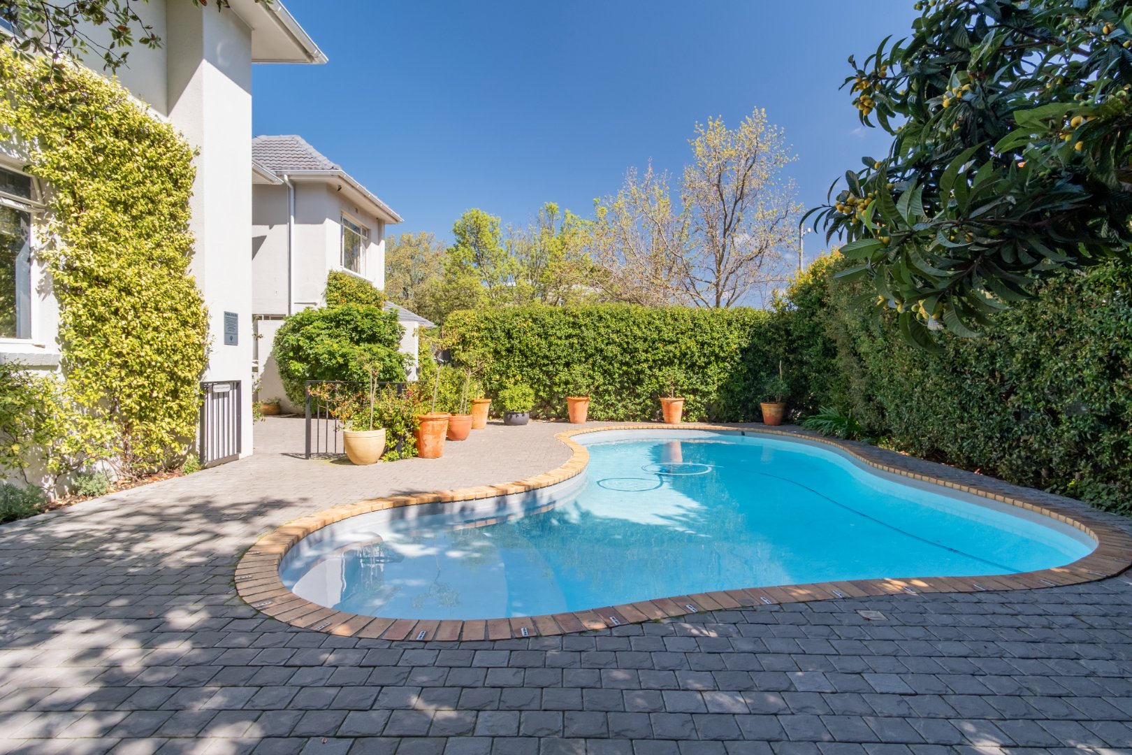 - A large fibre-lined swimming pool set in a landscaped, irrigated garden with water feature