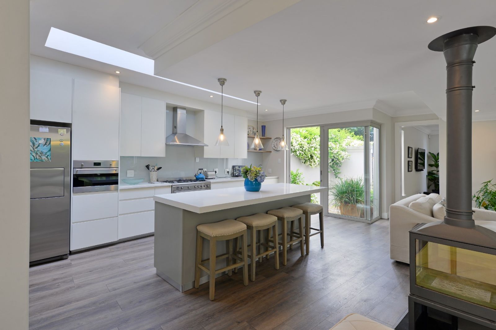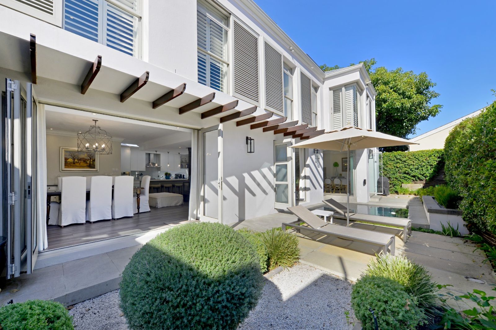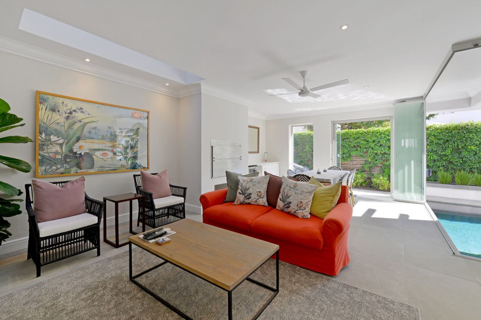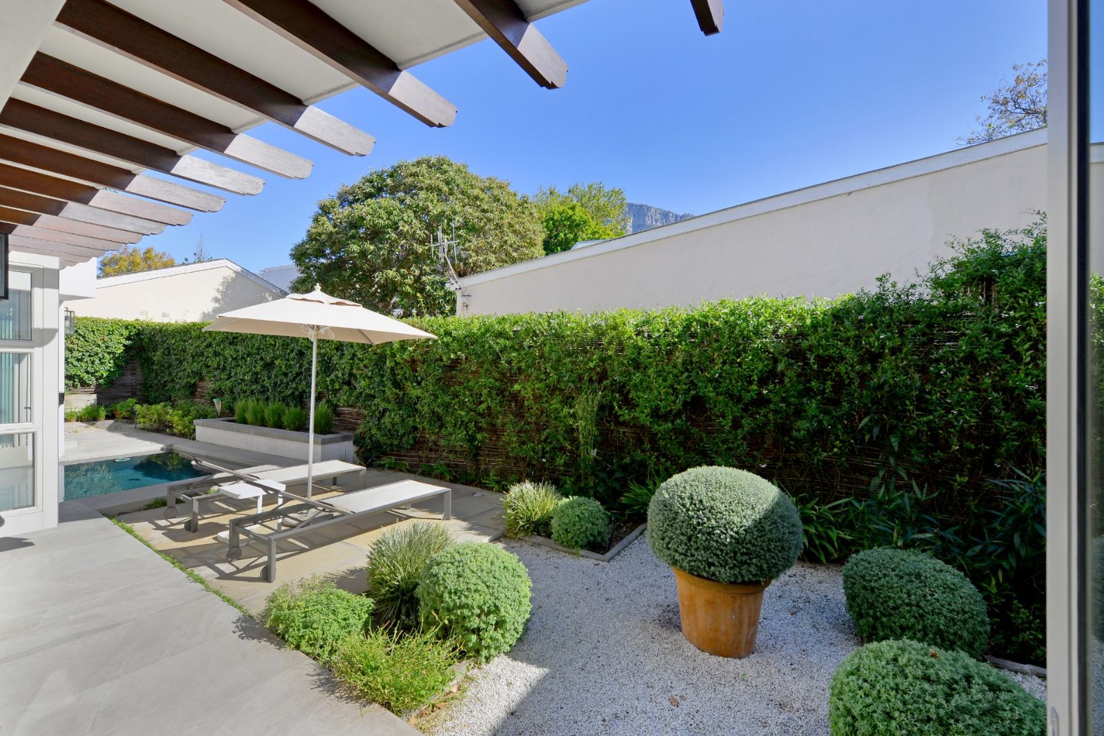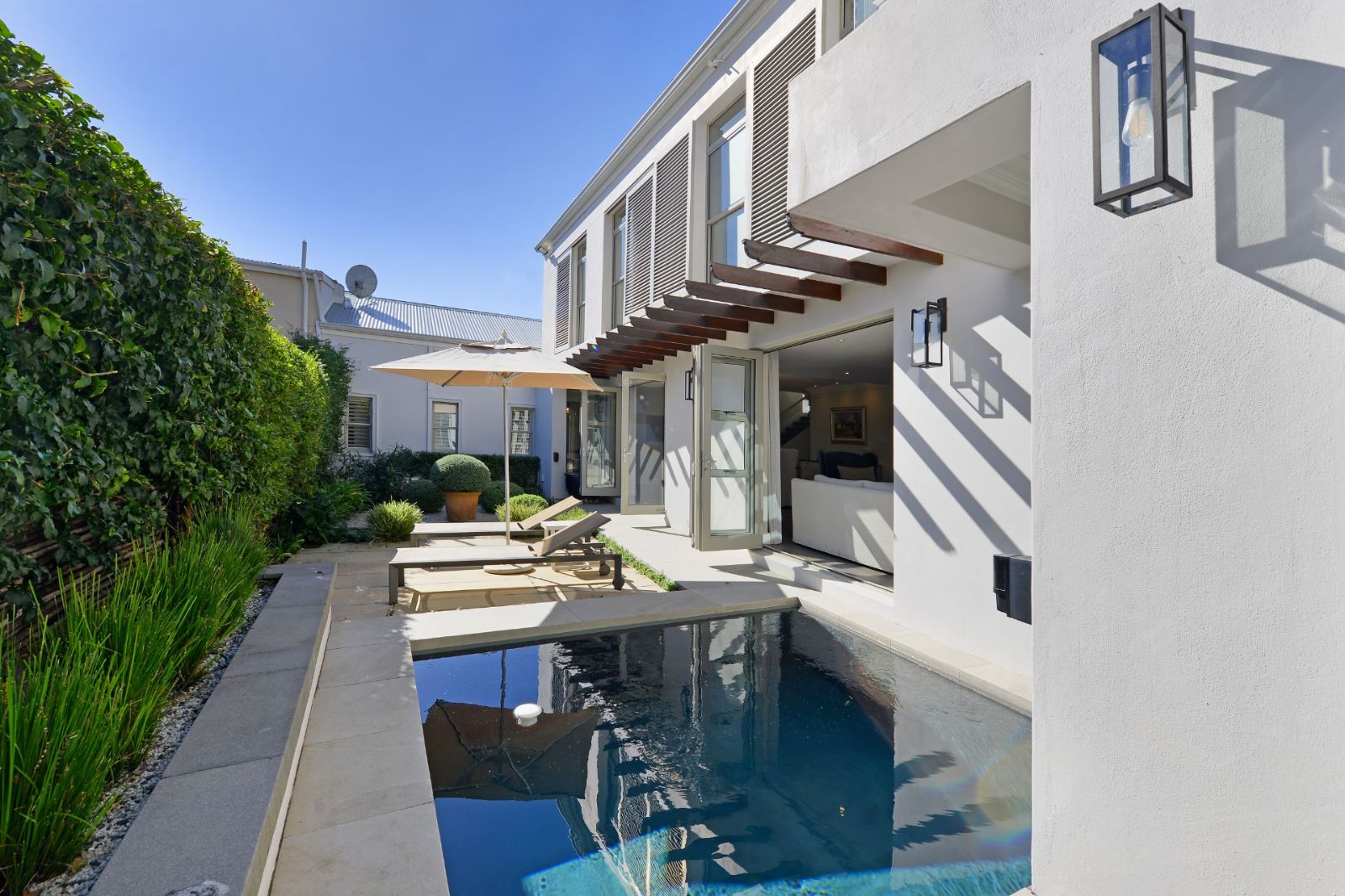 Recently built, this modern home is the epitome of chic lock-and-go in the heart of Newlands Village, equipped with every carefully thought-out modern convenience such as solar electricity backup and rainwater harvesting, filtration and storage. The open plan living room is the heart of the home, and has expansive openings to the landscaped courtyard and pool deck with mountain views. The adjacent TV room / enclosed patio caters for more informal entertaining or the Sunday braai irrespective of the weather, complete with the swimming pool within the living area with frameless glass enclosure. Natural light floods the fitted kitchen through skylights. Upstairs the main bedroom is en suite with a full bathroom in glass walls and dressing room. Two further bedrooms share a family bathroom.