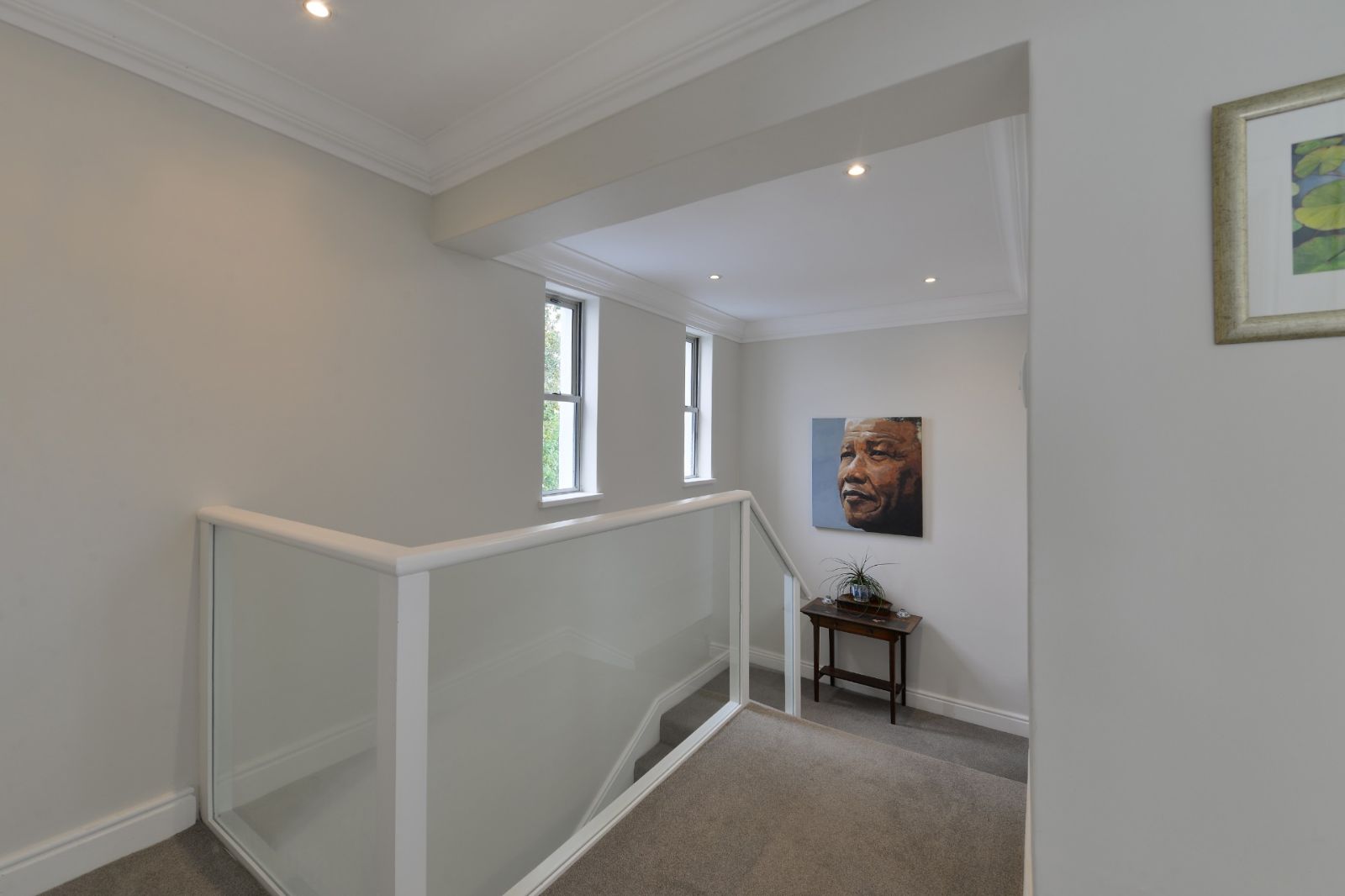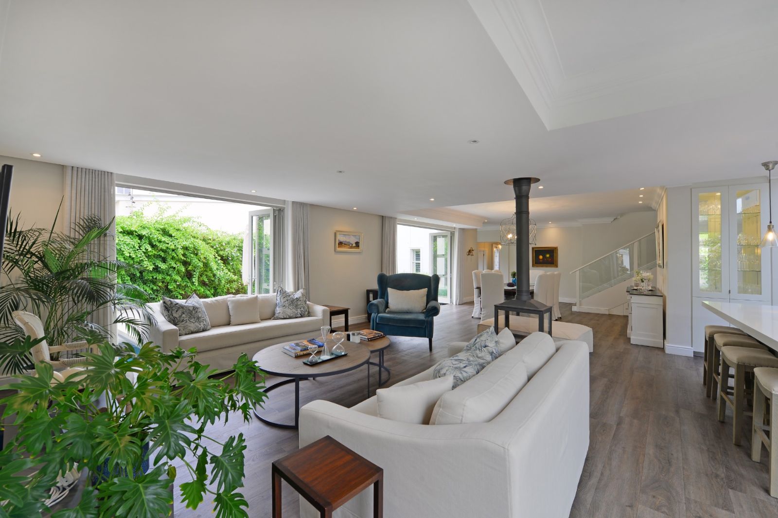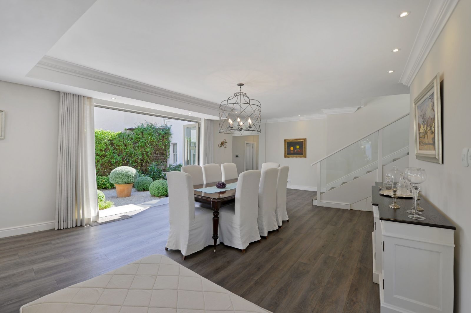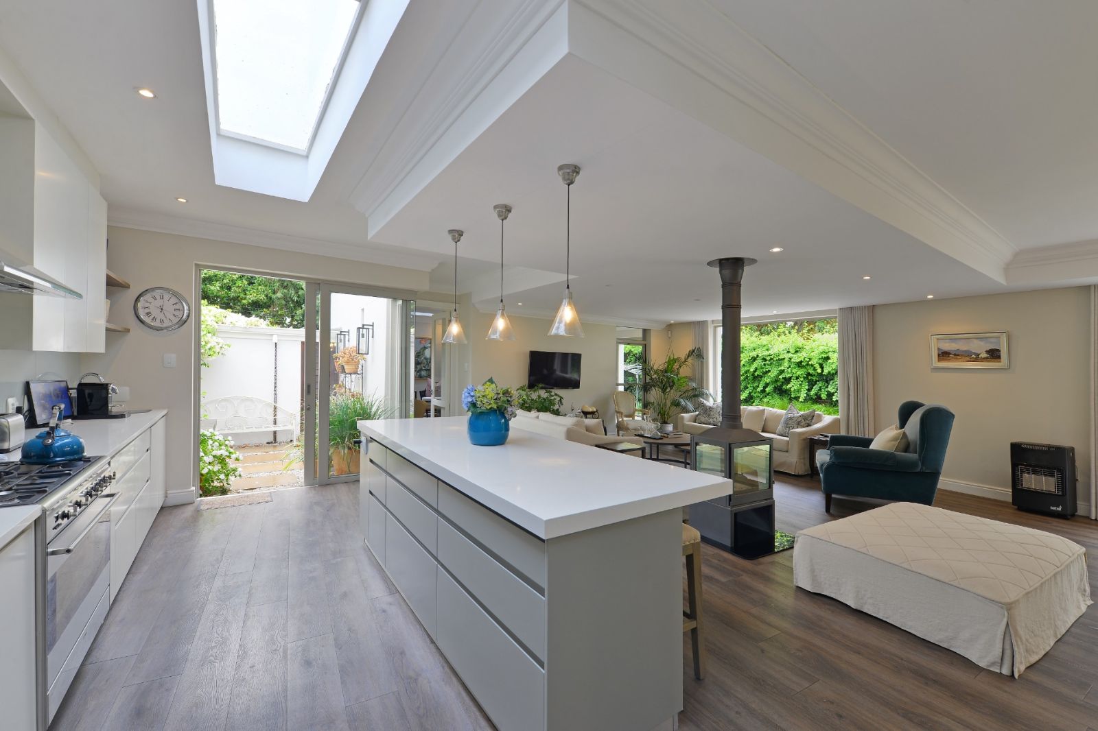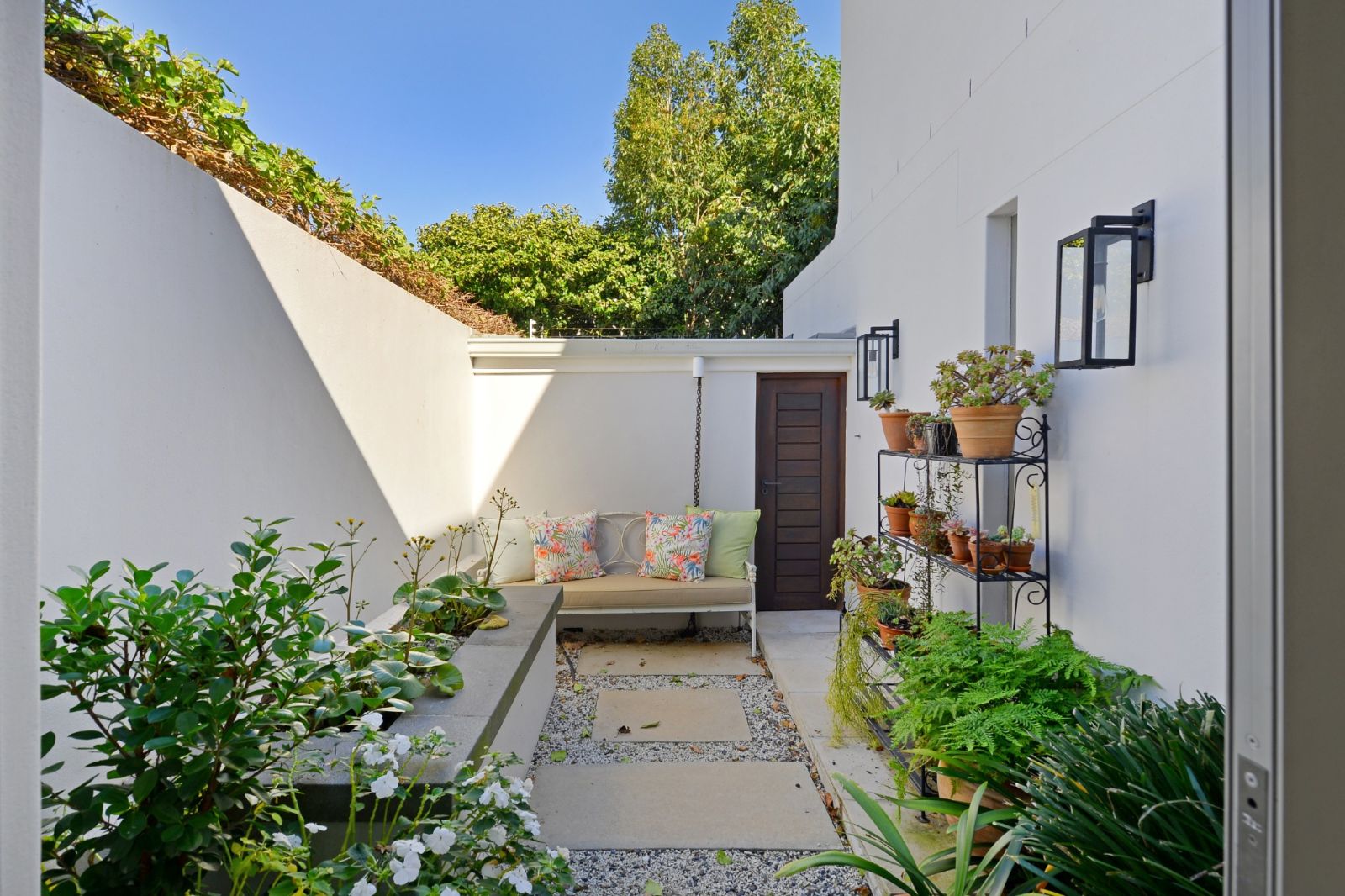Recently built, this modern home is the epitome of chic lock-and-go in the heart of Newlands Village, equipped with every carefully thought-out modern convenience such as solar electricity backup and rainwater harvesting, filtration and storage. The open plan living room is the heart of the home, and has expansive openings to the landscaped courtyard and pool deck with mountain views. The adjacent TV room / enclosed patio caters for more informal entertaining or the Sunday braai irrespective of the weather, complete with the swimming pool within the living area with frameless glass enclosure. Natural light floods the fitted kitchen through skylights. Upstairs the main bedroom is en suite with a full bathroom in glass walls and dressing room. Two further bedrooms share a family bathroom.