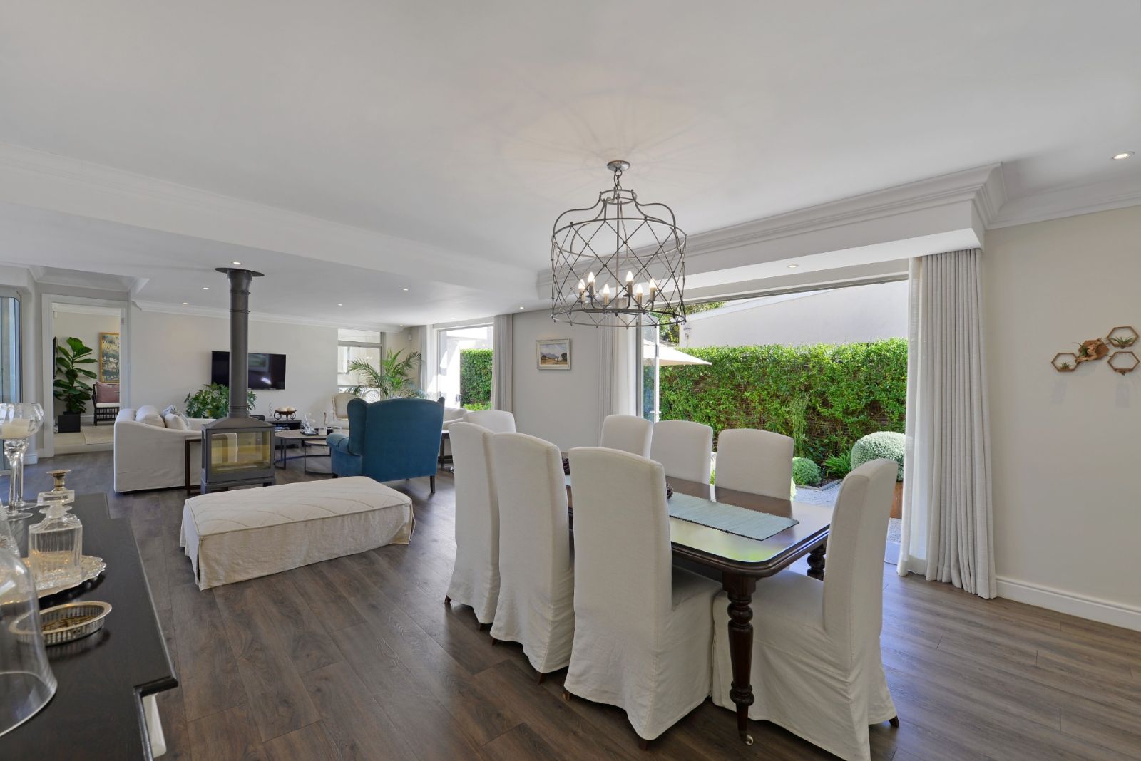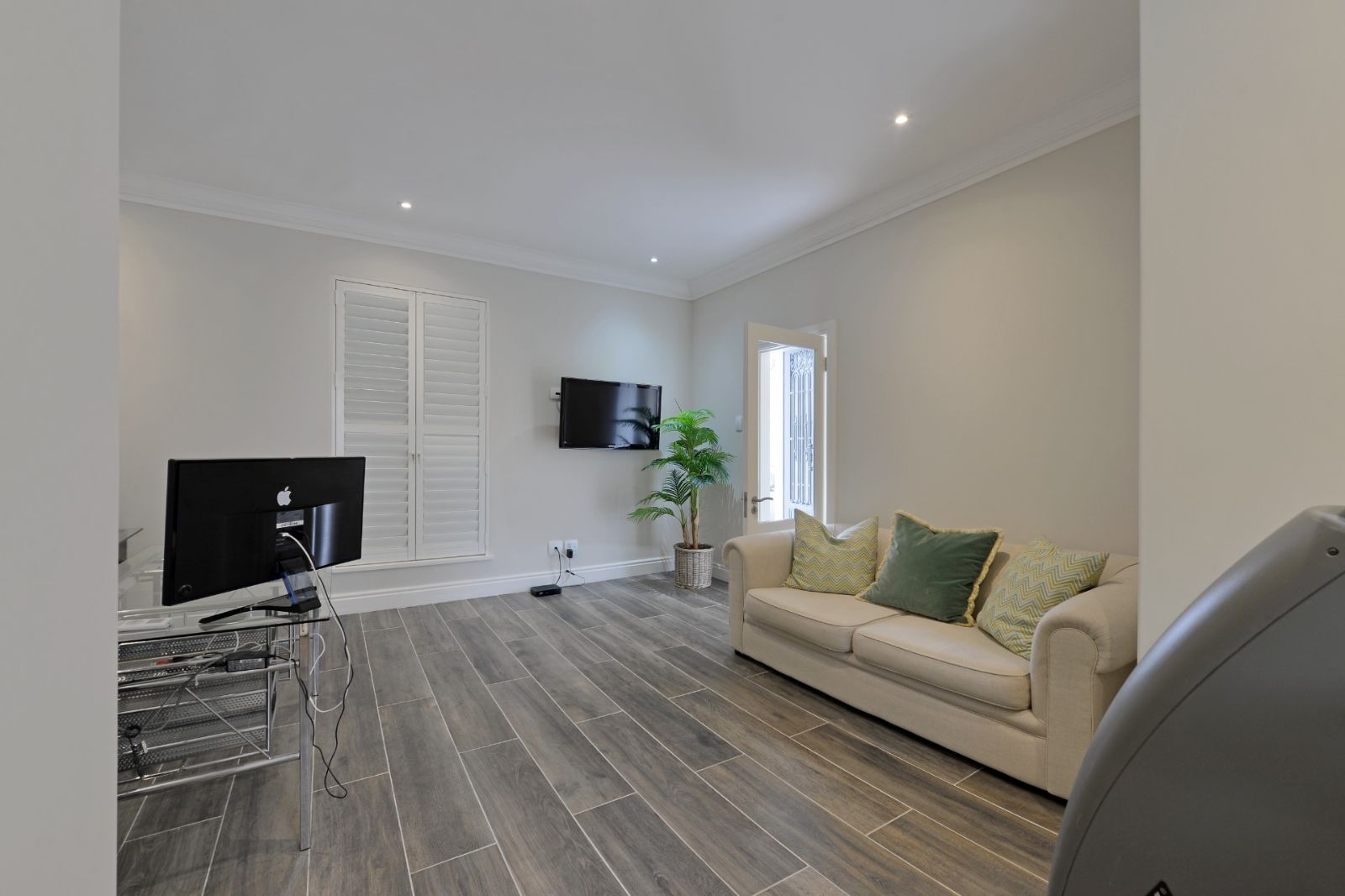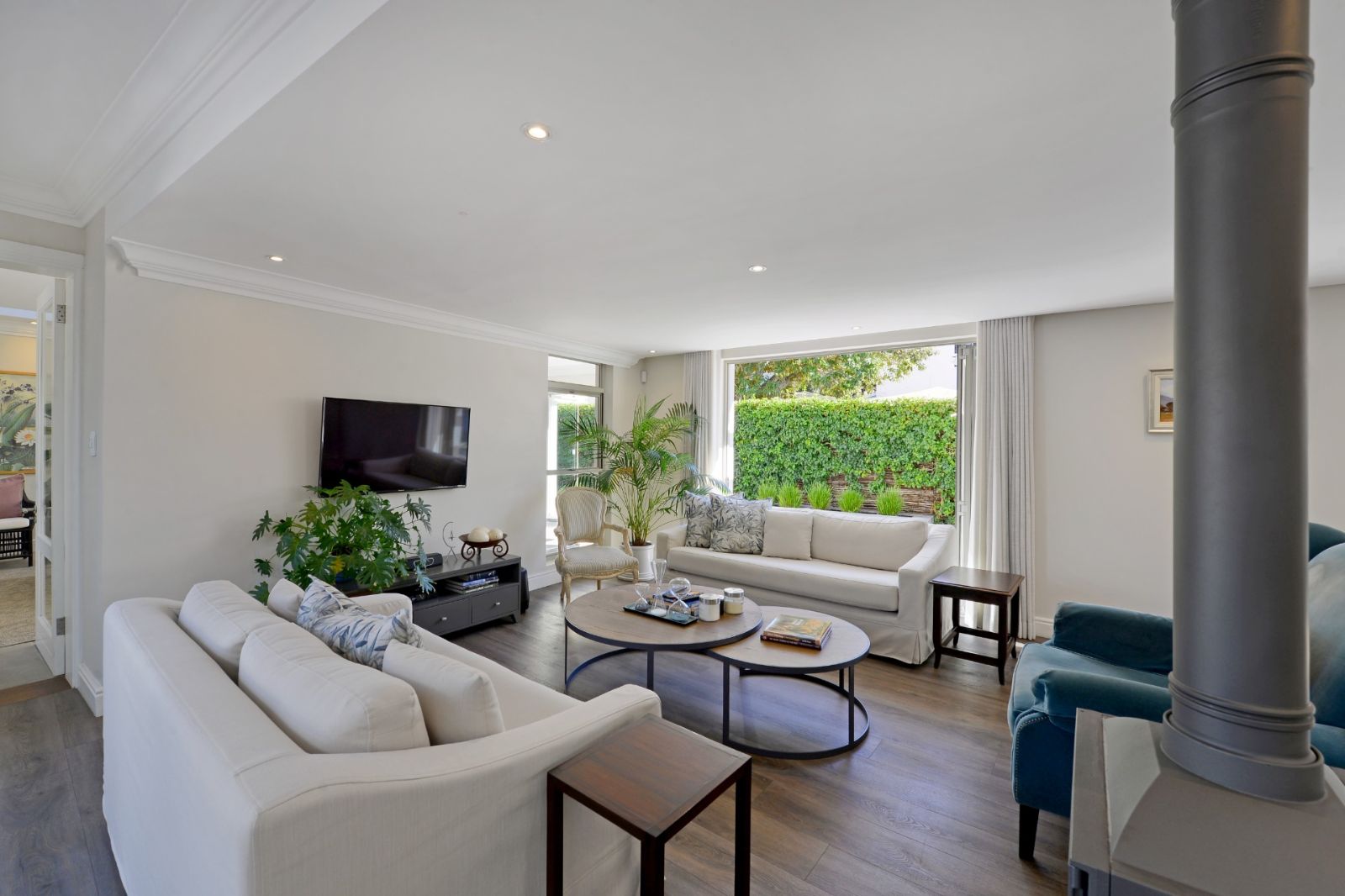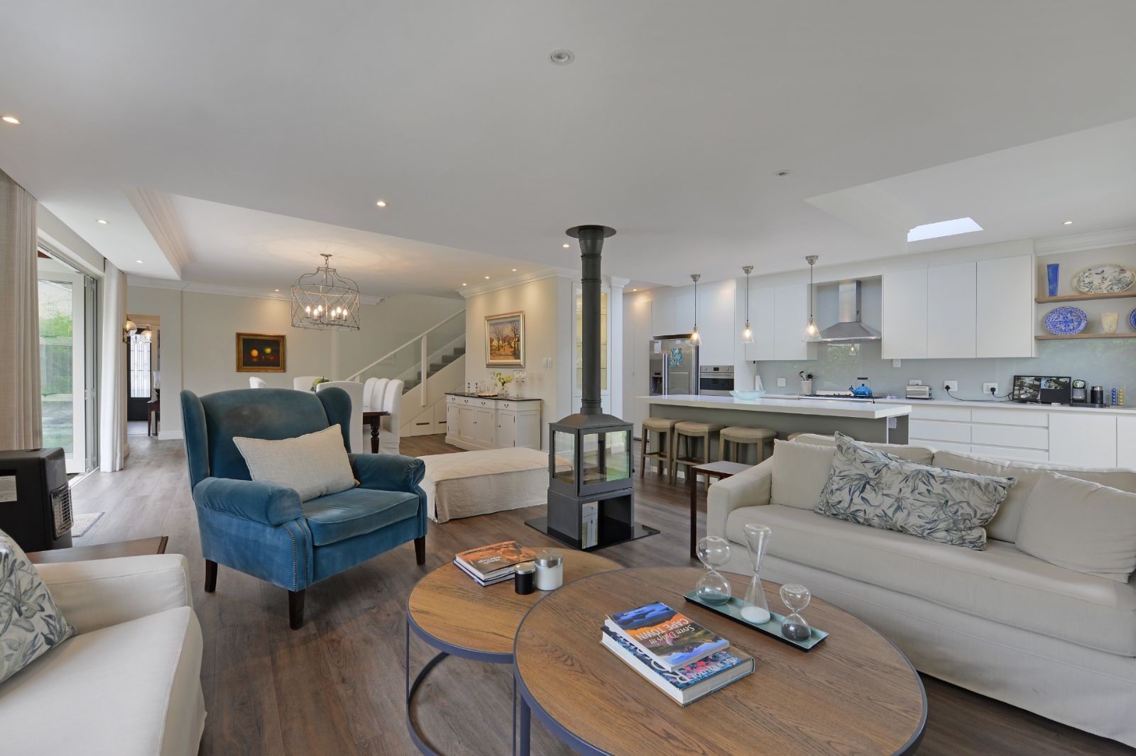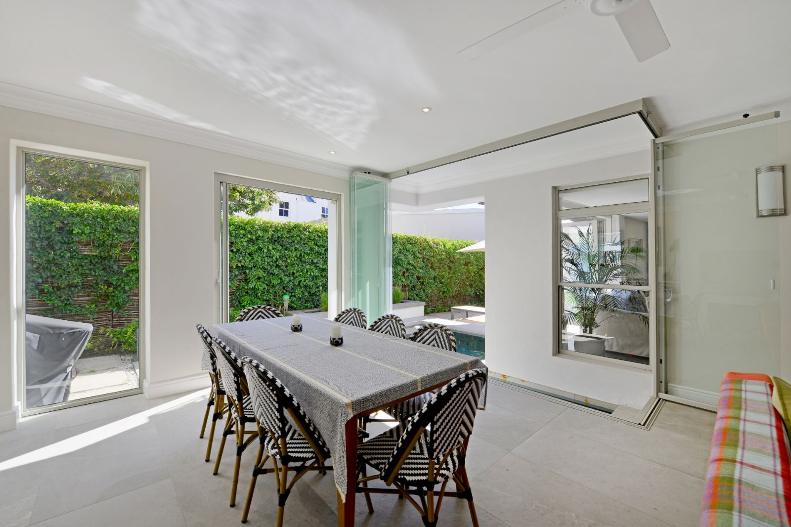 Recently built, this modern home is the epitome of chic lock-and-go in the heart of Newlands Village, equipped with every carefully thought-out modern convenience such as solar electricity backup and rainwater harvesting, filtration and storage. The open plan living room is the heart of the home, and has expansive openings to the landscaped courtyard and pool deck with mountain views. The adjacent TV room / enclosed patio caters for more informal entertaining or the Sunday braai irrespective of the weather, complete with the swimming pool within the living area with frameless glass enclosure. Natural light floods the fitted kitchen through skylights. Upstairs the main bedroom is en suite with a full bathroom in glass walls and dressing room. Two further bedrooms share a family bathroom.