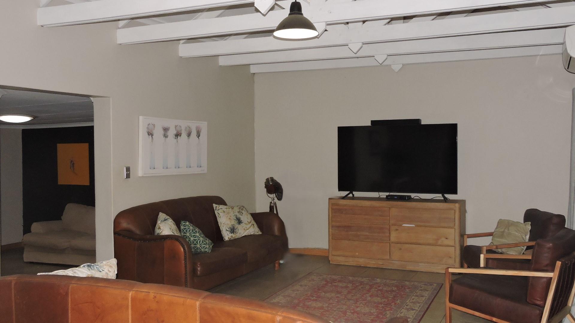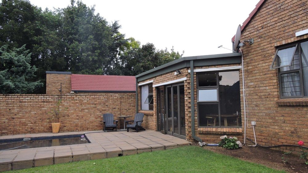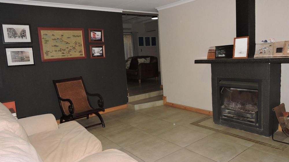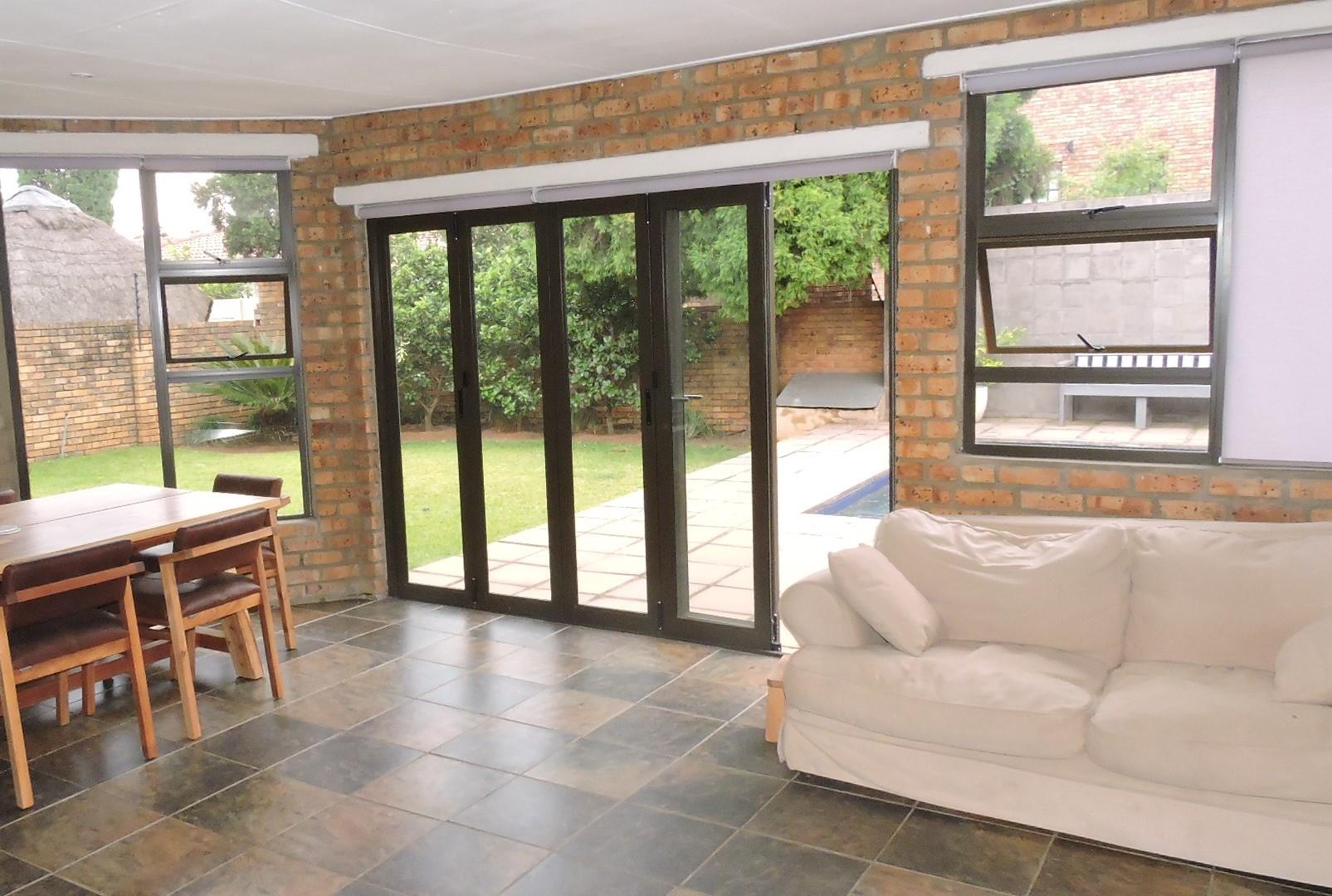The property offers multiple living areas to suit various lifestyle needs. The main lounge and dining areas are spacious and tiled for easy maintenance. A second area with a built-in fireplace provides a cozy setting for relaxing evenings, while the third living area serves as a spacious entertainment hub with a built-in braai. This room seamlessly connects to the outdoors through glass stacking doors, leading to a lush garden and inviting pool—perfect for entertaining or enjoying serene afternoons.
