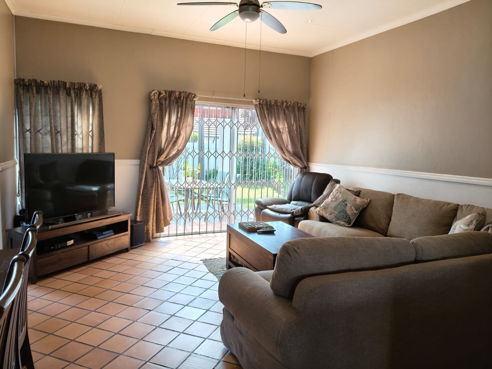 Two double bedrooms with one full bathroom and separate toilet. Lounge opens onto a patio with a build-in braai and walled front garden with manual irrigation.