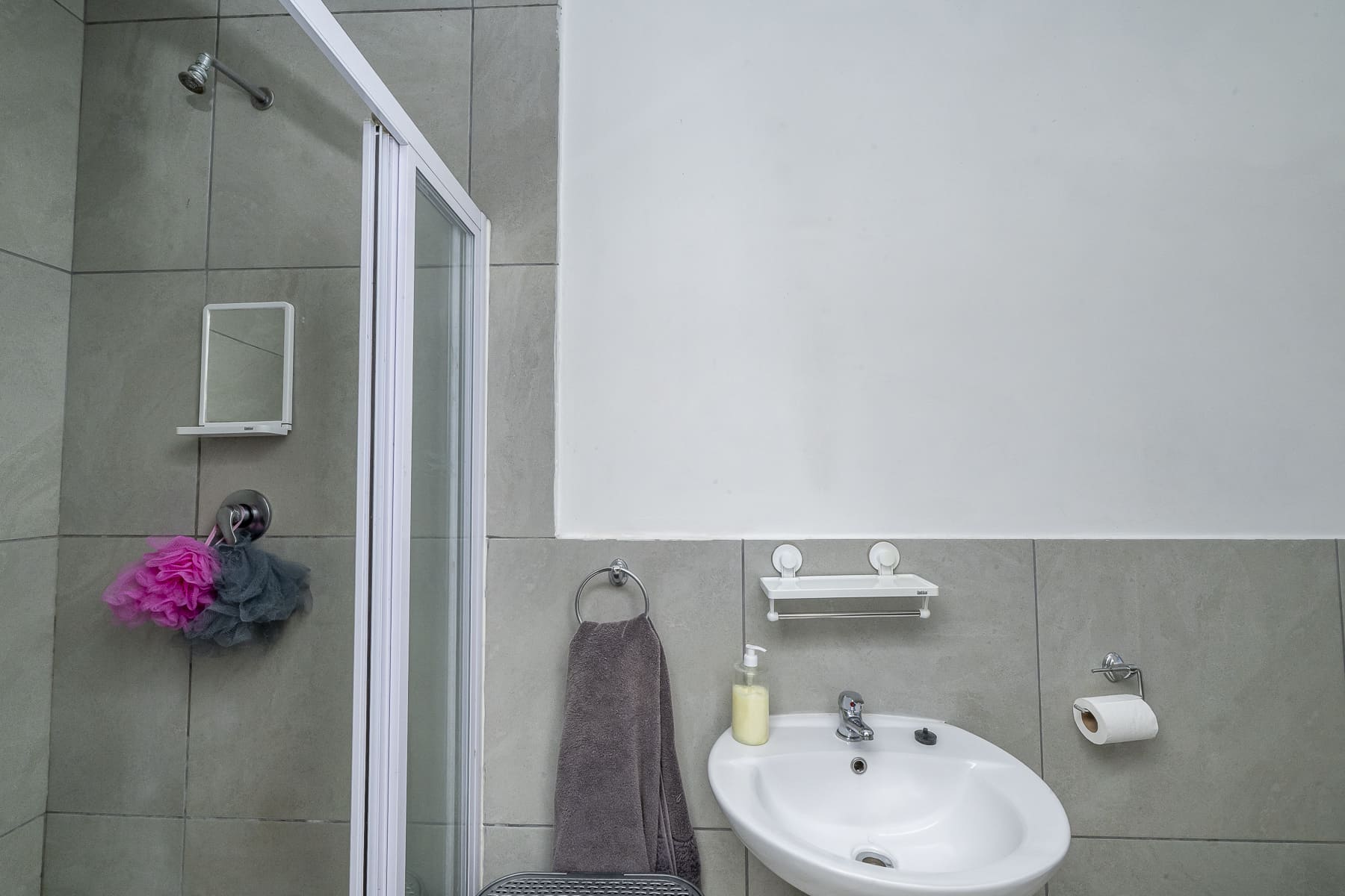 A tiled hallway leads you to the three bedrooms and the family bathroom. The family bathroom includes a bath with a shower, plus a toilet and basin. All bedrooms have tiled floors; the main bedroom also has built-in white melamine cupboards. There’s a private en suite with a shower, toilet, and basin.