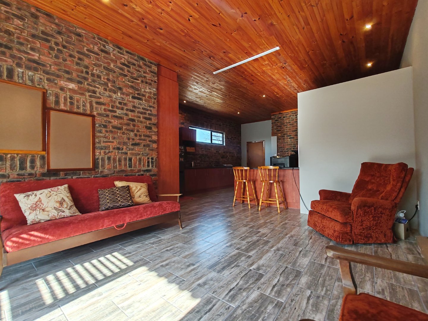 - Knotty pine ceilings in 60% of the home, aluminium windows, and deluxe chromatic RBR roof