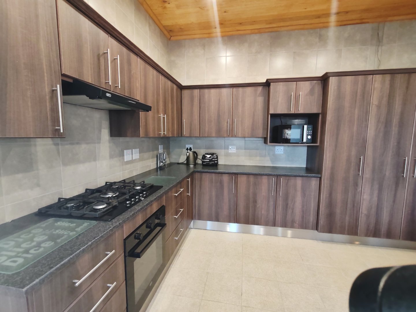 - Brand new spacious kitchen with extensive cupboard space and postform counter tops, gas stove/hob and extractor, laundry / scullery section.