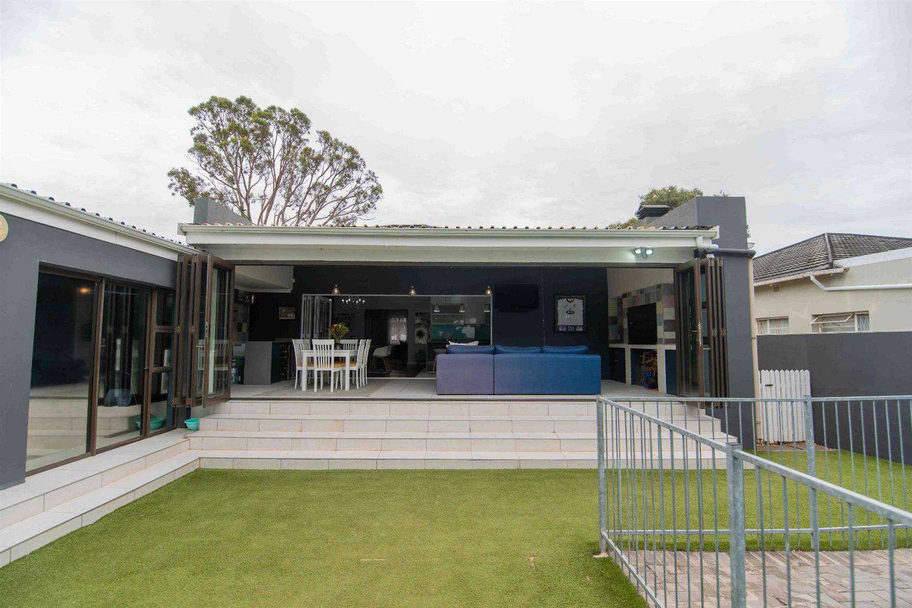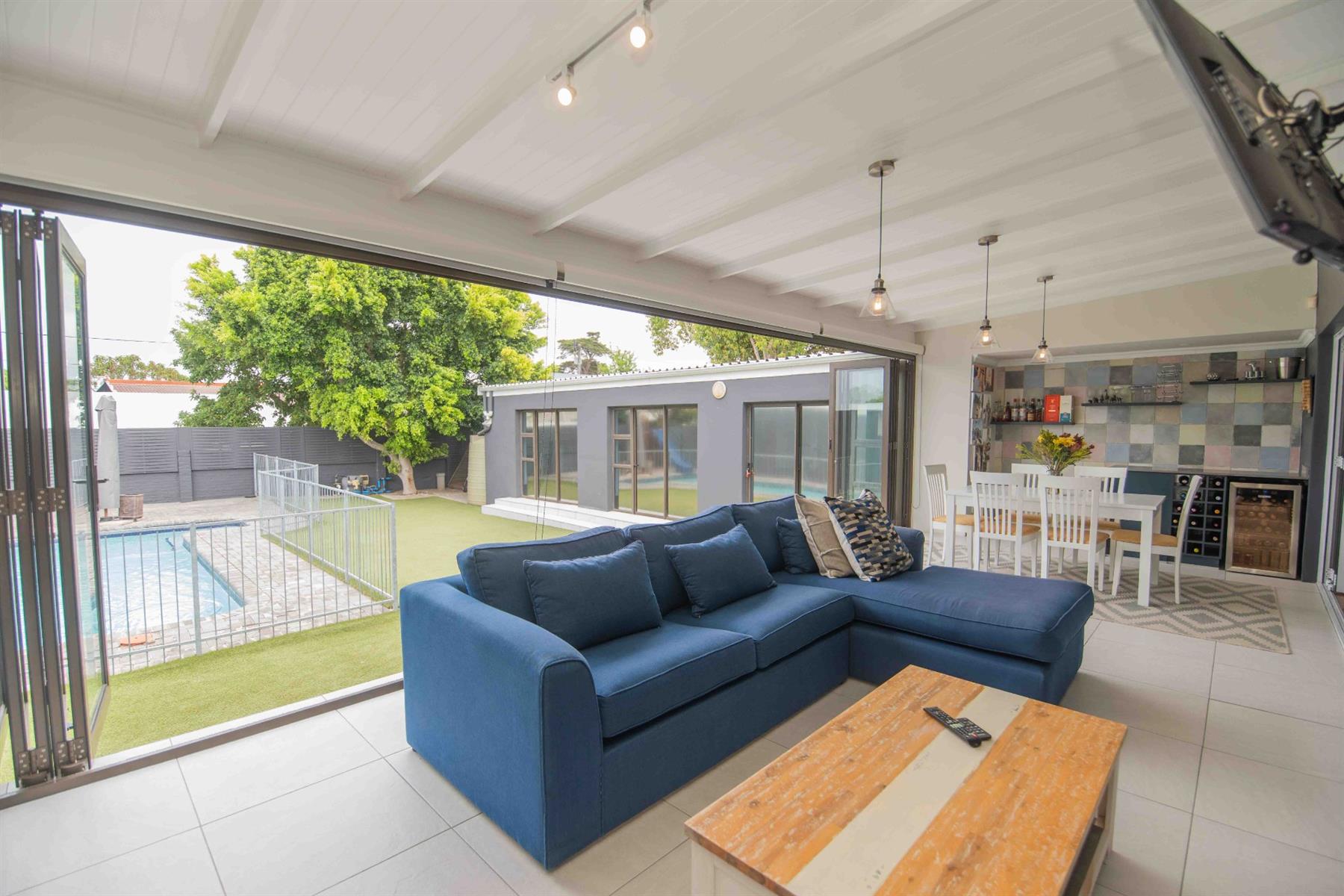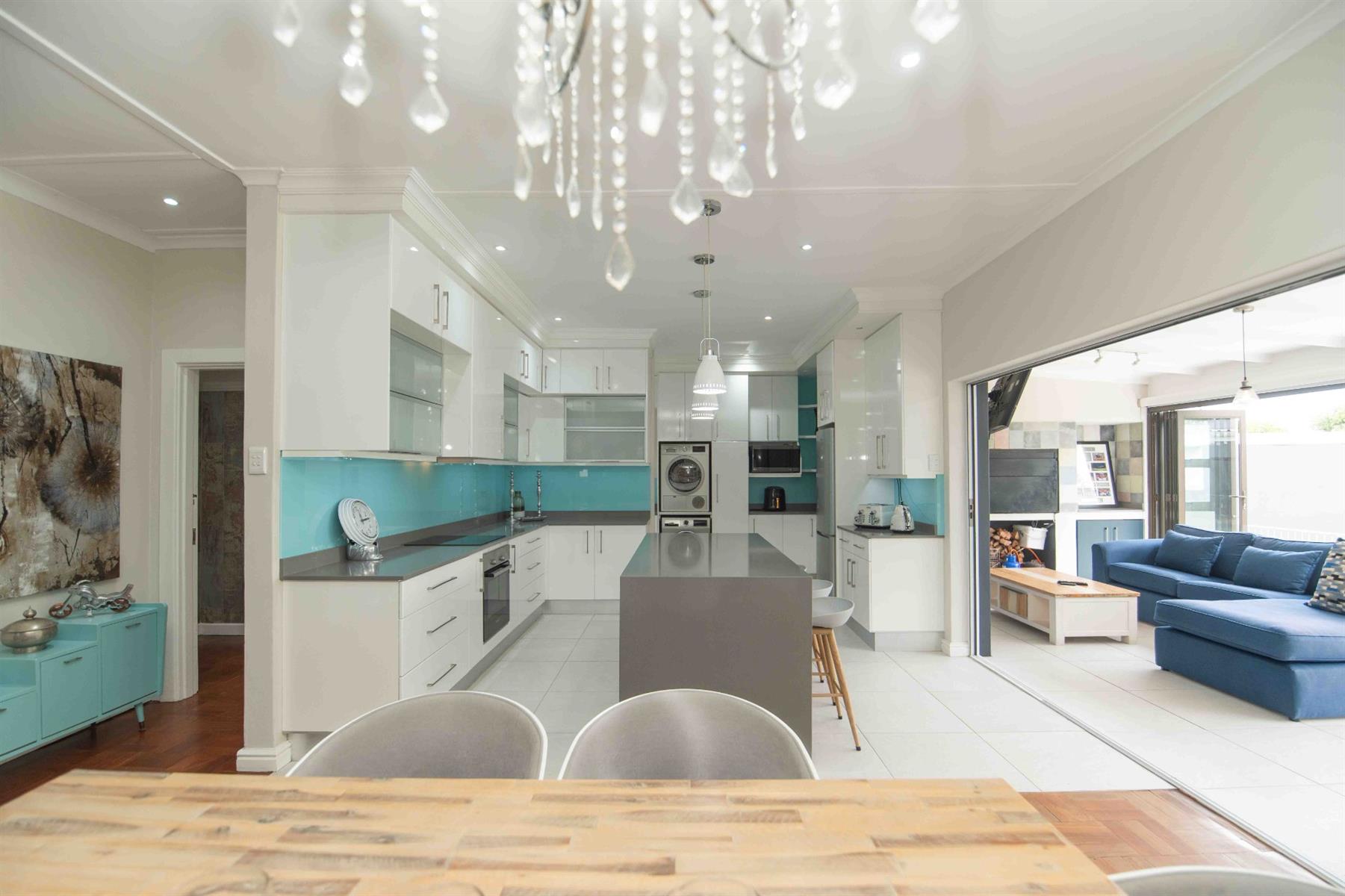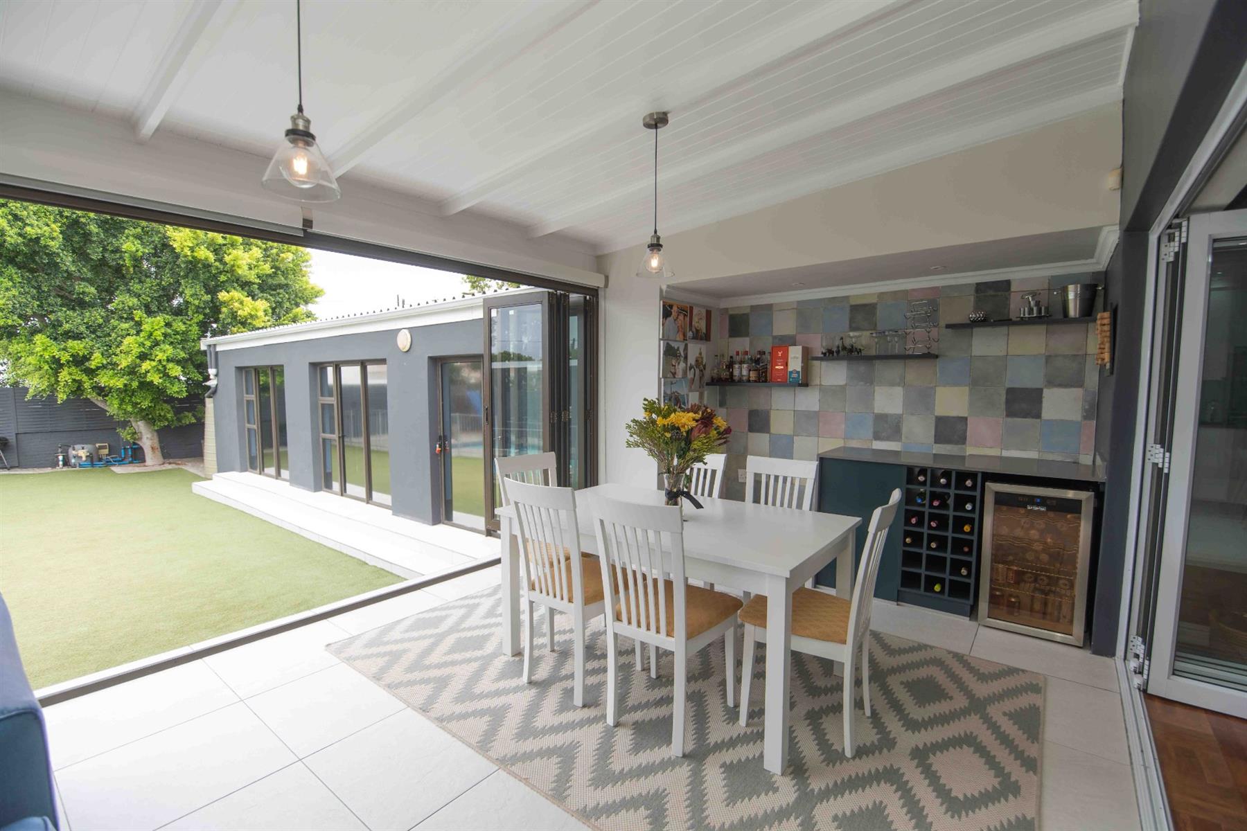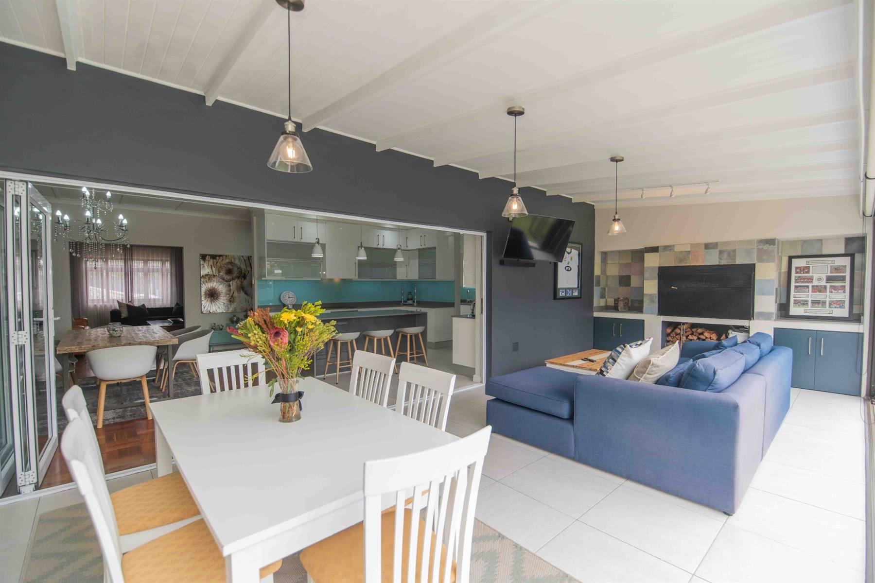 An updated open-plan kitchen with a small scullery, flows seamlessly into the spacious living areas. A standout feature is the indoor braai room with stacker doors, opening onto the garden and sparkling pool — perfect for year-round entertaining.
