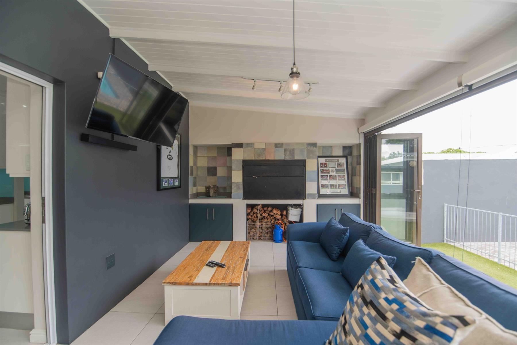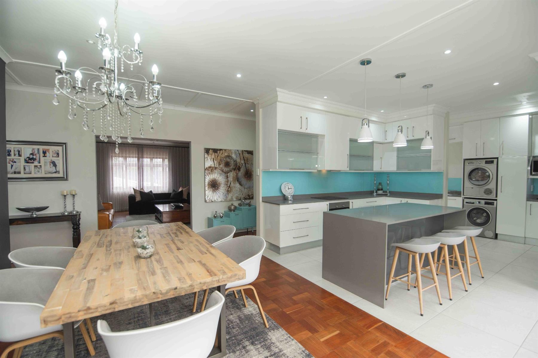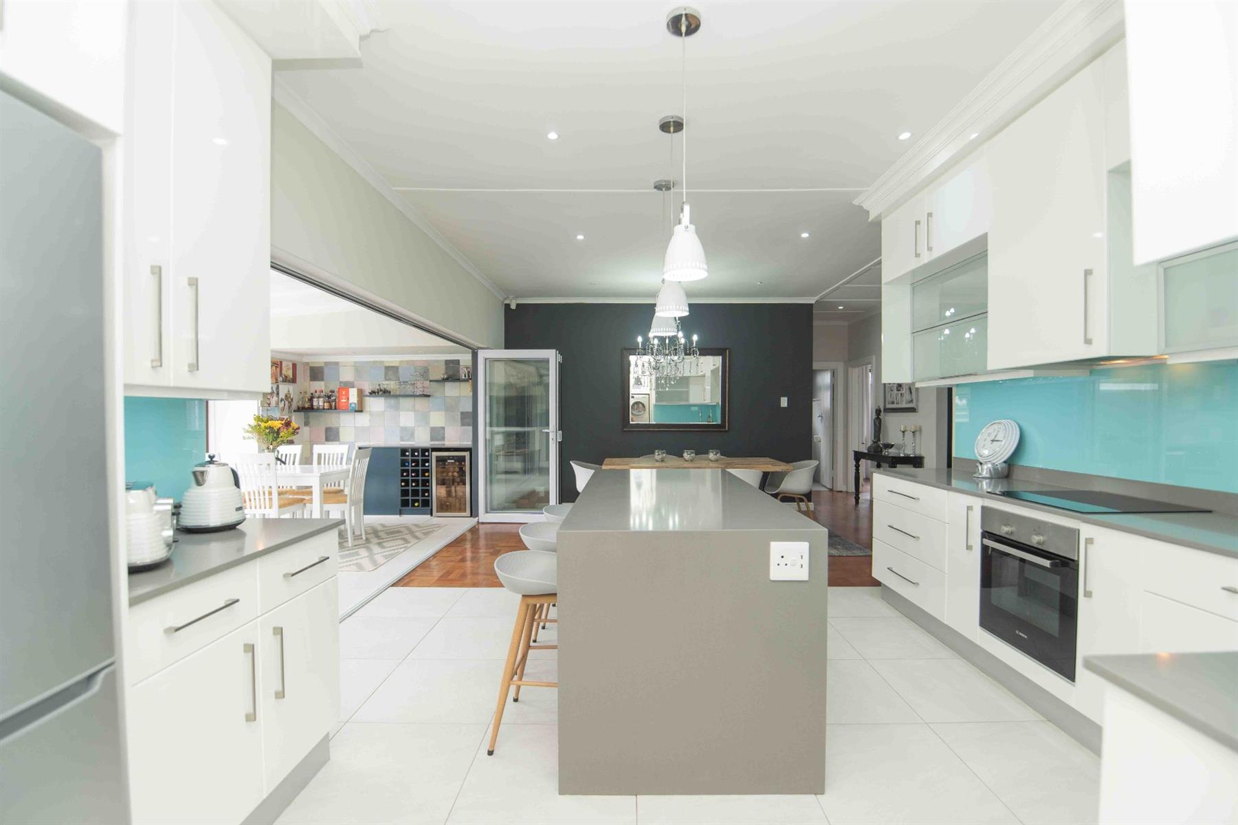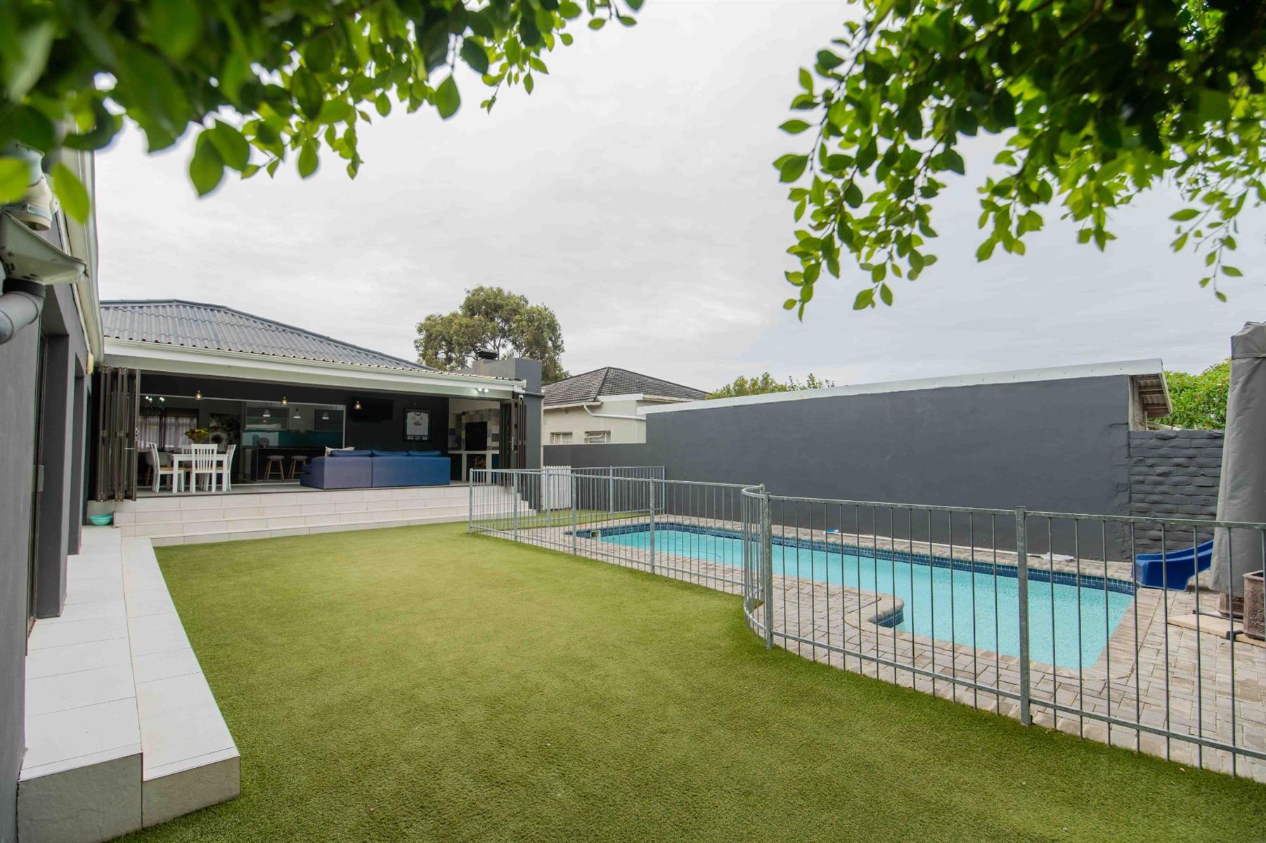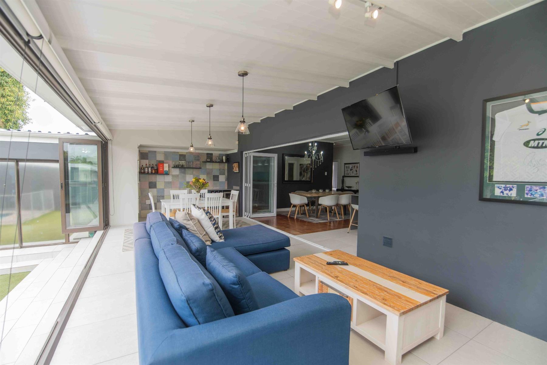 An updated open-plan kitchen with a small scullery, flows seamlessly into the spacious living areas. A standout feature is the indoor braai room with stacker doors, opening onto the garden and sparkling pool — perfect for year-round entertaining.
