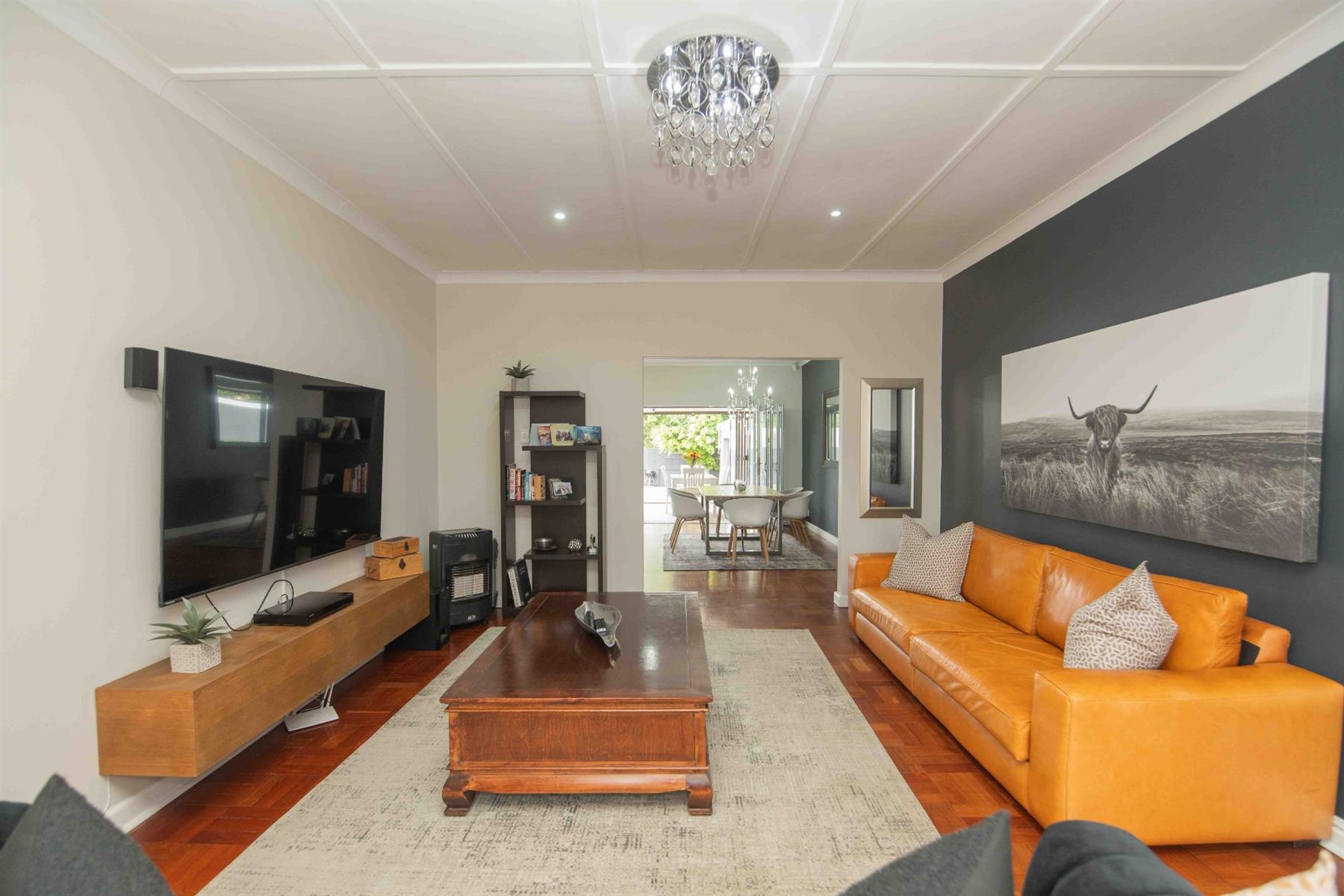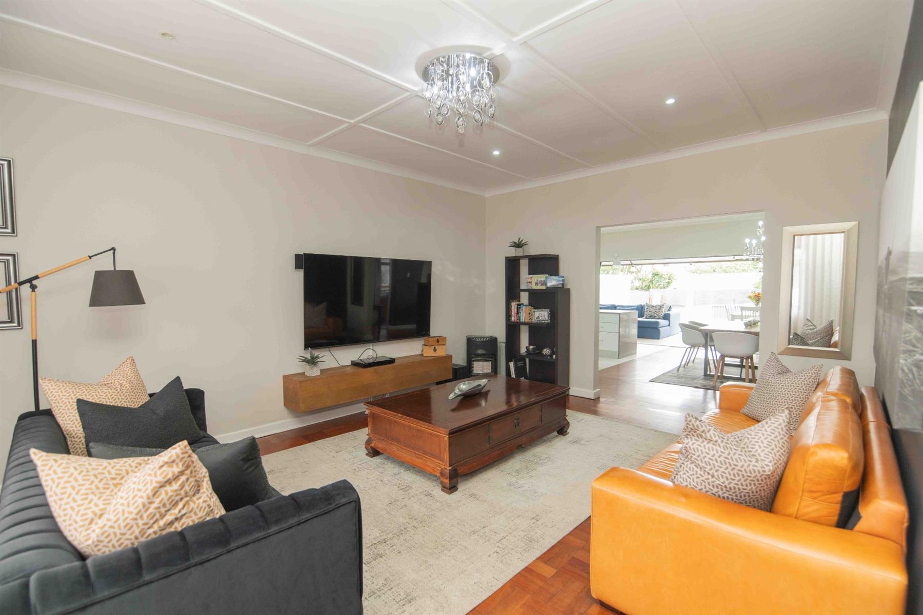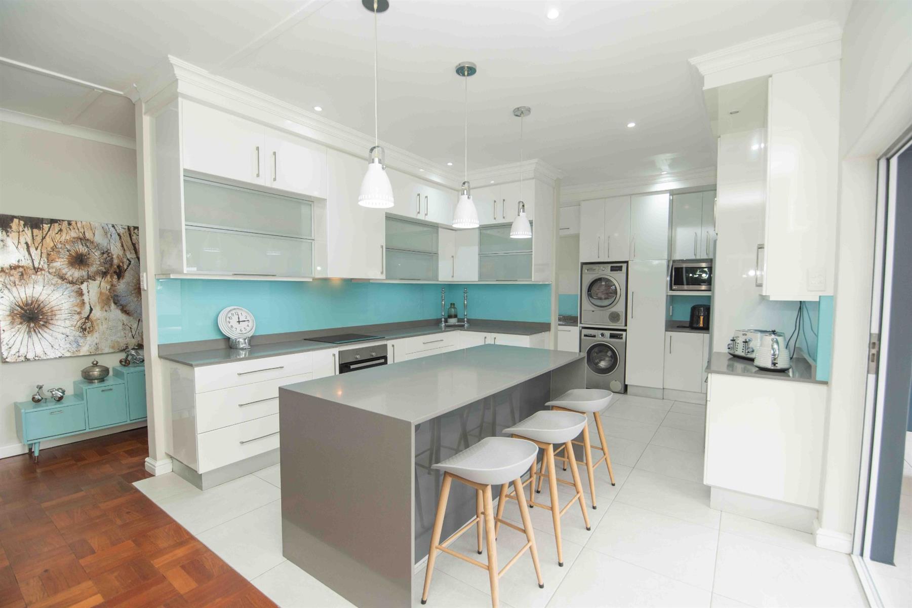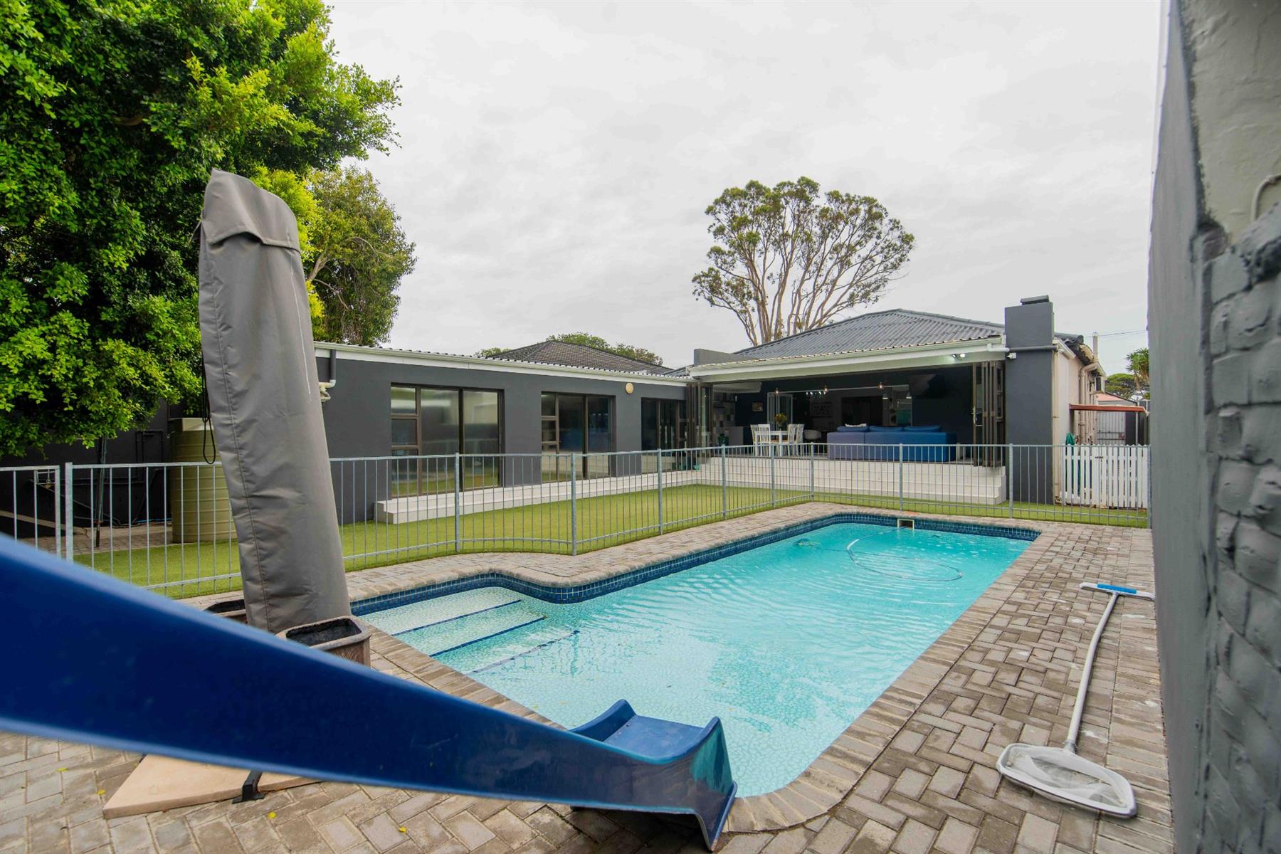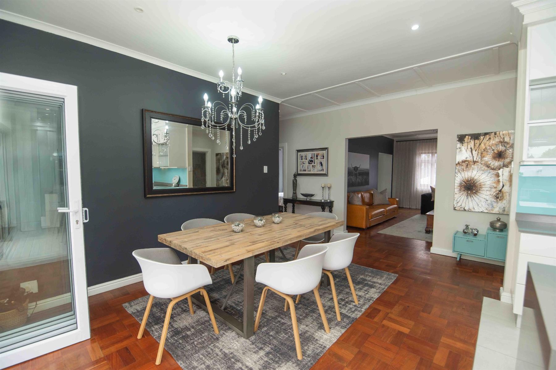 An updated open-plan kitchen with a small scullery, flows seamlessly into the spacious living areas. A standout feature is the indoor braai room with stacker doors, opening onto the garden and sparkling pool — perfect for year-round entertaining.
