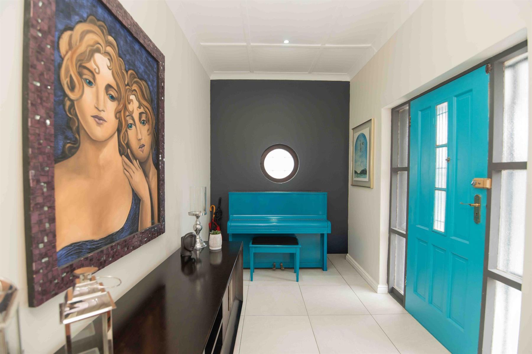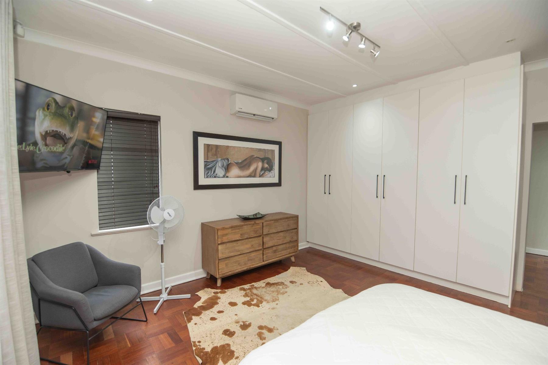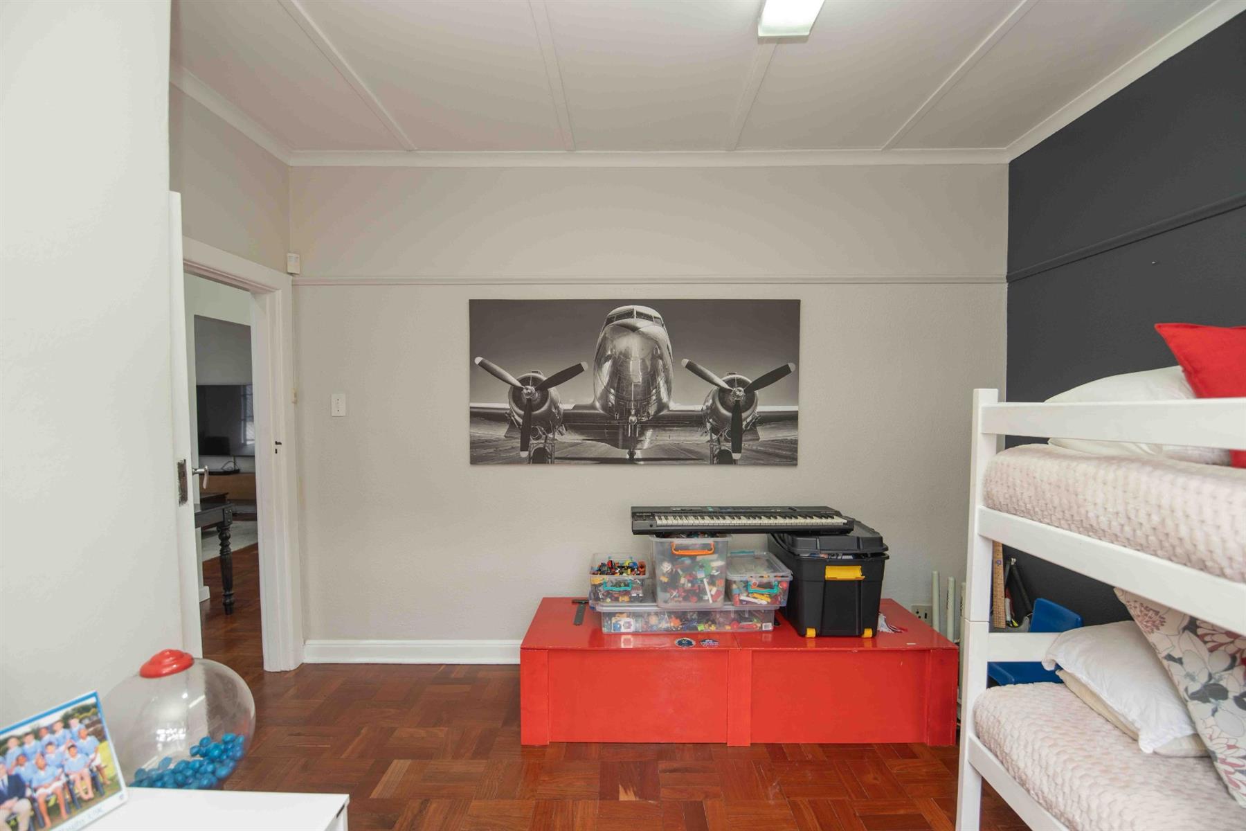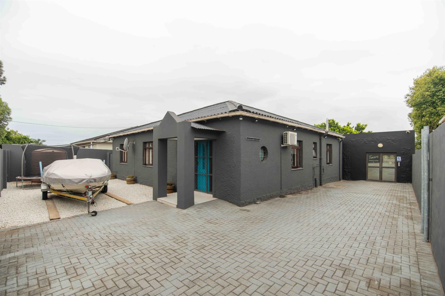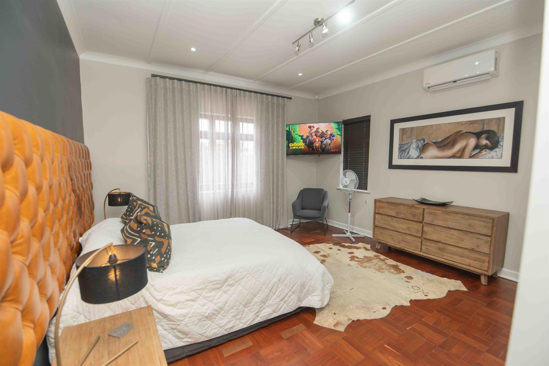 An updated open-plan kitchen with a small scullery, flows seamlessly into the spacious living areas. A standout feature is the indoor braai room with stacker doors, opening onto the garden and sparkling pool — perfect for year-round entertaining.