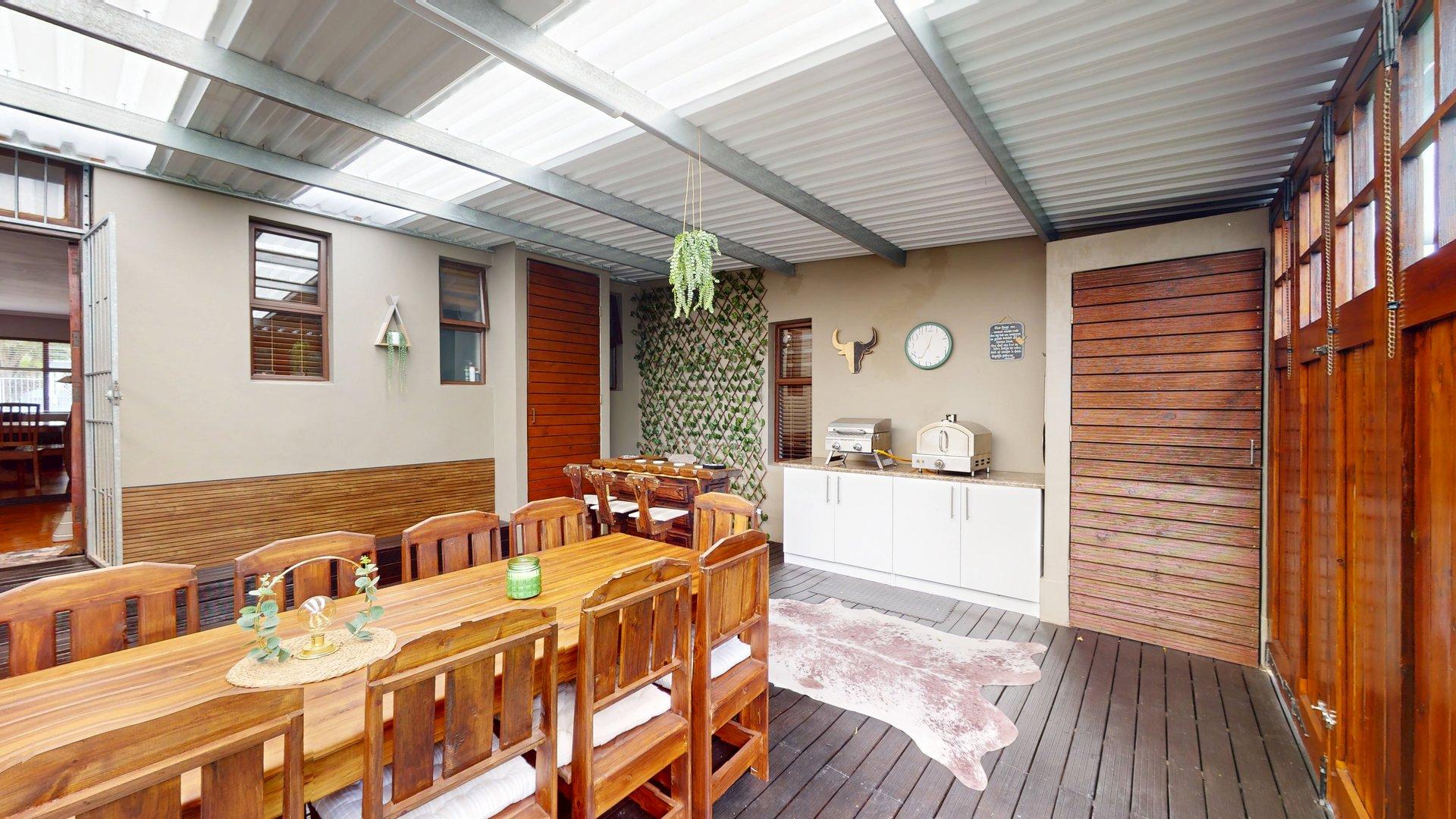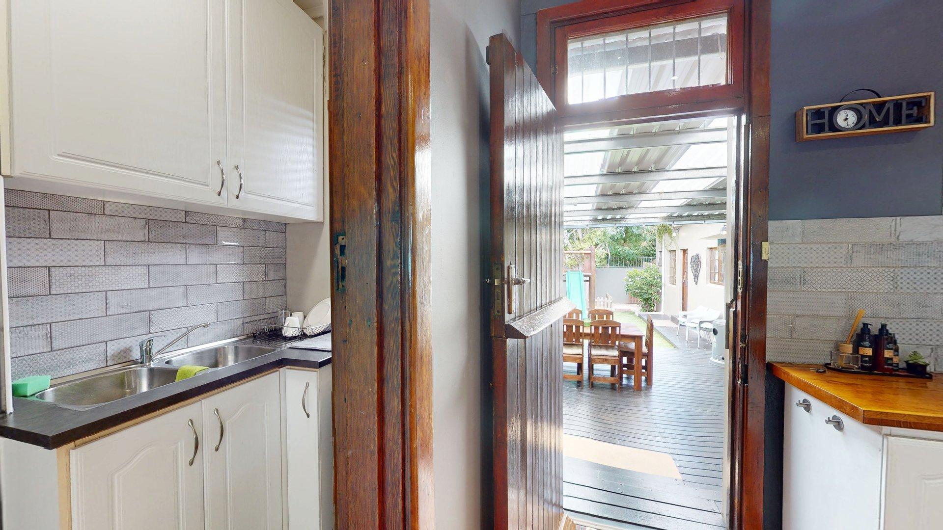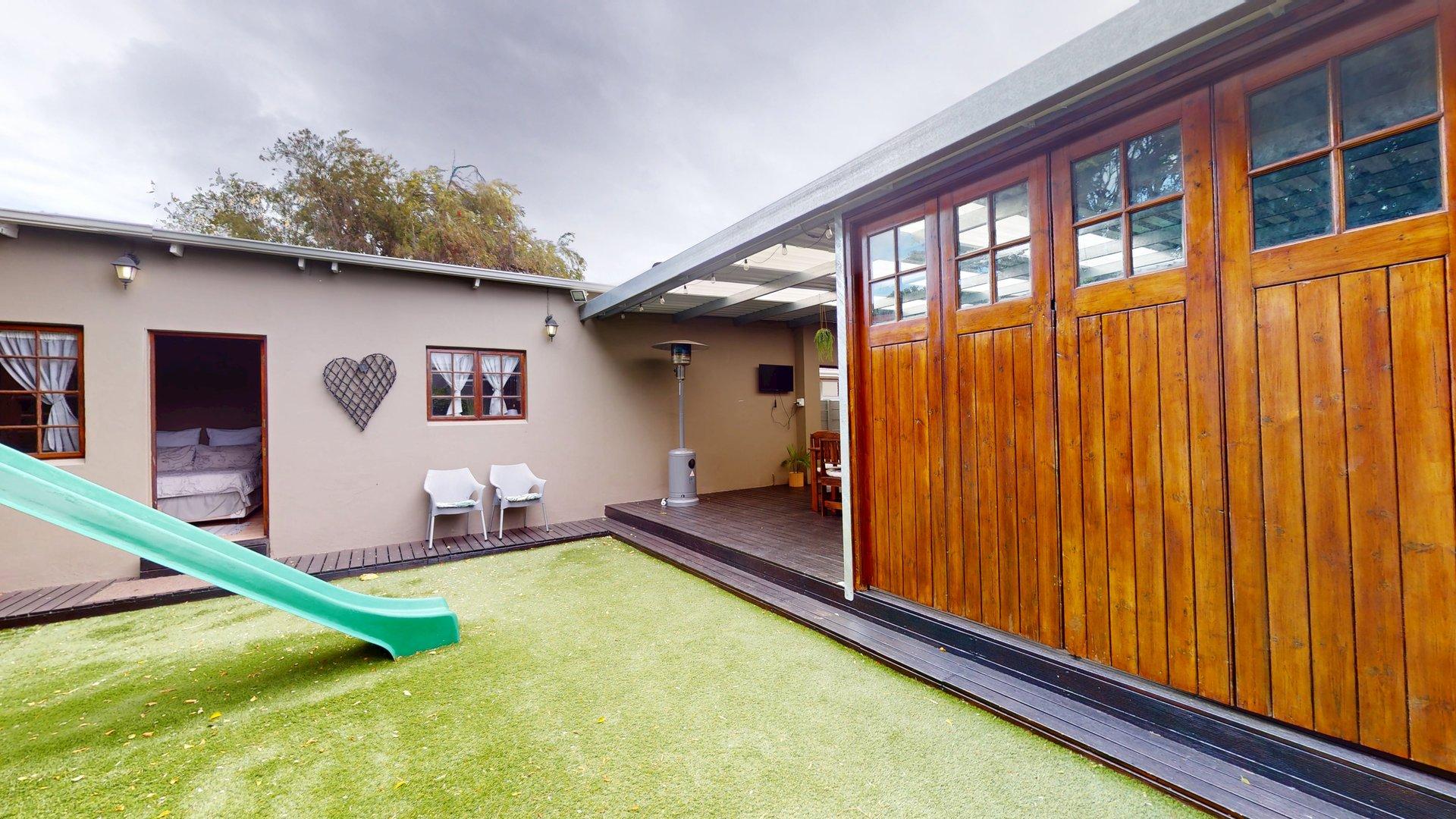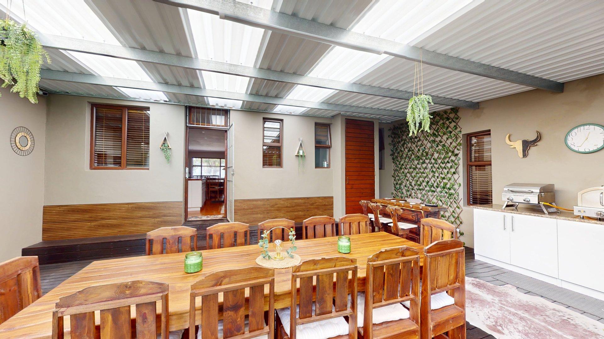 Sustainability and security have been well considered, with features including a large water tank connected to the home for domestic use, a solar geyser, and solar-powered exterior lighting for added security. The property is fitted with an alarm system, and the fully enclosed, manicured garden provides a safe, private environment for children and pets. An outside garden shed offers convenient additional storage.