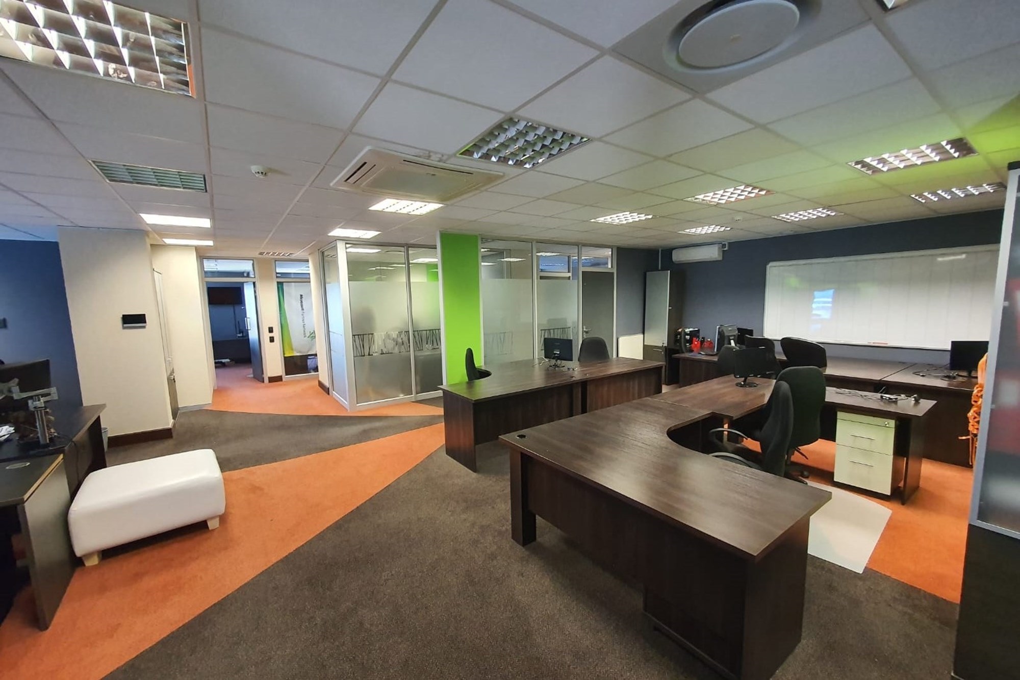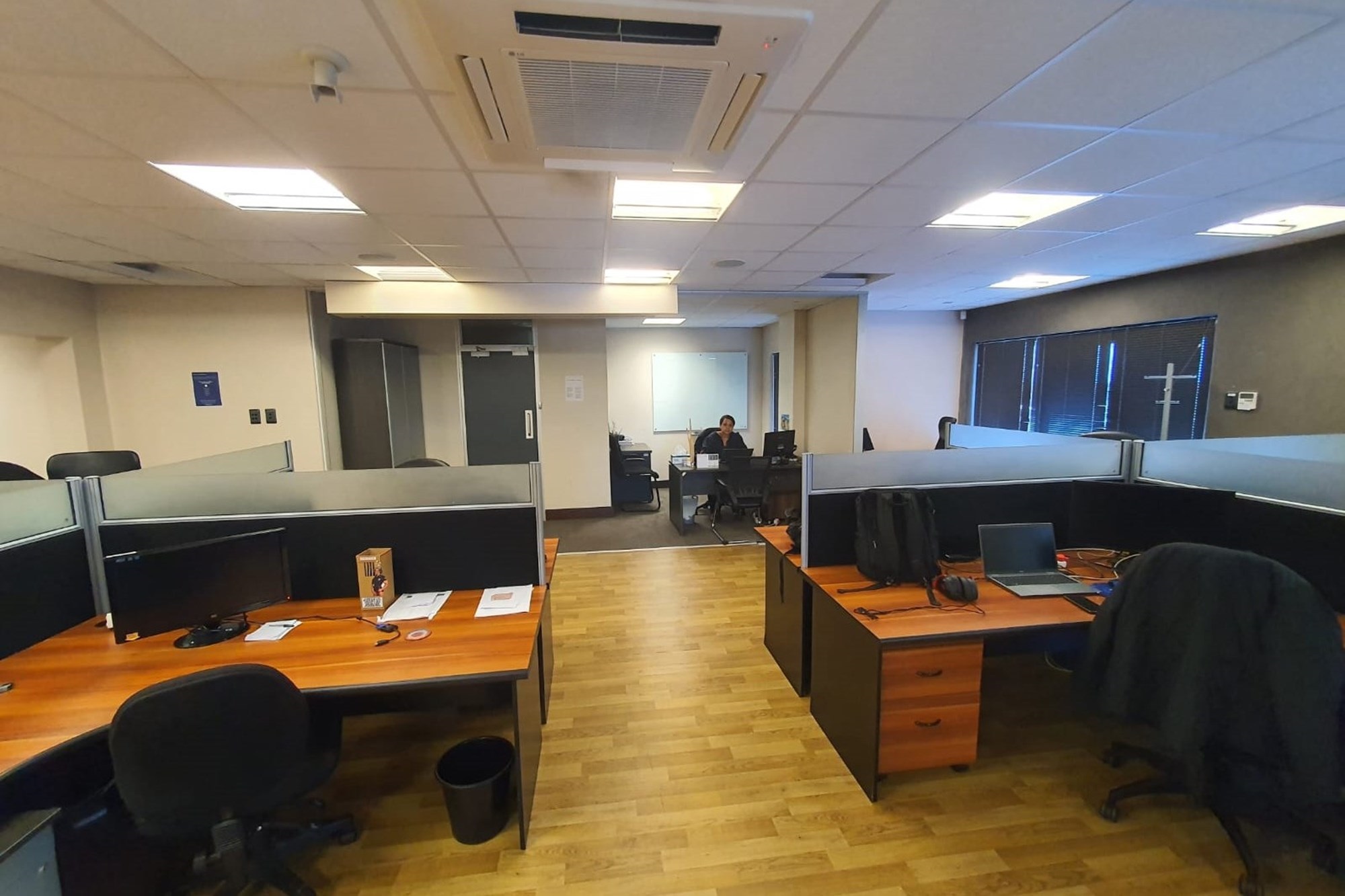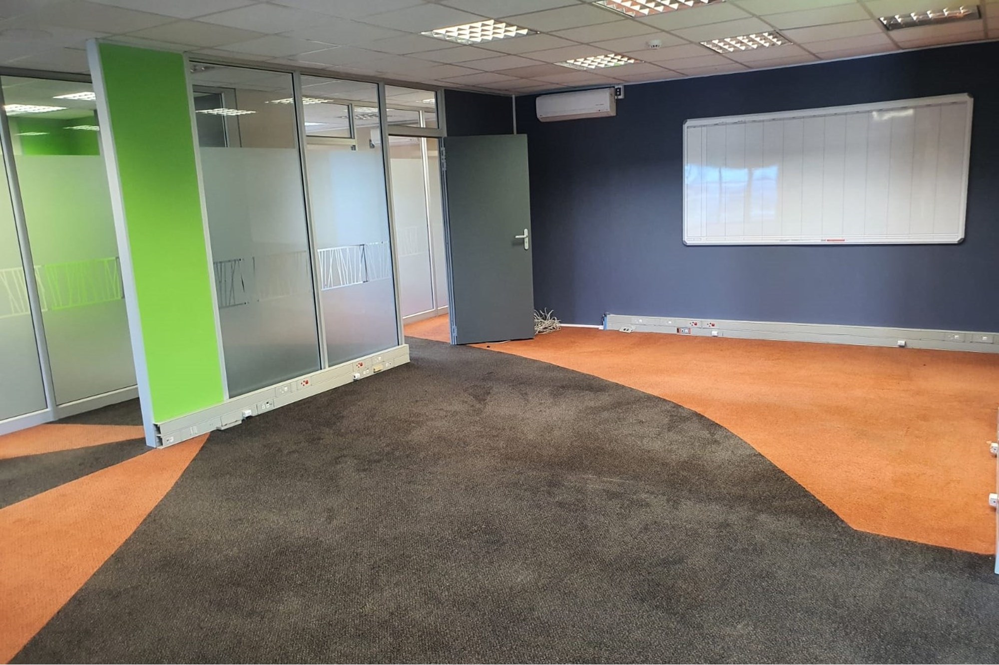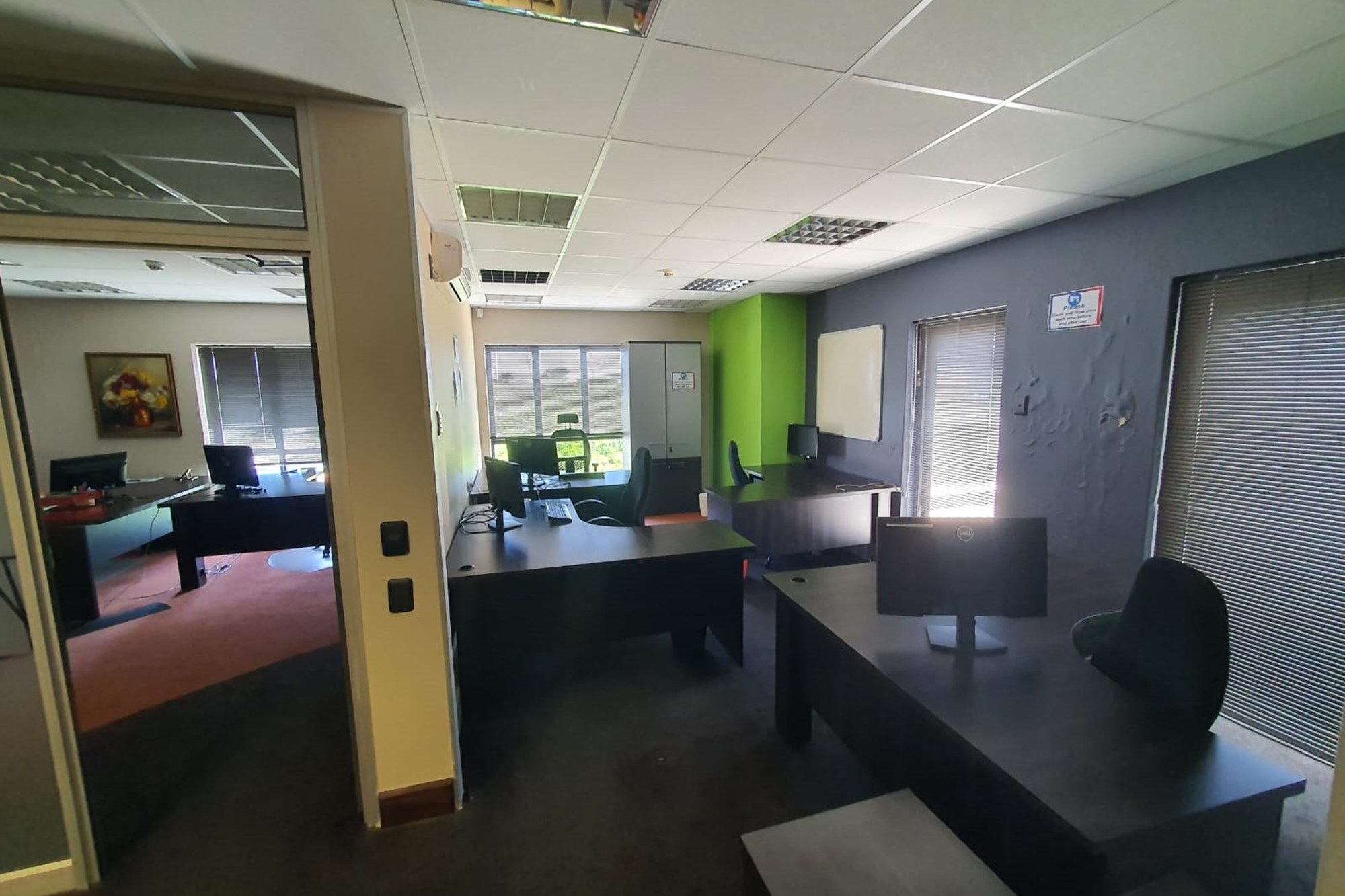 High-quality finishes throughout include air-conditioning, fibre-ready connectivity, fitted blinds, and a mix of carpet, tile, and laminated flooring, creating a modern and comfortable workspace.