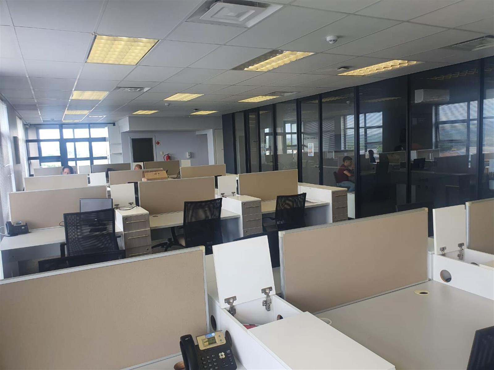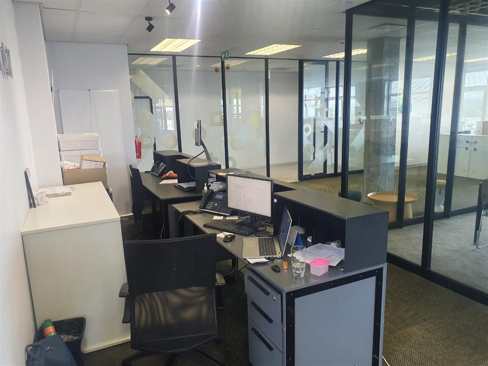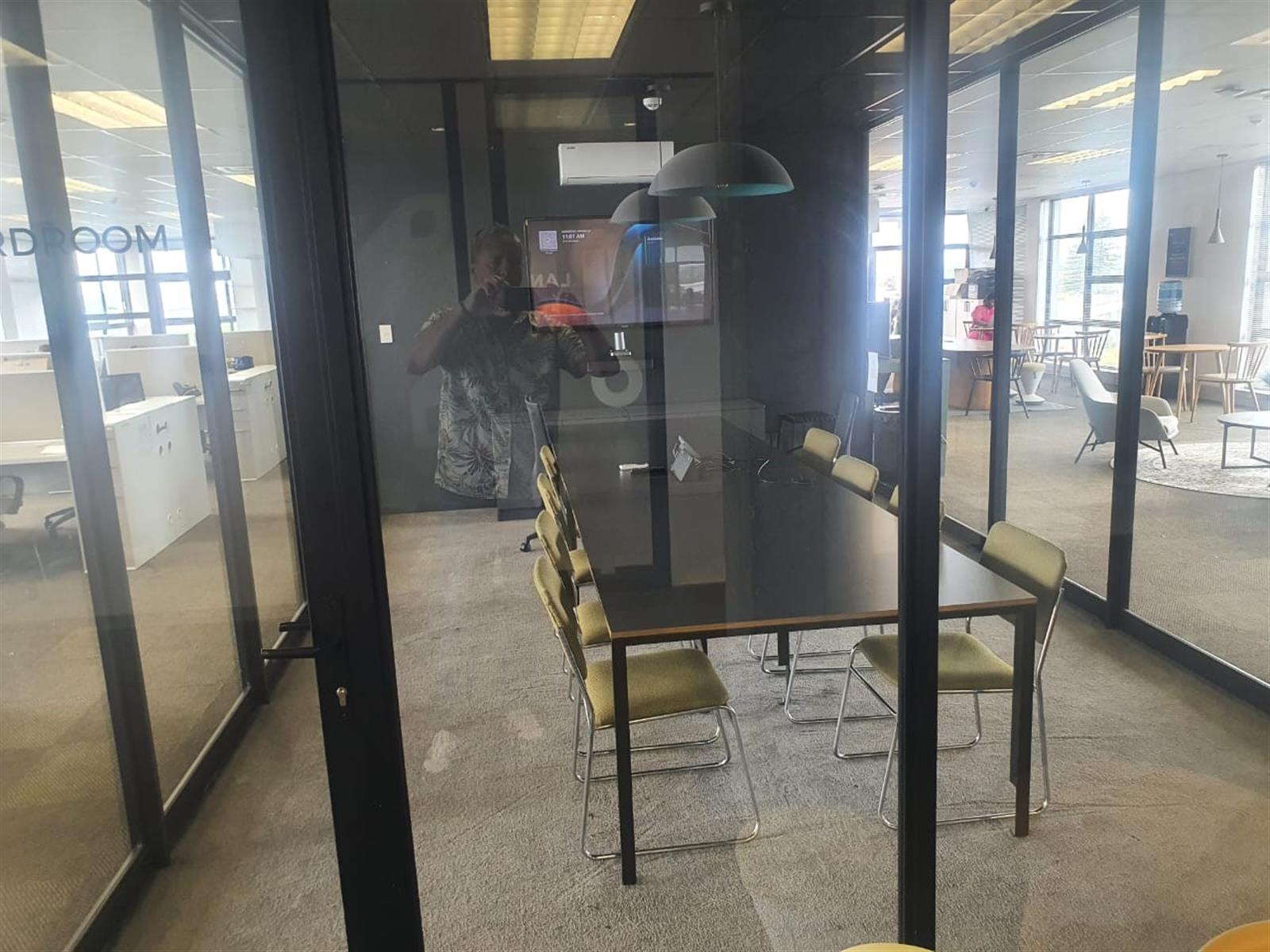 The suite features an open-plan air-conditioned reception area with a glass and aluminium boardroom, creating a striking first impression. A spacious open-plan office area allows for flexible workspace configurations, while high-quality finishes throughout reflect a contemporary corporate aesthetic.