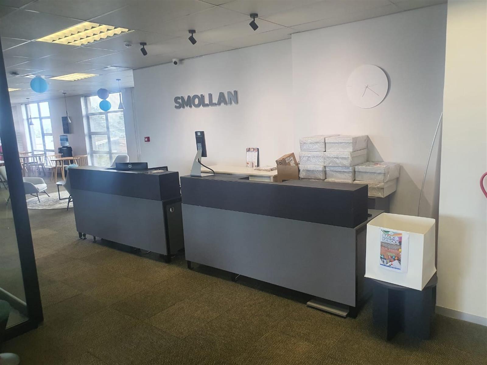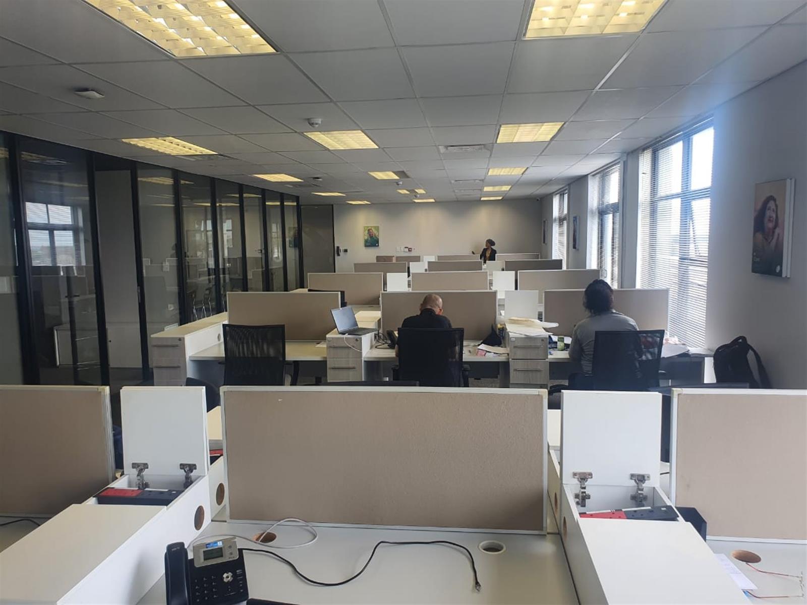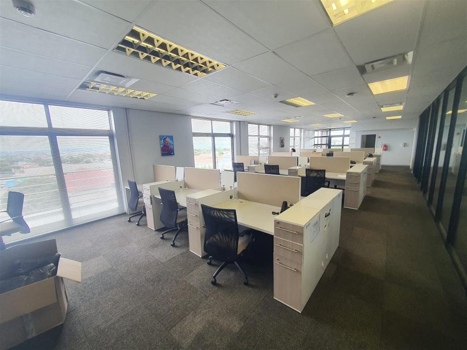 The suite features an open-plan air-conditioned reception area with a glass and aluminium boardroom, creating a striking first impression. A spacious open-plan office area allows for flexible workspace configurations, while high-quality finishes throughout reflect a contemporary corporate aesthetic.