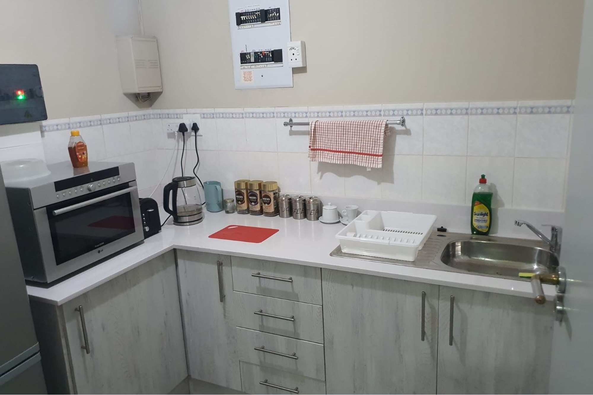The space features a large, modern air-conditioned reception area, eight individual air-conditioned offices, and two spacious open-plan areas suitable for team-based work. A well-appointed modern kitchen is included, while communal male and female ablutions are available on the same floor.