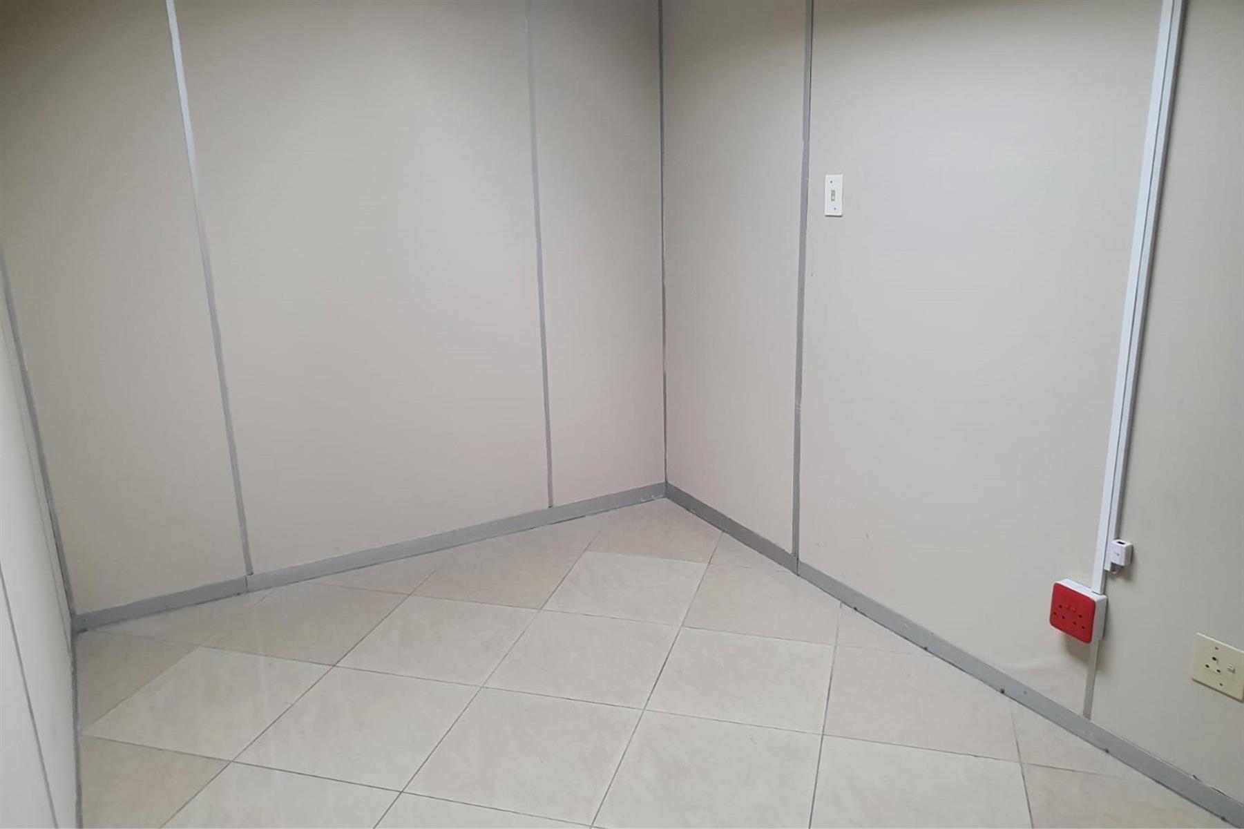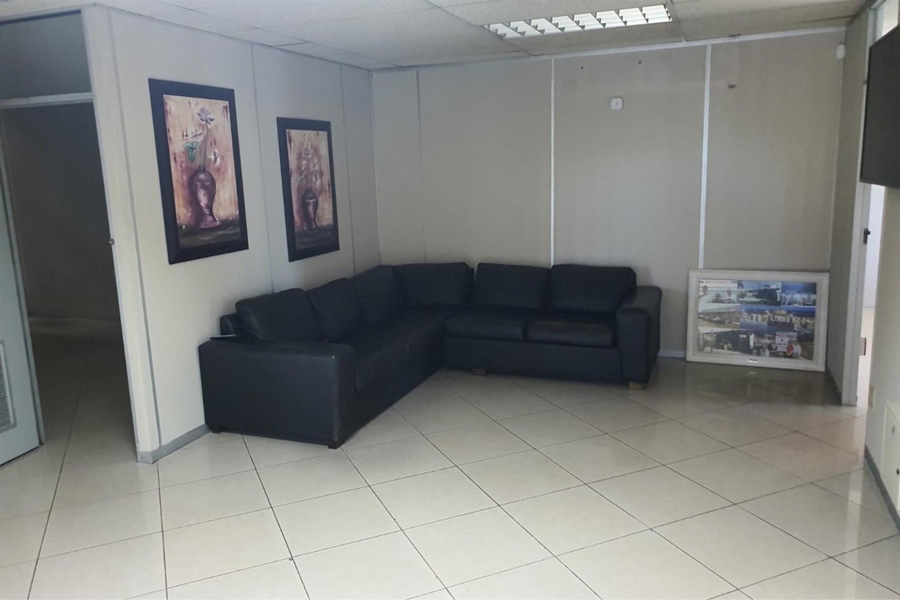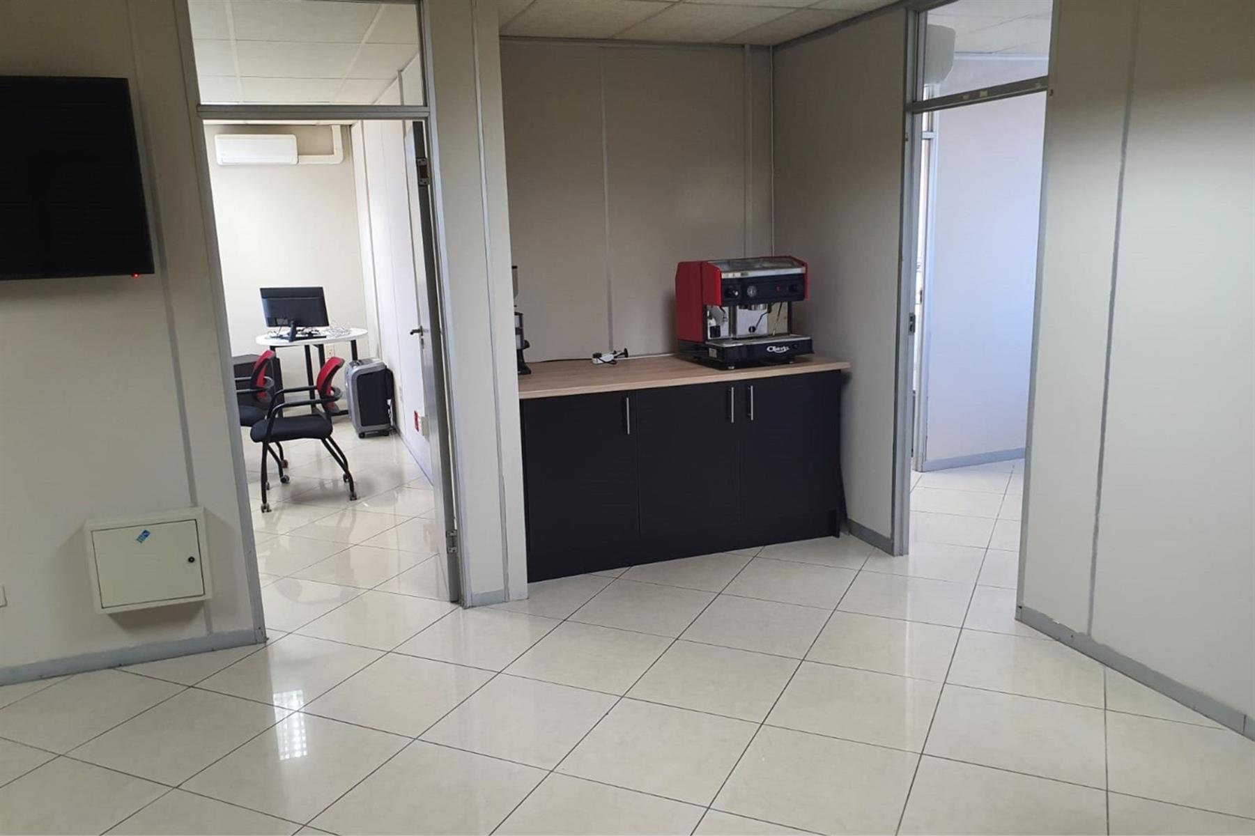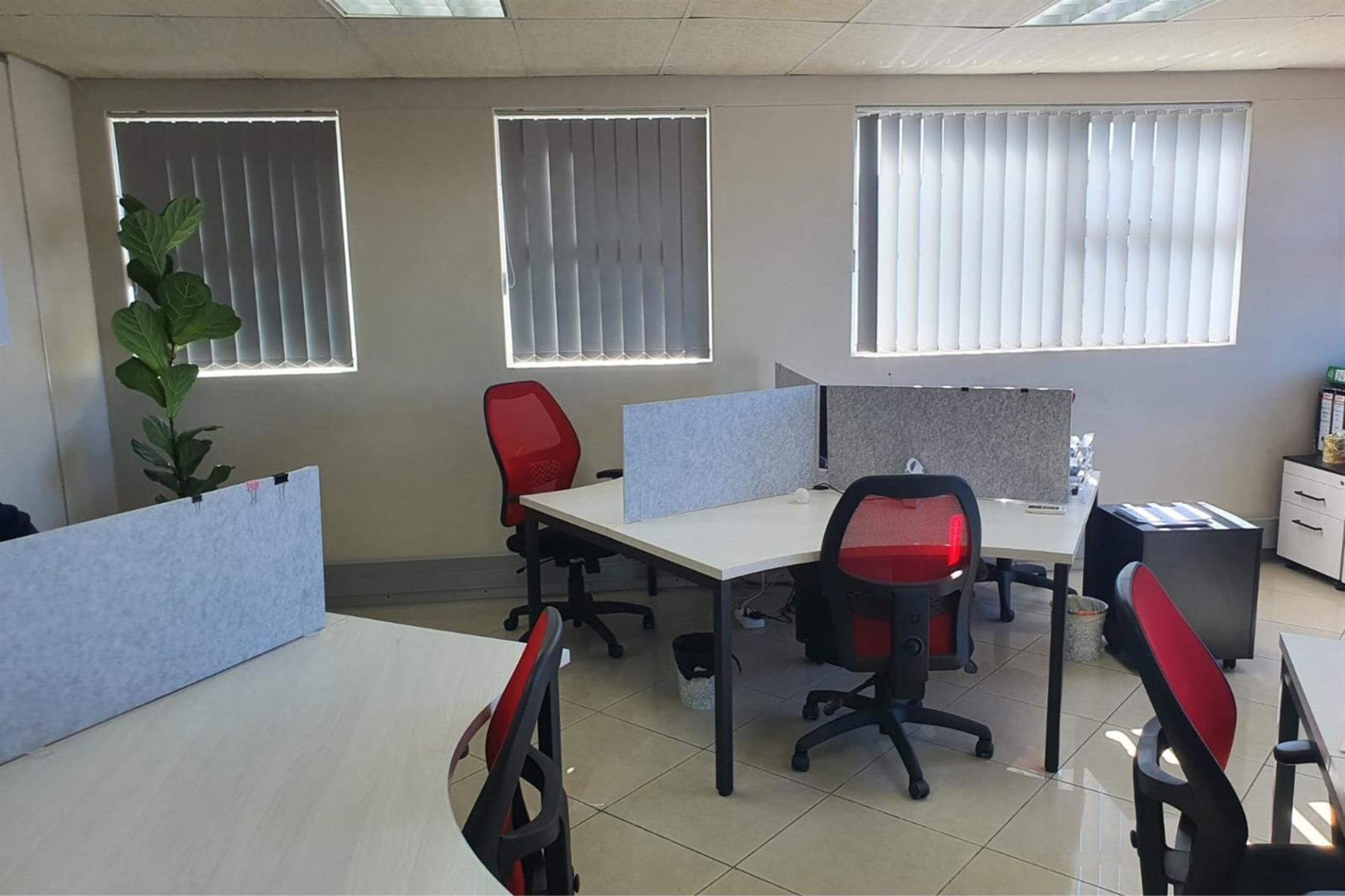 The space comprises a large modern air-conditioned reception area, eight individual air-conditioned offices, and two spacious open-plan areas ideal for team collaboration. A well-appointed modern kitchen adds to the functionality, while communal male and female ablutions are located on the same floor.