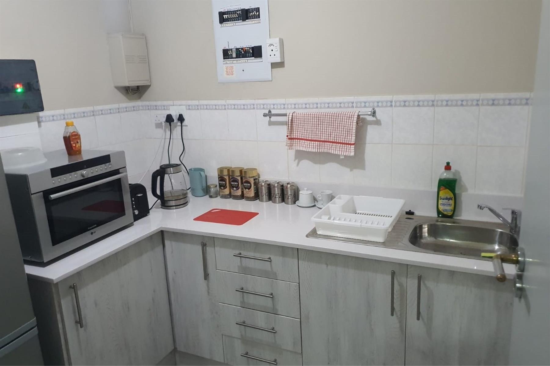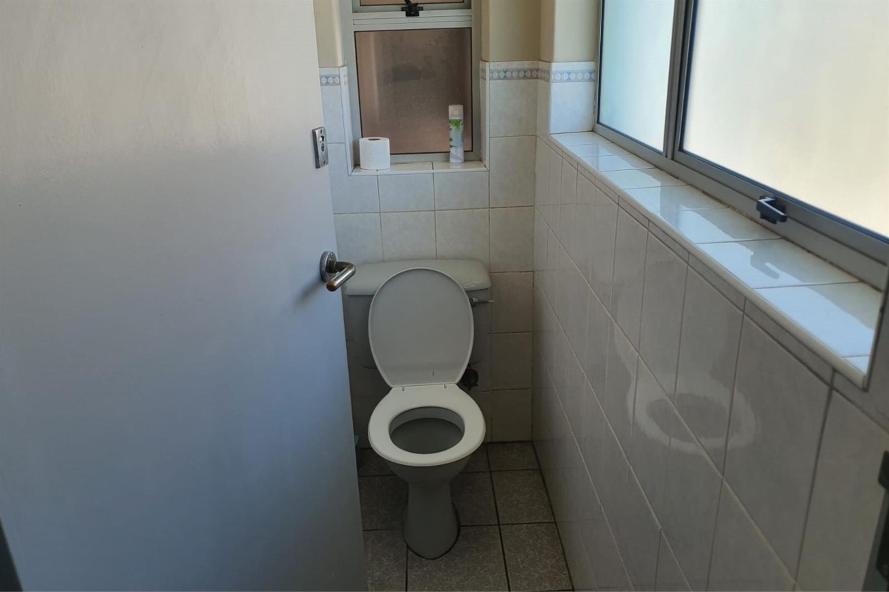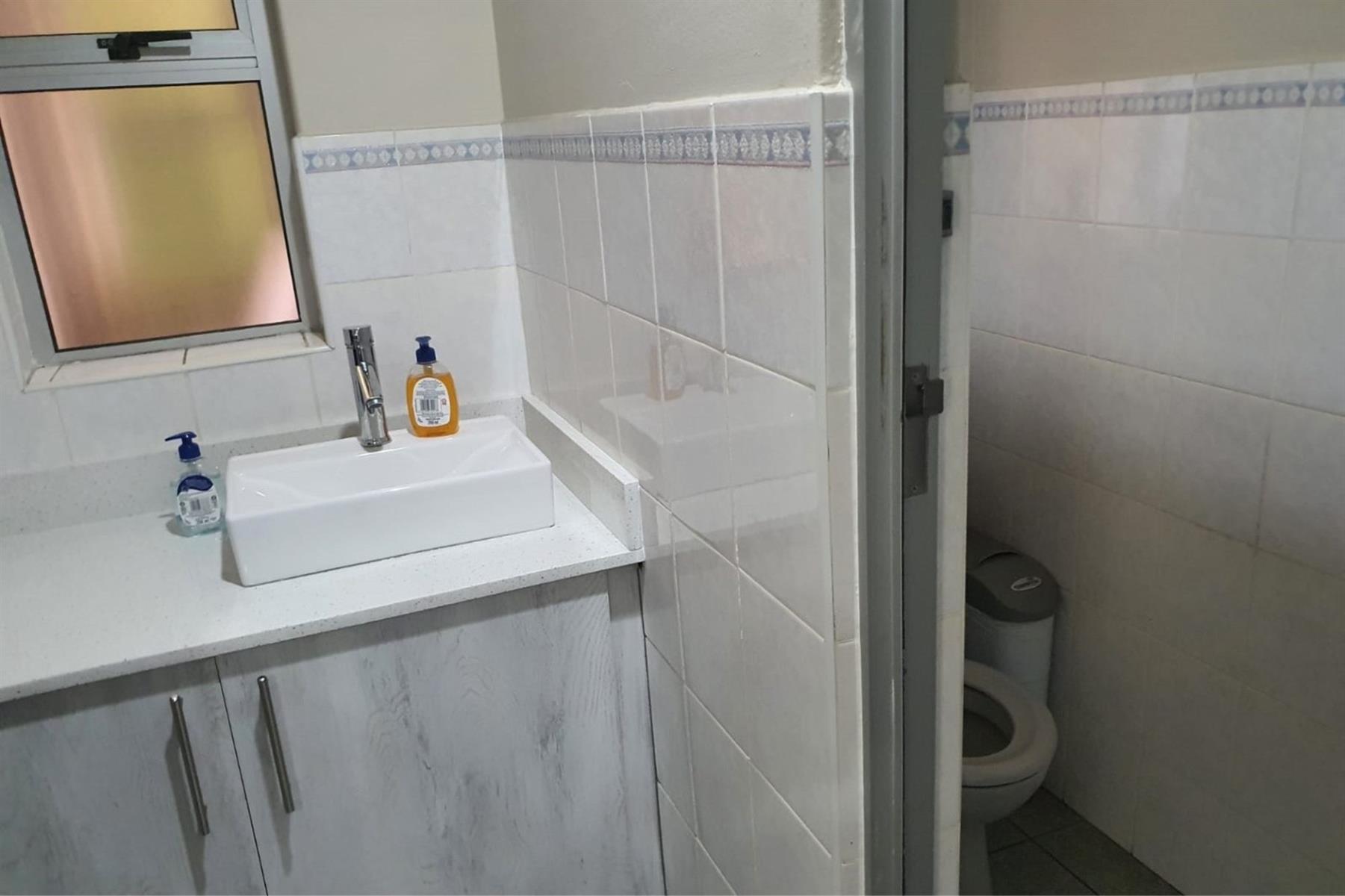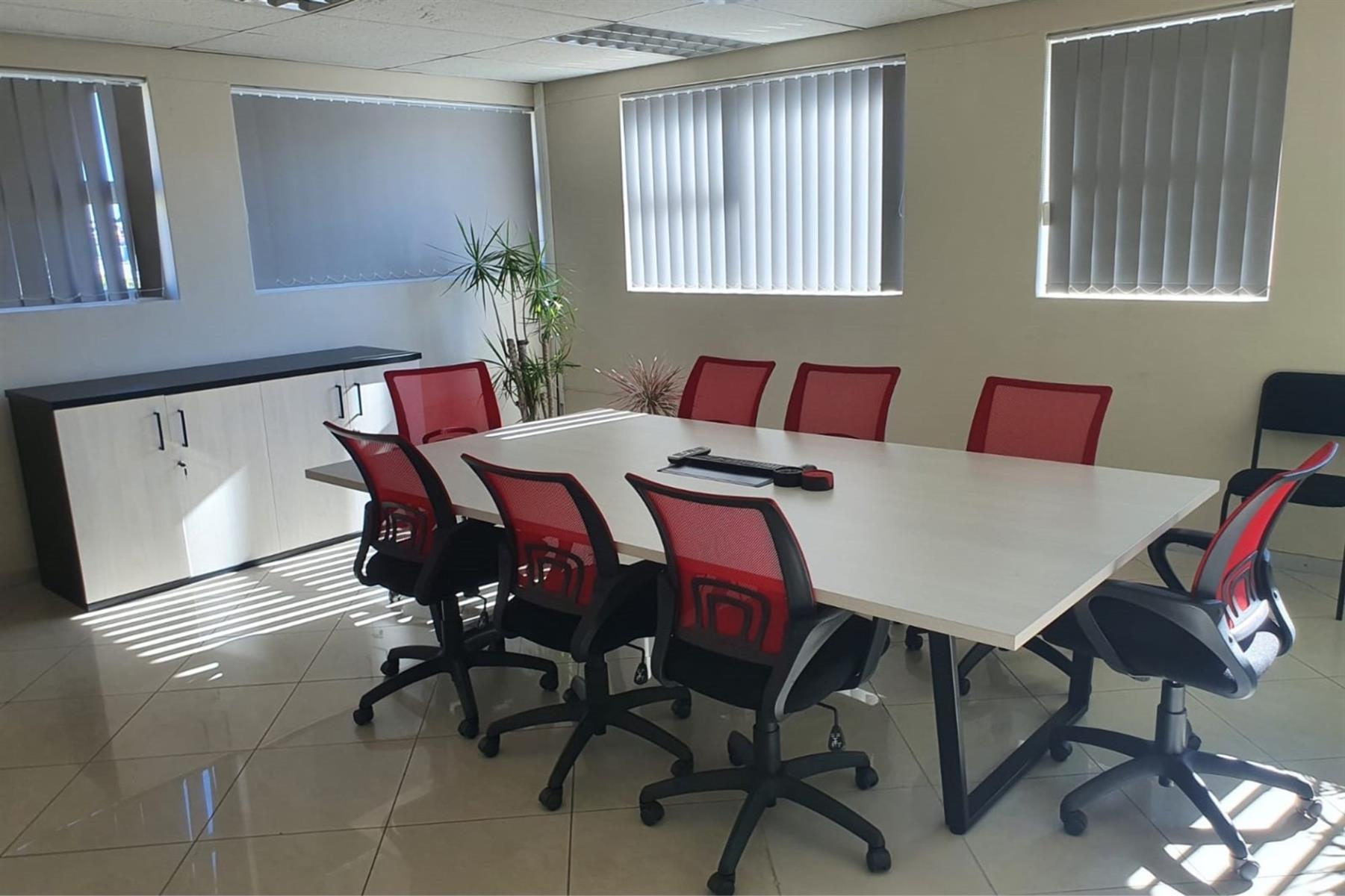 The space comprises a large modern air-conditioned reception area, eight individual air-conditioned offices, and two spacious open-plan areas ideal for team collaboration. A well-appointed modern kitchen adds to the functionality, while communal male and female ablutions are located on the same floor.