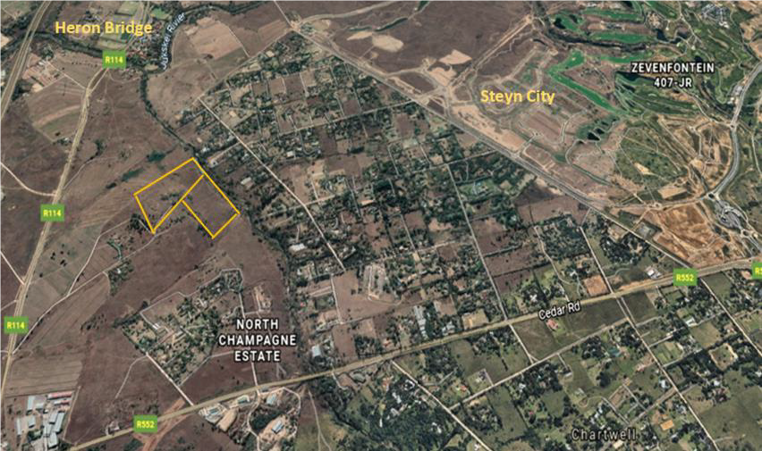 The two neighboring parcels in Nietgedacht encompass a total of 17.29 hectares. While the zoning remains undetermined, these sites are also situated within the Lanseria Megacity Development Framework. For your reference, I have included an image illustrating the combined properties.